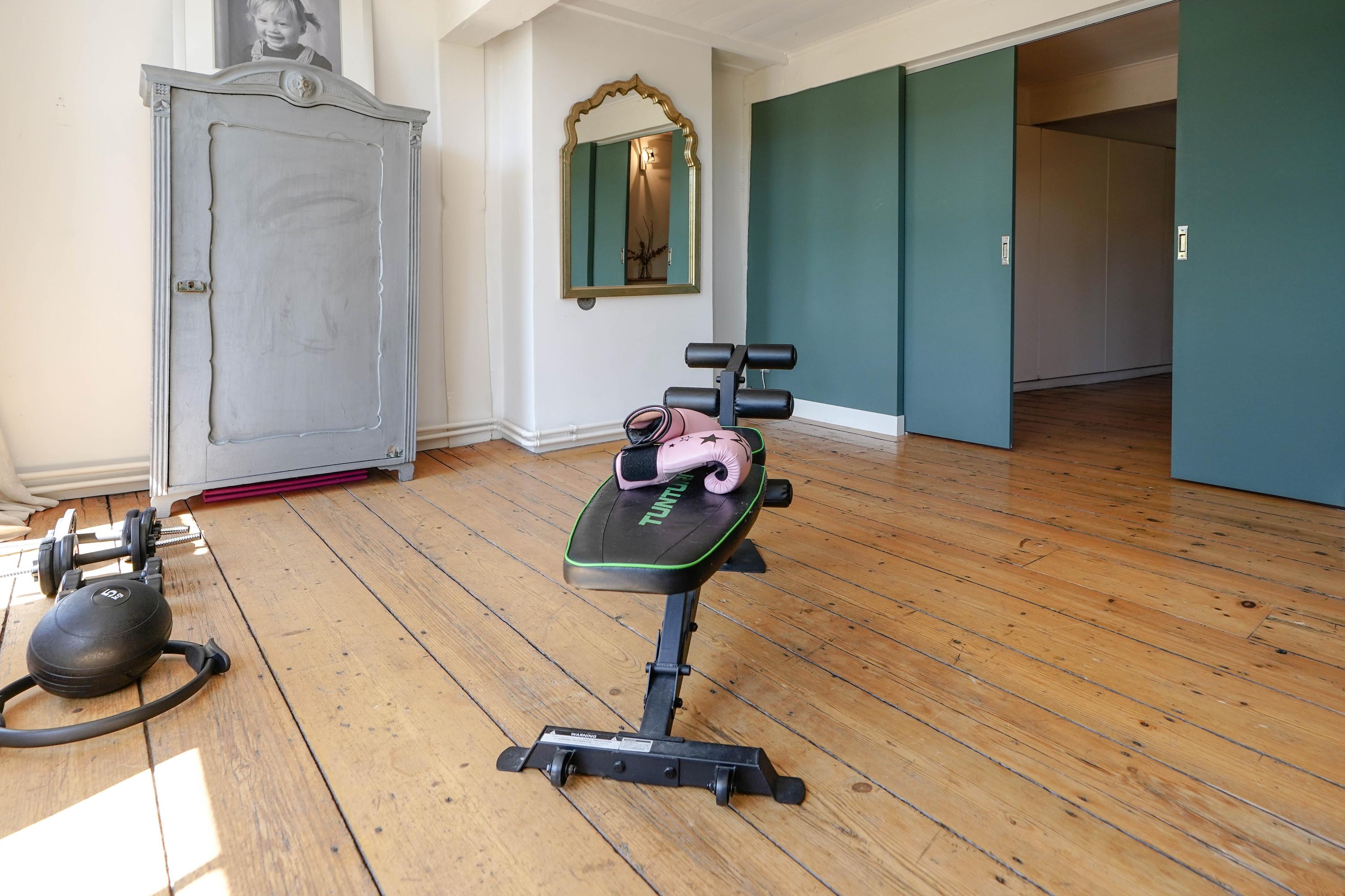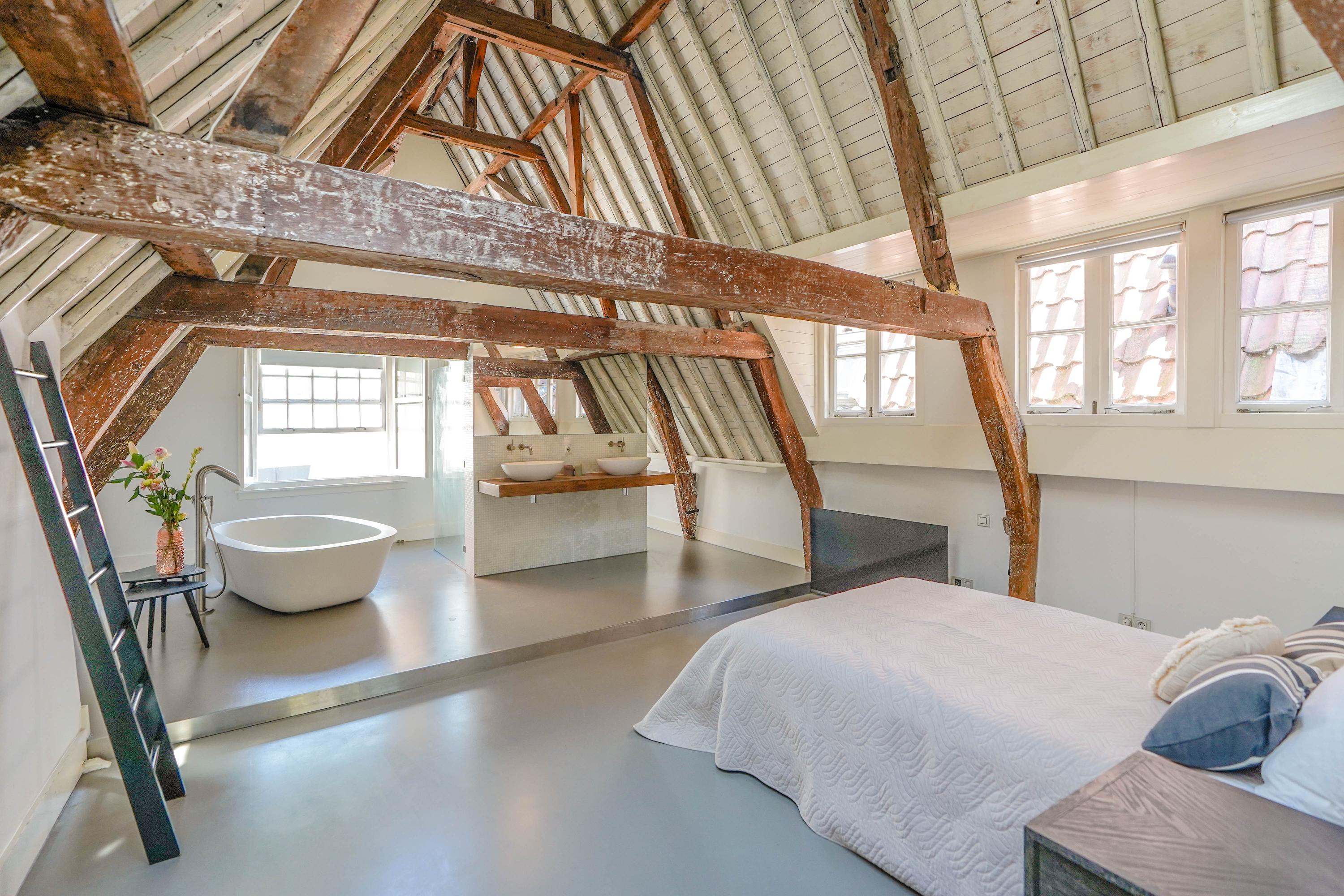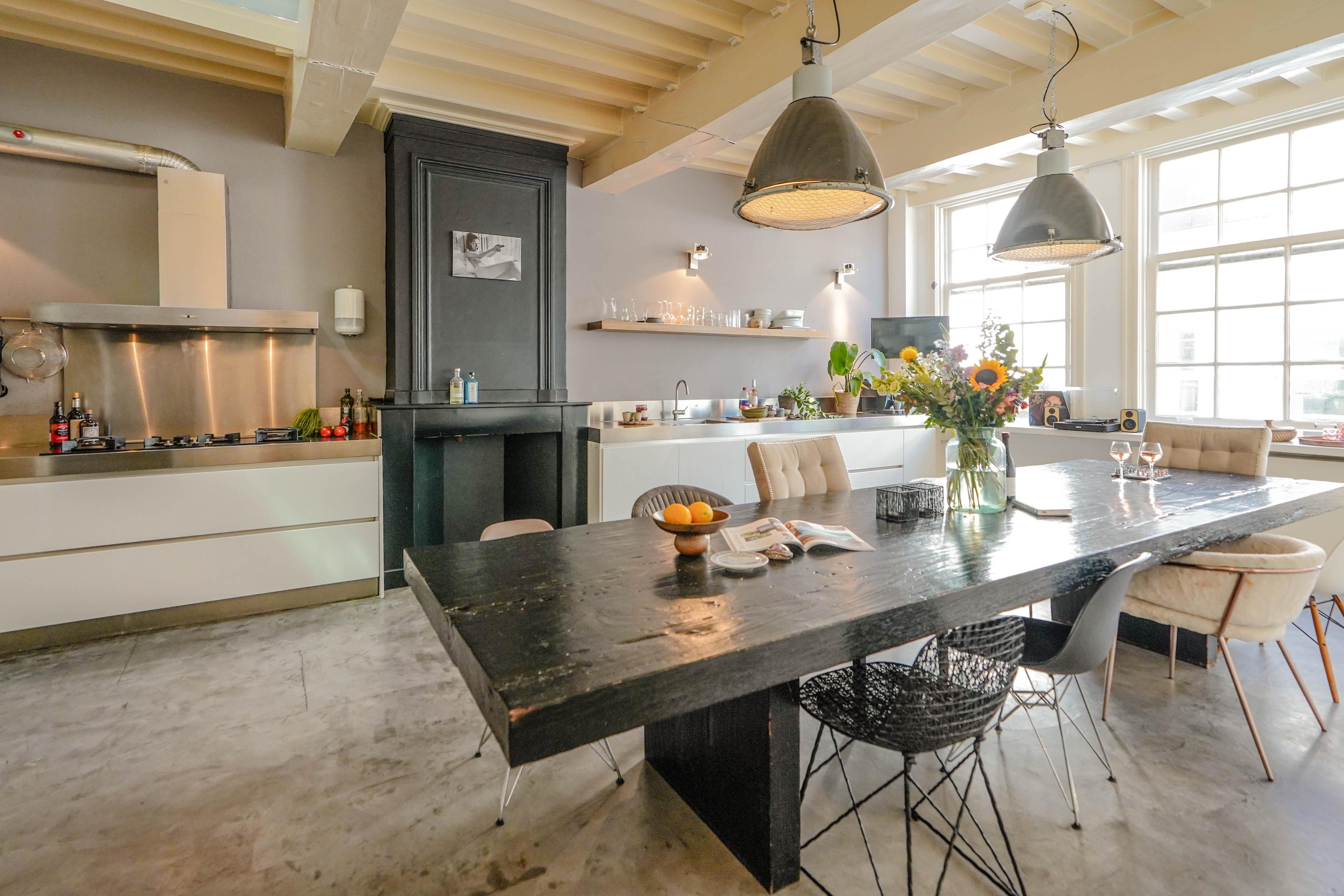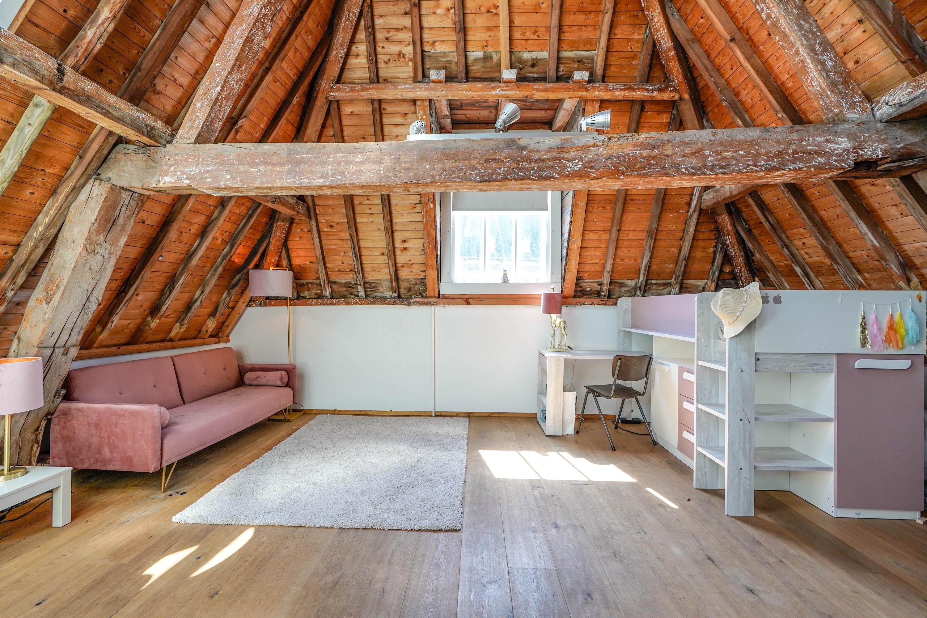 The front house is the original main house. The ground floor houses a shop (which is also available for purchase), and the first floor now houses the 70 m² living room, which overlooks the Rhine and Stadhuisplein. At the rear is the kitchen/diner with space. A lot of space. With 50 m², long worktops and a dining table that seats 12, this is now the heart of the house. From here there is also one of the passages to the back house along the courtyard, which provides a lot of light. The sleeping floors are one floor higher. Here the house has been peeled back to the structure with the beautiful wooden siding roof in full view. High Velux windows have been installed between the tracks, providing beautiful light at any time of the day. At the front you will find three bedrooms, a bathroom and, above all, plenty of storage space with fitted wardrobes and a linen room, spread over two floors. At the rear, the master bedroom with ensuite bathroom covers the entire roof with a ridge of no less than 8 meters high.