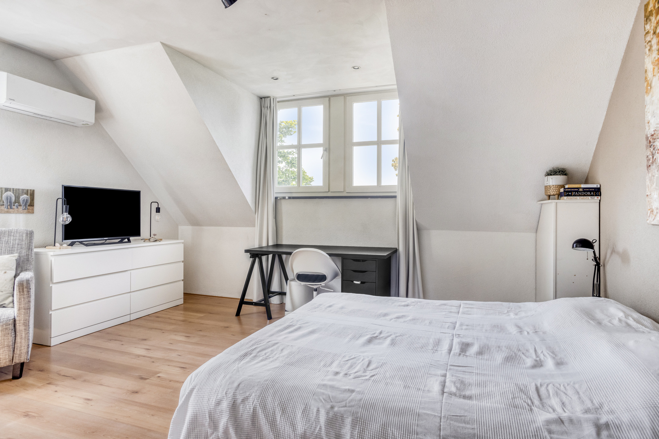 slaapkamer links achter (ca. 16,5 m²) met een dakkapel en airco-installatie, wandafwerking sierpleister, vloer afgewerkt met laminaat, schuurwerk plafond;