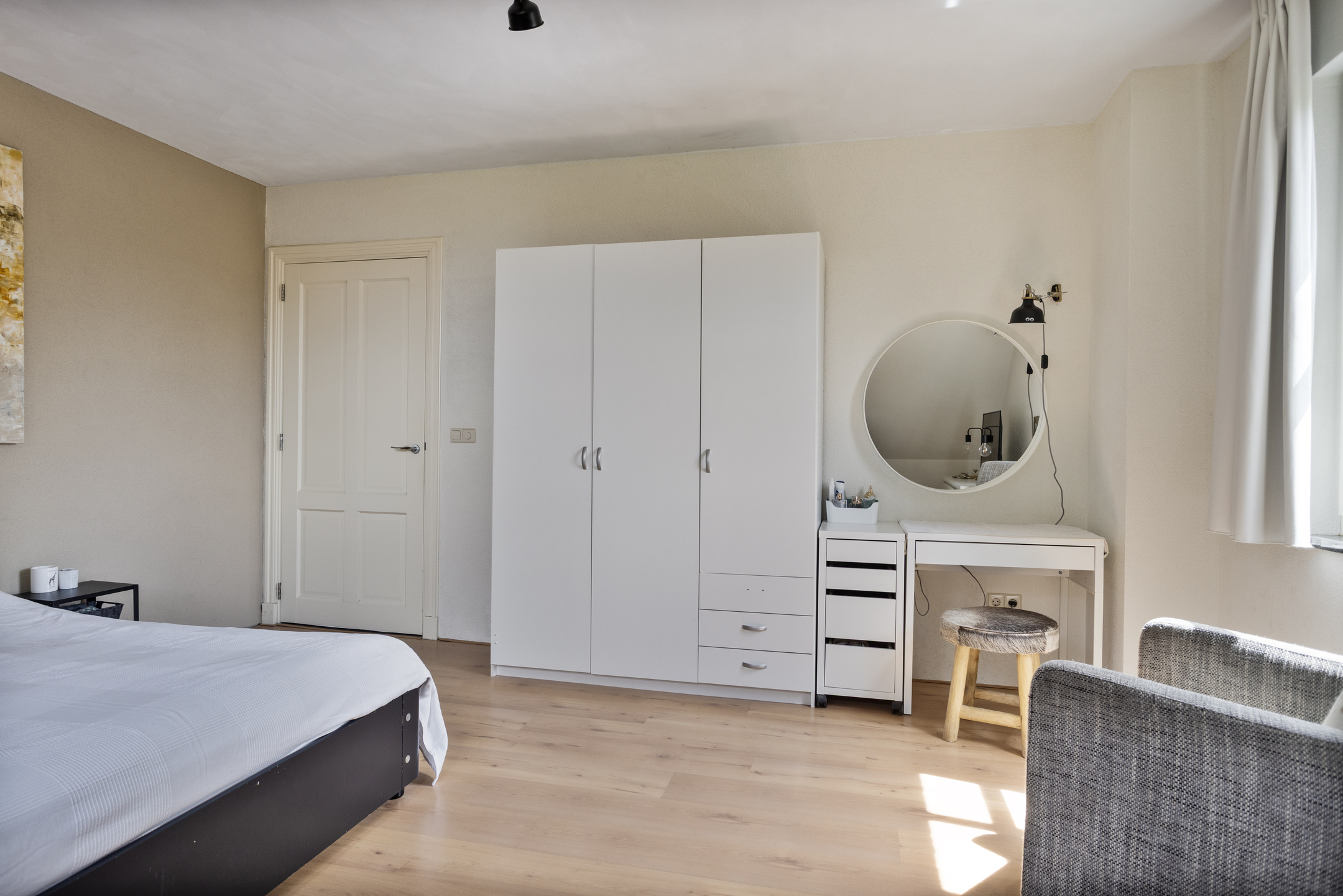 slaapkamer links voor (ca. 16 m²) met airco-installatie, wandafwerking sierpleister en stucwerk, vloer afgewerkt met laminaat, schuurwerk plafond;