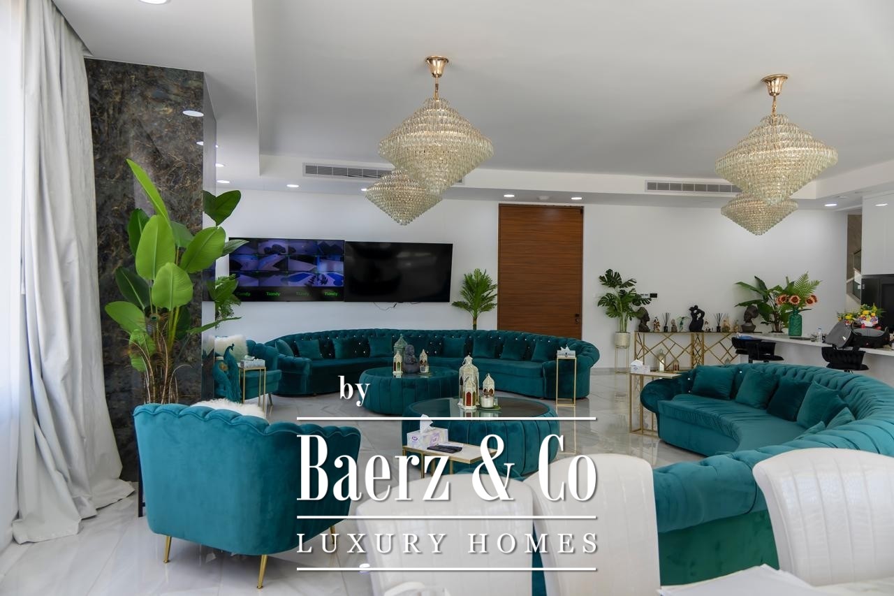 Crafted with elevated ceilings and fluid spatial transitions, the villa is arranged across two principal floors plus a full basement. Seven bedrooms are distributed for privacy and comfort, with five en-suite master suites, a guest room and separate housekeeper’s accommodation. Living spaces are defined by natural light and curated furnishings, underscored by premium finishes and a purposeful layout. Integrated smart home automation, underfloor heating and a VRV climate control system approach modern convenience with understated precision. A private cinema room and full CCTV security further express a discreet take on elite living.