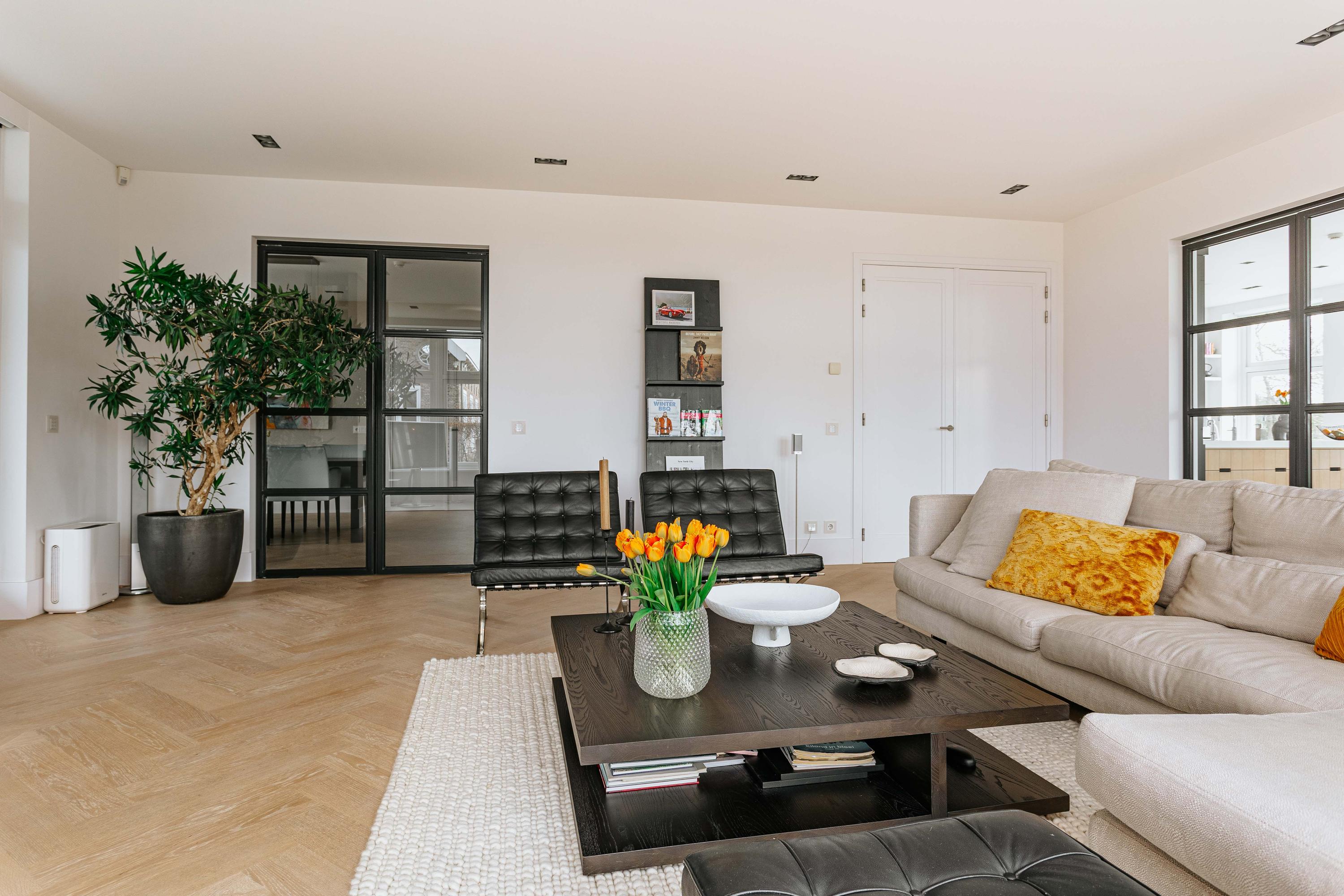 At the front of the house is the large luxury kitchen, equipped with a sink island and luxury built-in appliances, a gas fireplace, and French doors to the terrace. The large, cozy living room also has a gas fireplace, French doors to the terrace, and access to the kitchen and the spacious, cozy dining room through steel revolving doors. Hidden behind a door in the hall is the luxurious trio of bedroom, dressing room, and bathroom. This spacious master bedroom with gas fireplace overlooks and has access to the garden. There is also a separate toilet.