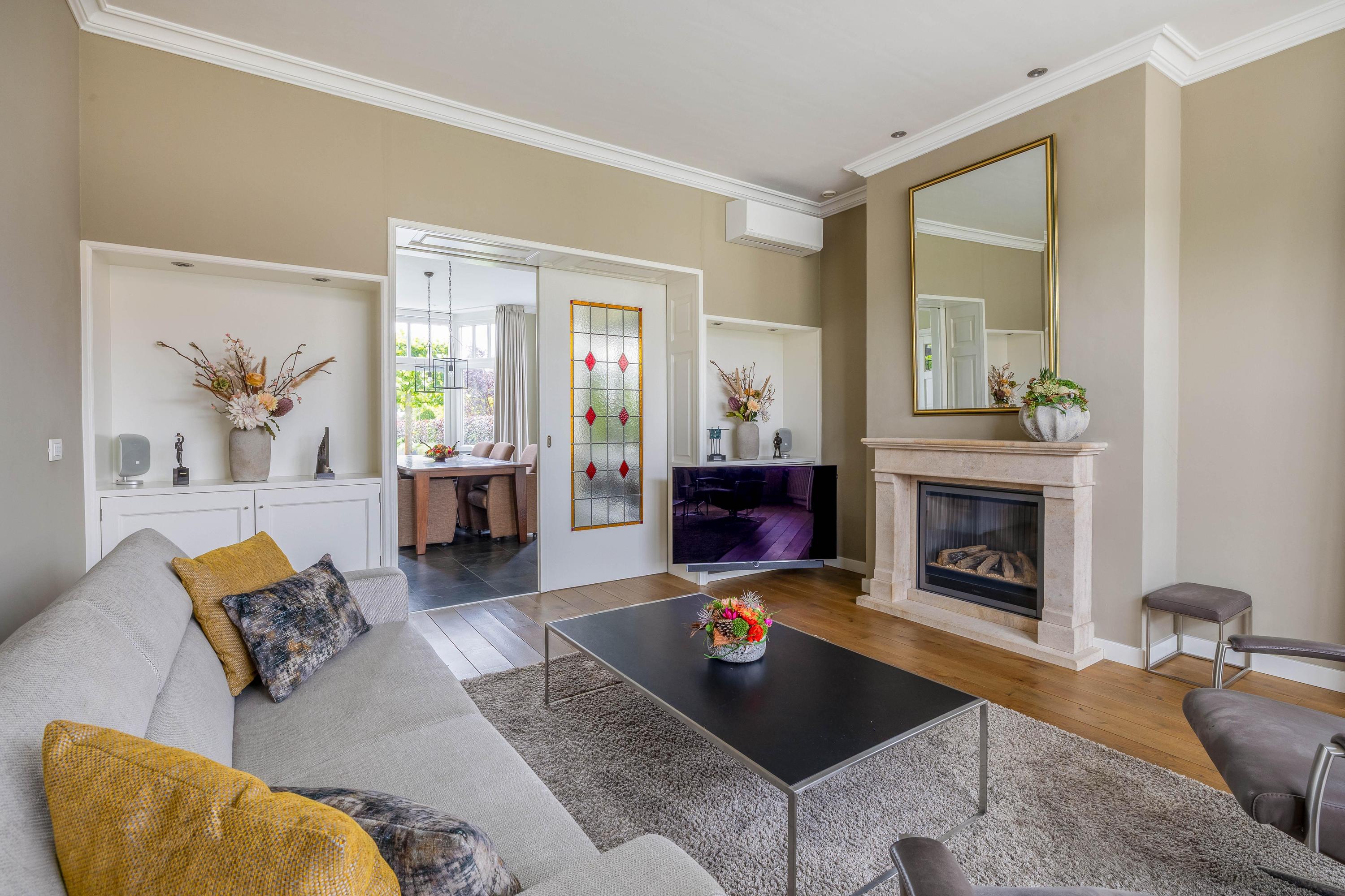 The light-filled living room features a wooden floor in the front section. The bay window provides a view of the front garden. This area also includes a beautiful gas fireplace, air conditioning, and two wall cupboards. The stunning en-suite doors with stained glass lead to the dining room, which has a tiled floor and an additional wall cupboard. French doors provide access to the garden. The living room measures approximately 53 m².