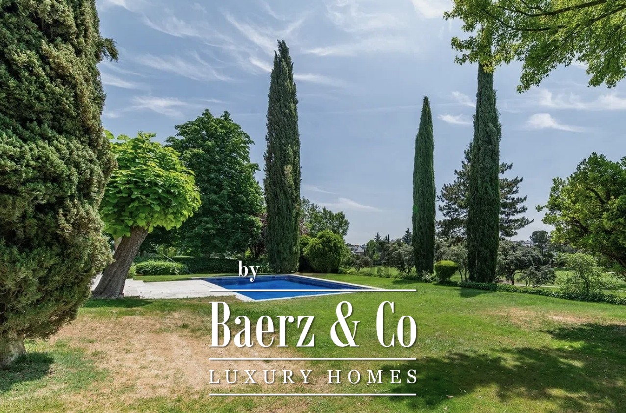 Outside, mature landscaped gardens frame a private swimming pool and a paddle tennis court, creating a tranquil environment tailored for relaxation and leisure. The villa is located in one of Madrid’s most prestigious and secure residential enclaves, offering convenient access to the city while maintaining a serene golf-facing retreat. This property embodies the rare opportunity to craft a bespoke home with enduring value in La Moraleja.