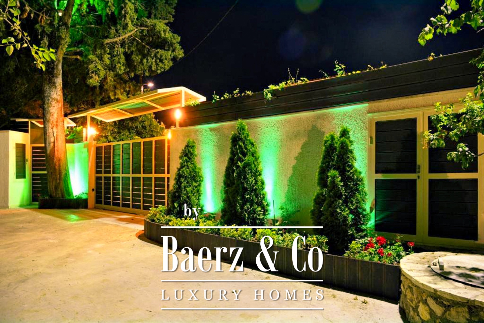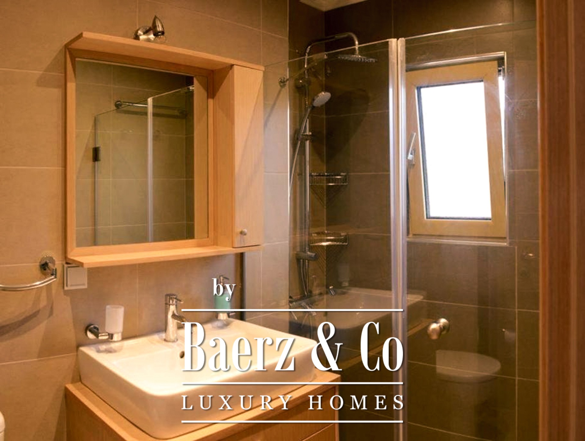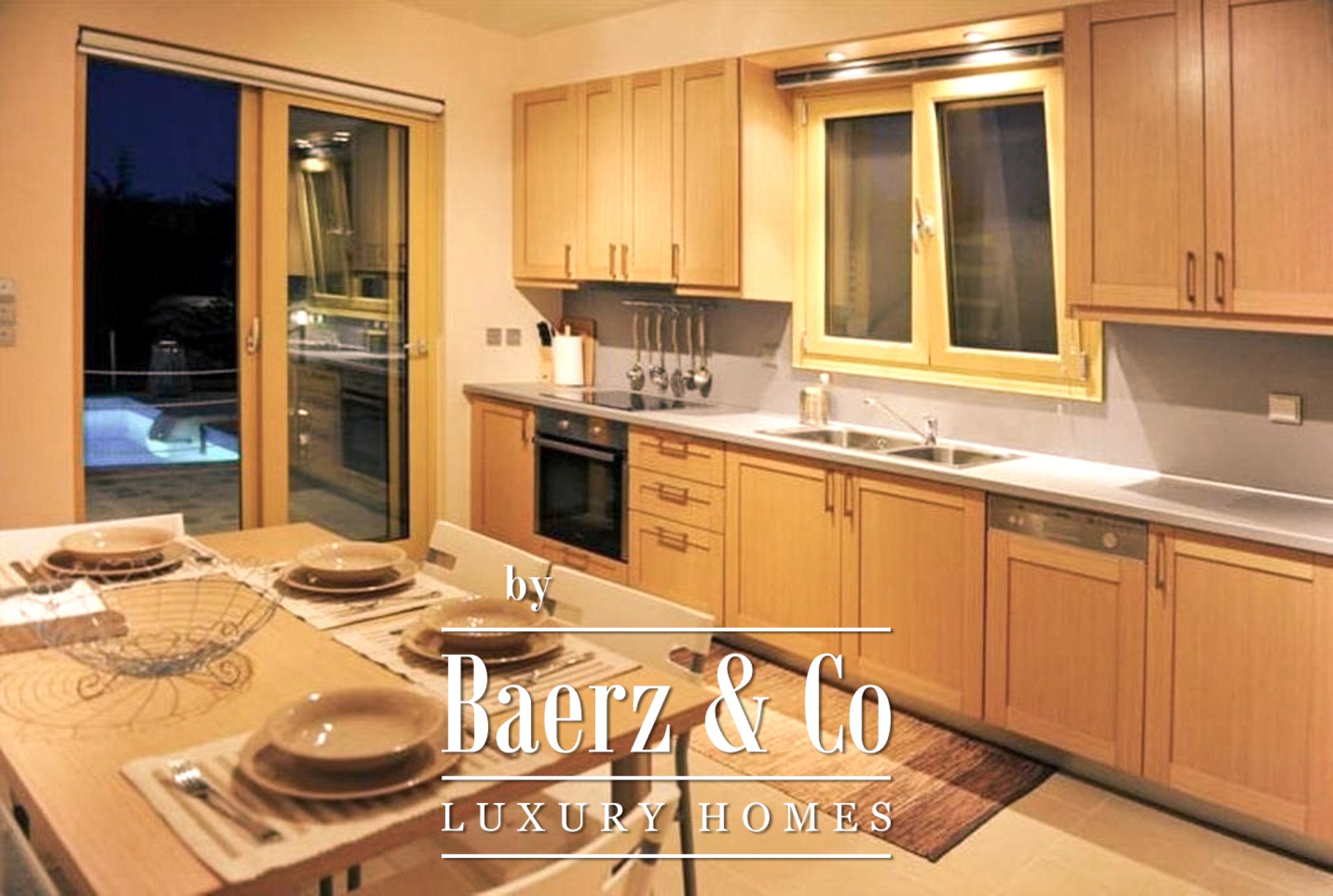 Quality is evident in every detail, from the tiled roof and 10 cm insulation to double glazed thermal break aluminum frames and comprehensive sound insulation. Climate control is ensured with autonomous oil heating, air conditioning, solar water heating, and radiator systems. Security features include a security door, CCTV, security alarm, security cameras, fire extinguishers, and a smoke detector.