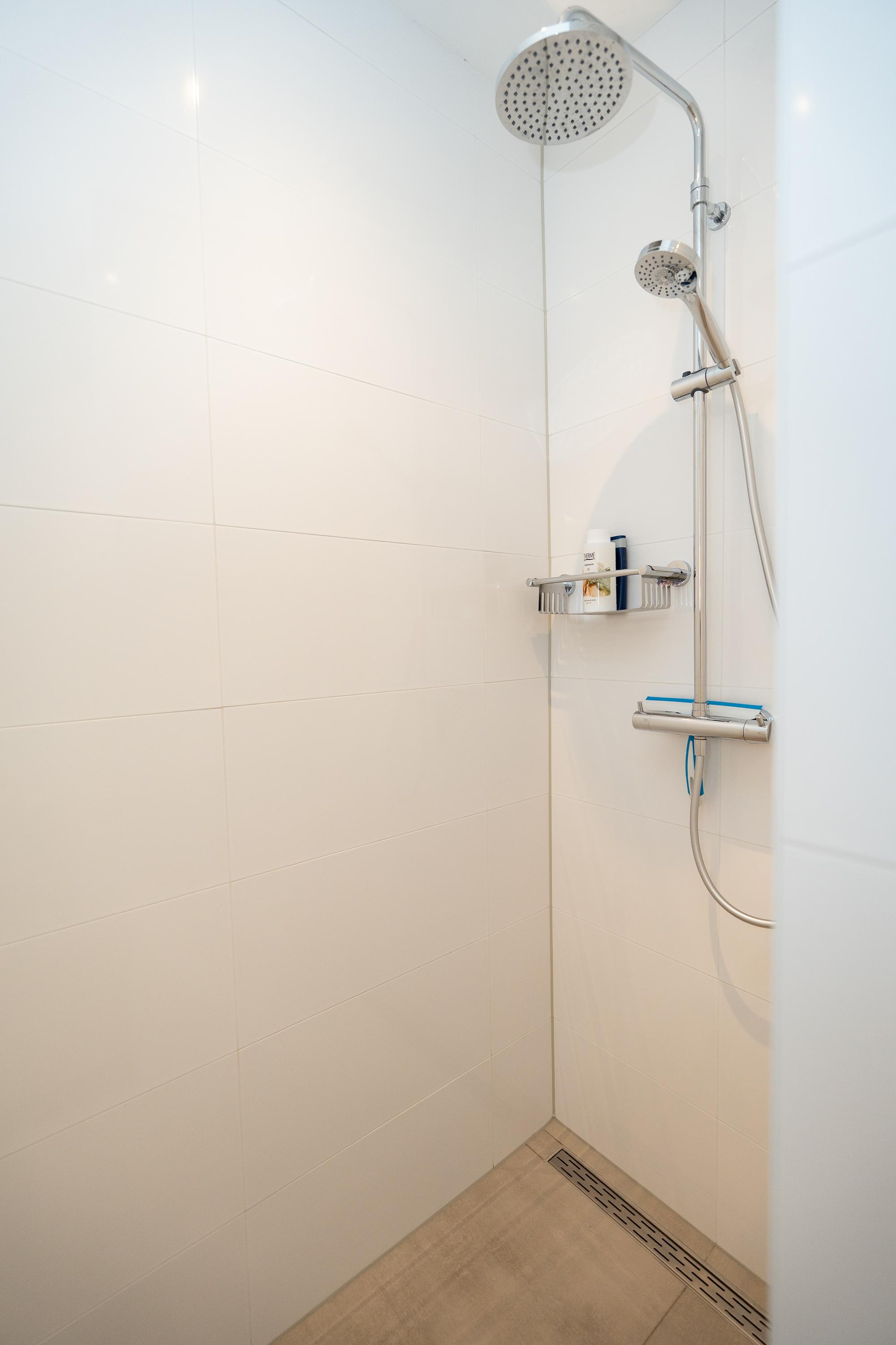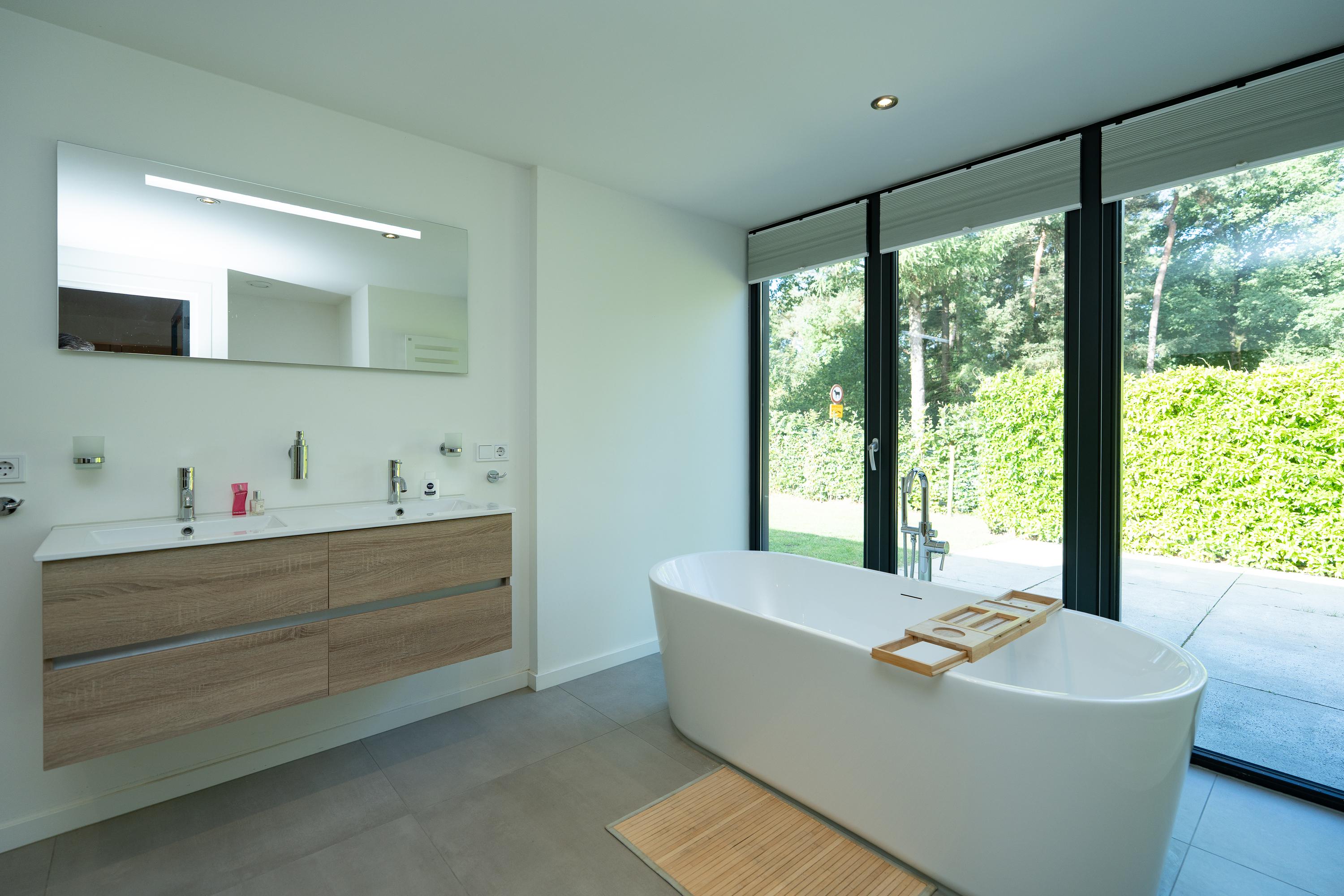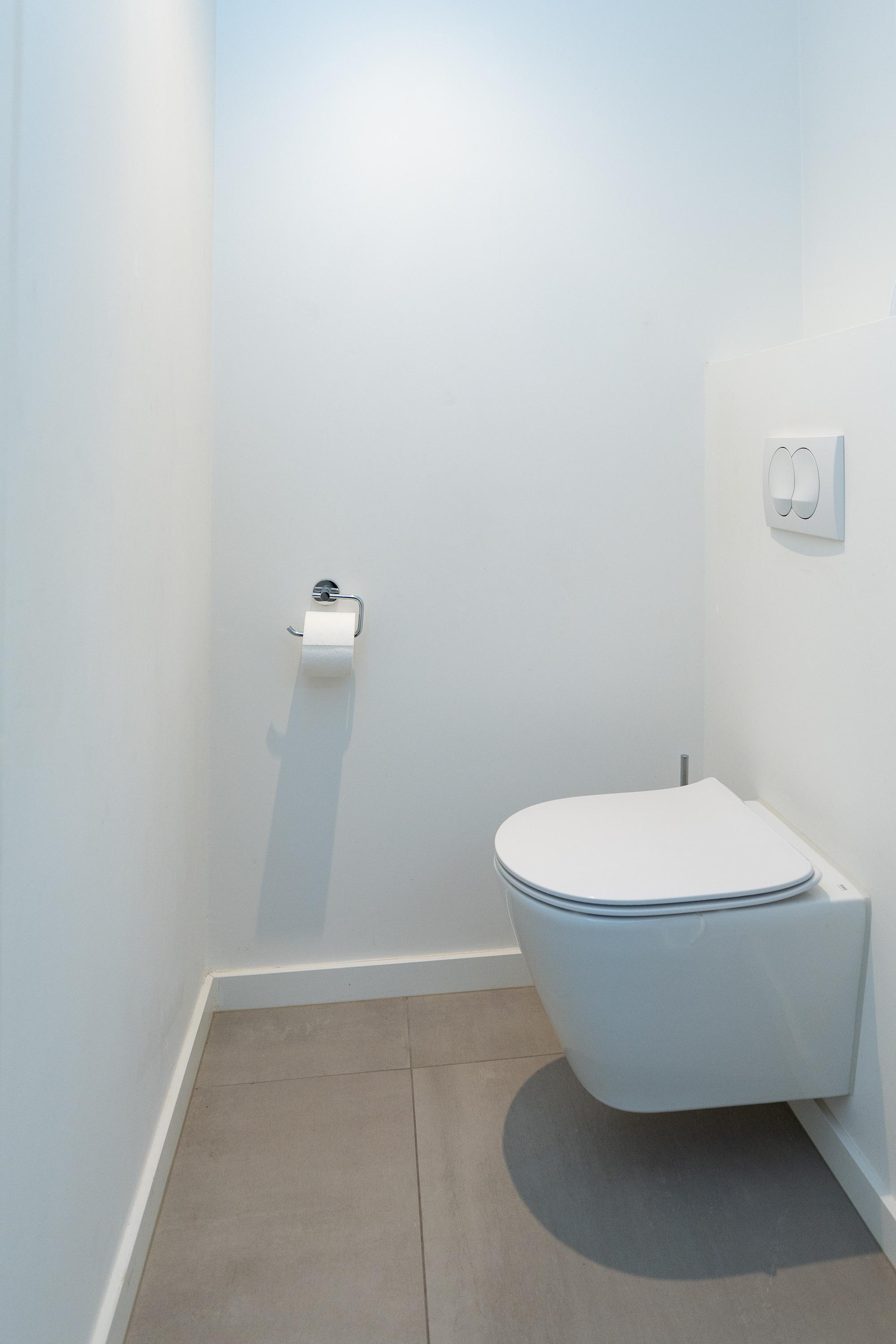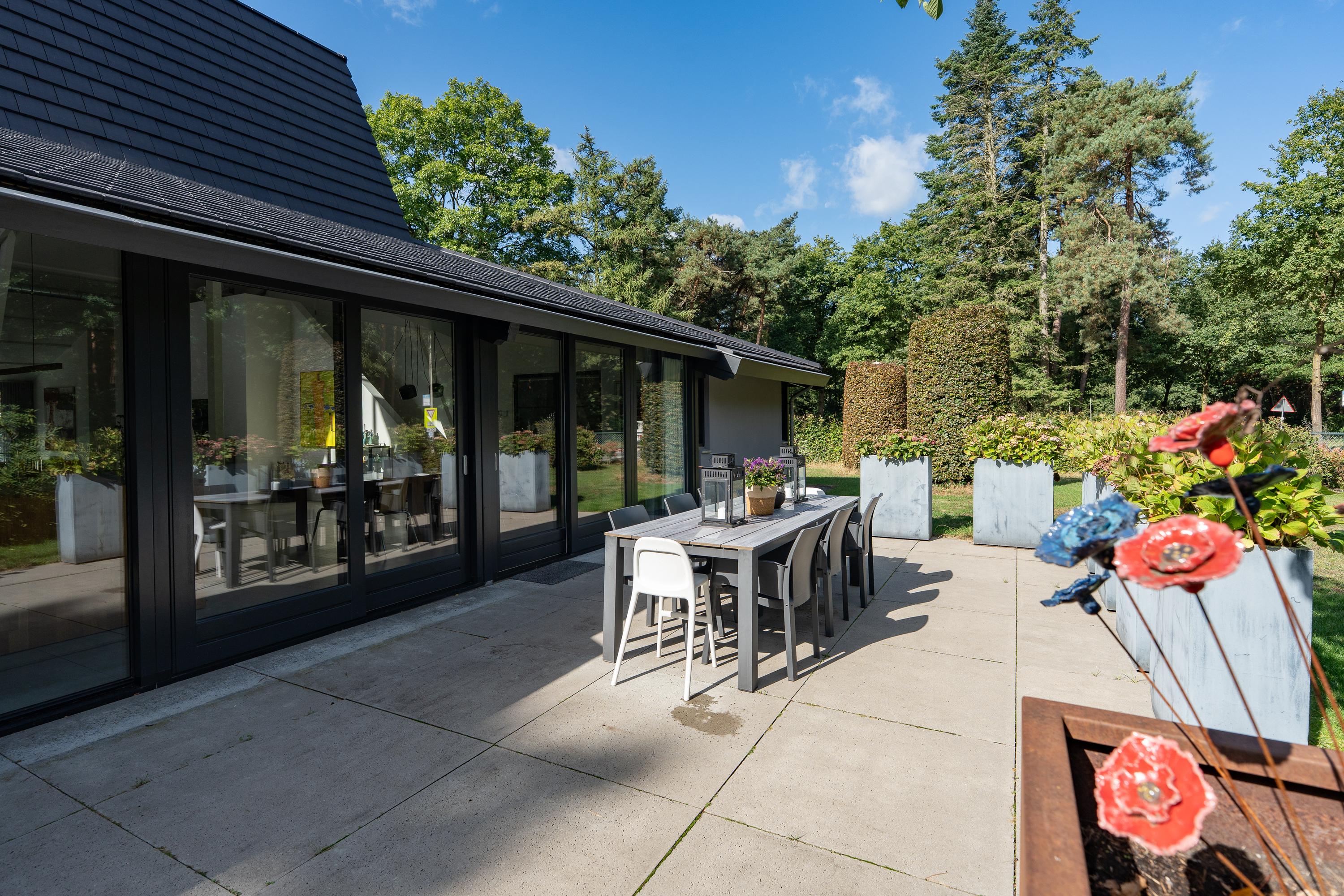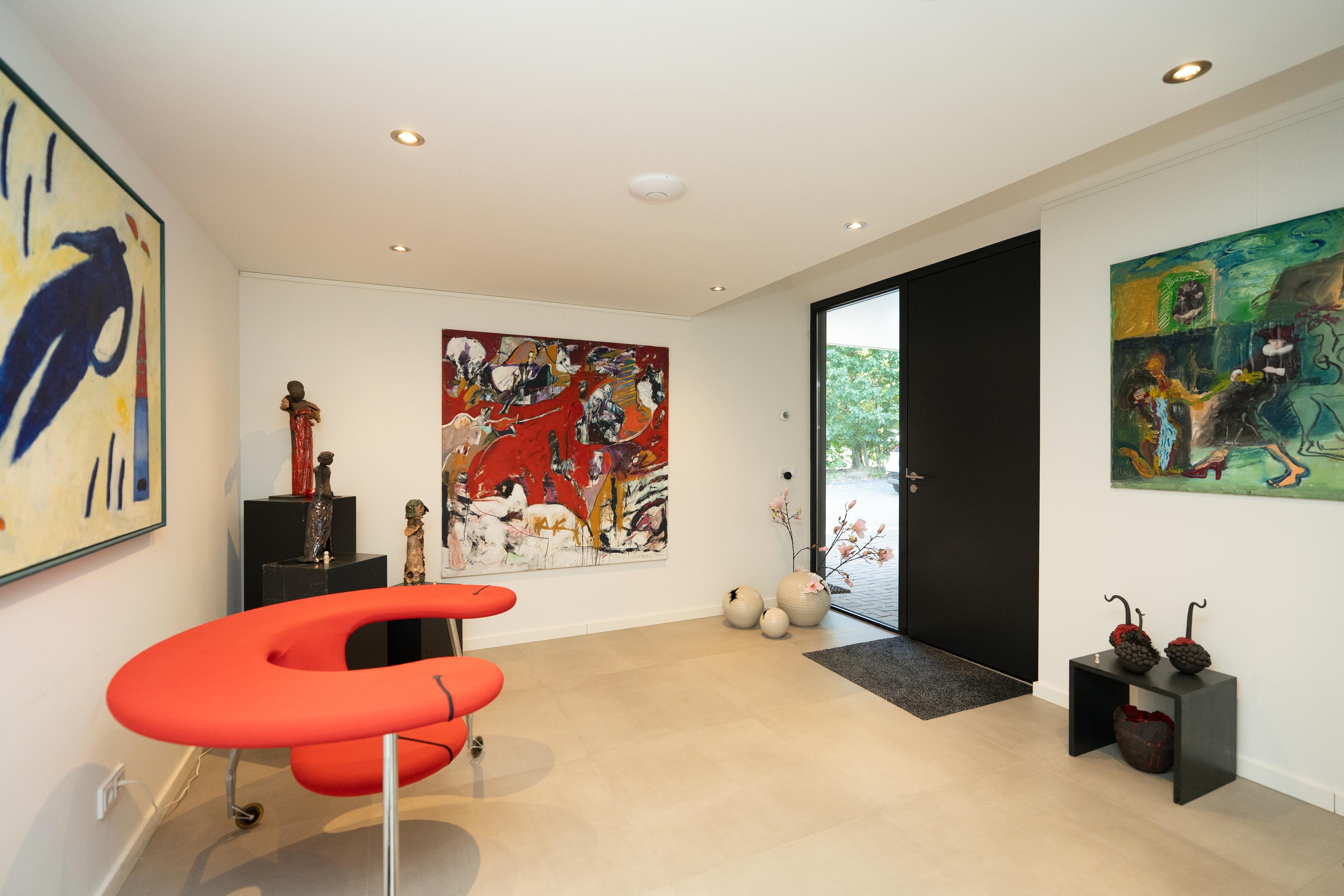 Entrance hall, spacious hall that immediately emphasises the spacious character of the house. The hall contains the meter cupboard, loft and the first toilet with washbasin. A spacious living room with high ceiling, where the many windows on all sides provide beautiful light and an open atmosphere. There are sliding doors to the front and back gardens at both the front and rear. There is also a spacious indoor storage room under the stairs and the staircase itself is beautifully concealed. Modern open kitchen with a large cooking island. The tall cabinets are beautifully concealed in the wall and the kitchen is equipped with various luxury built-in appliances. The utility room is located at the front of the house and has a kitchen unit, heat pump and boiler, and an extra outside door.