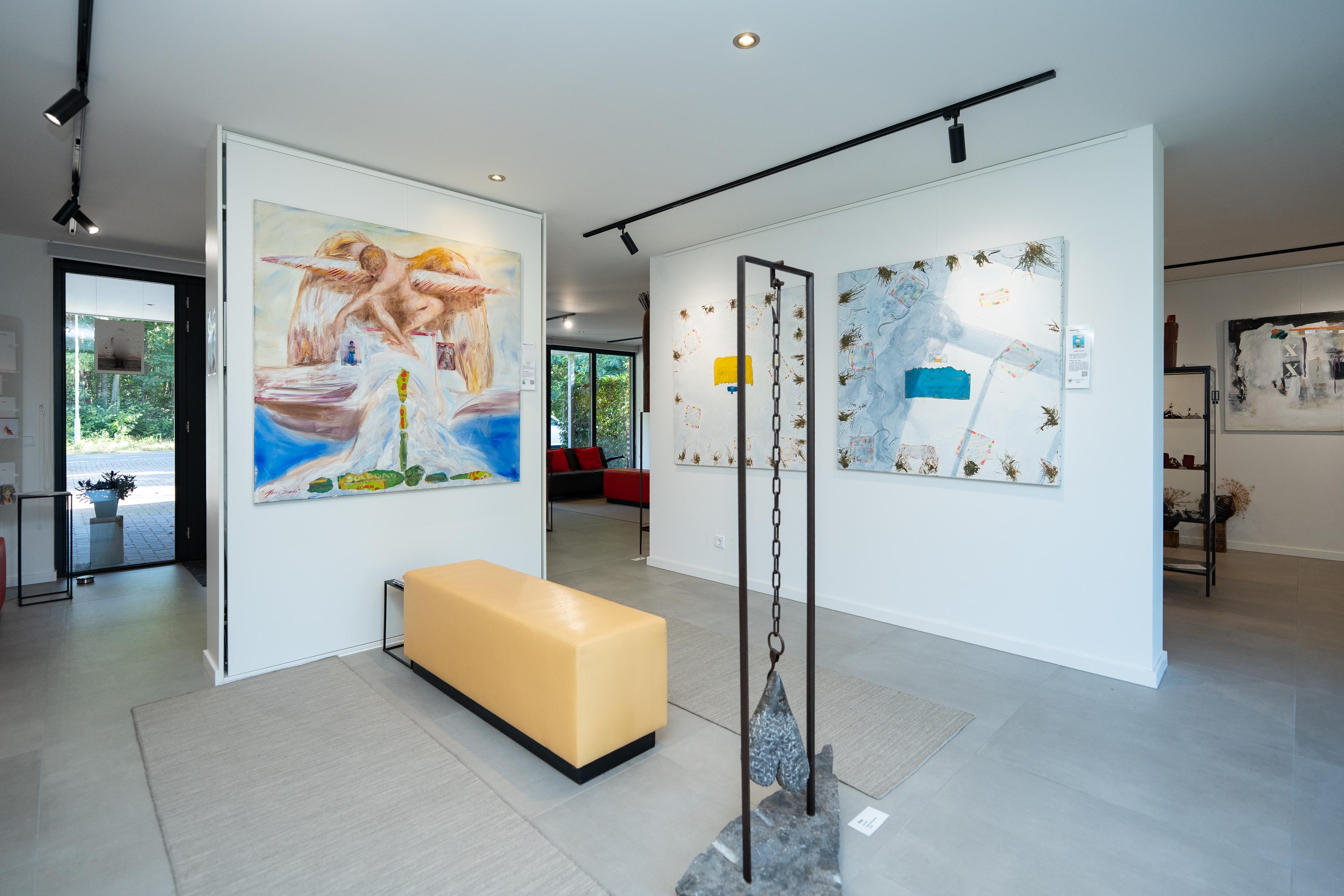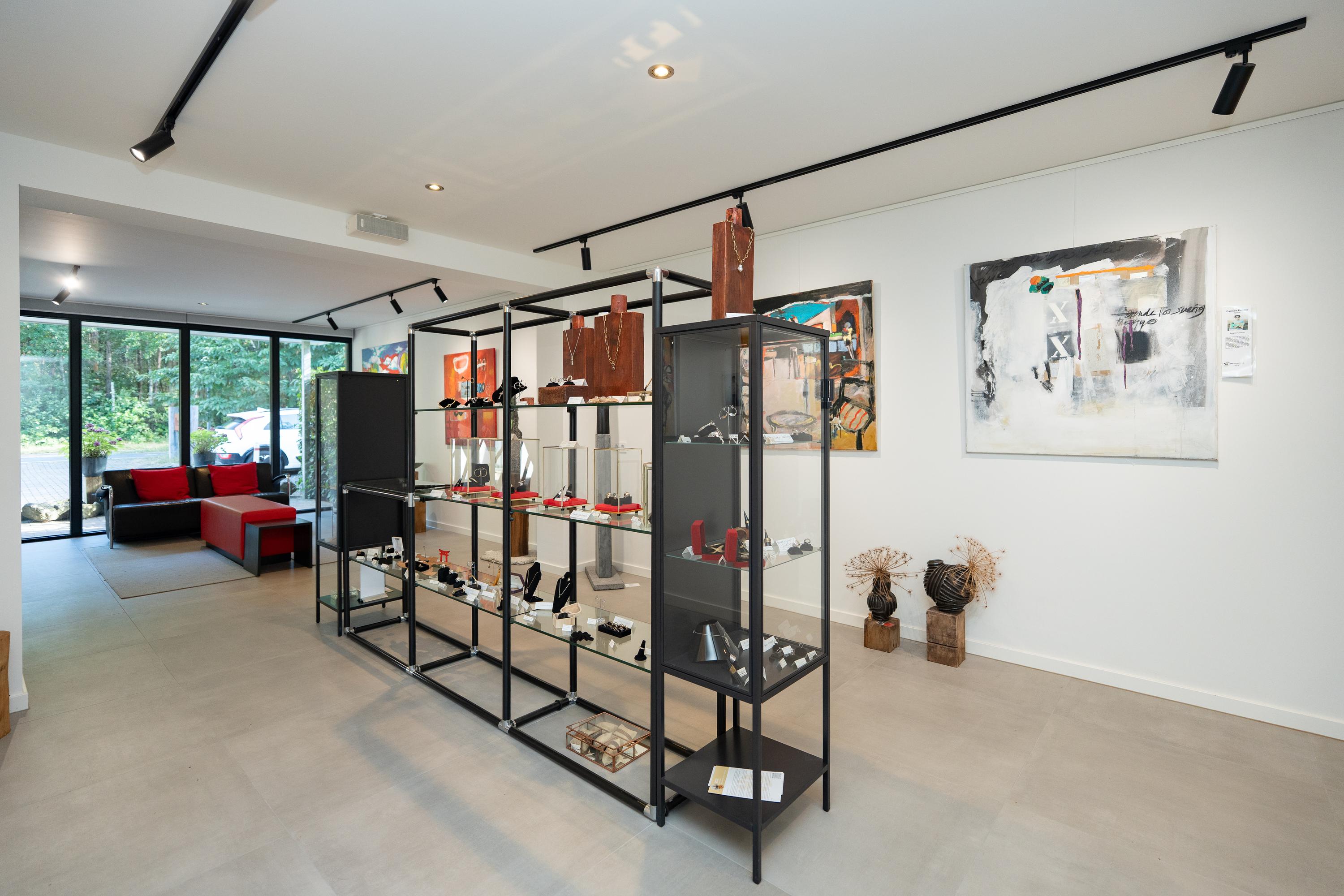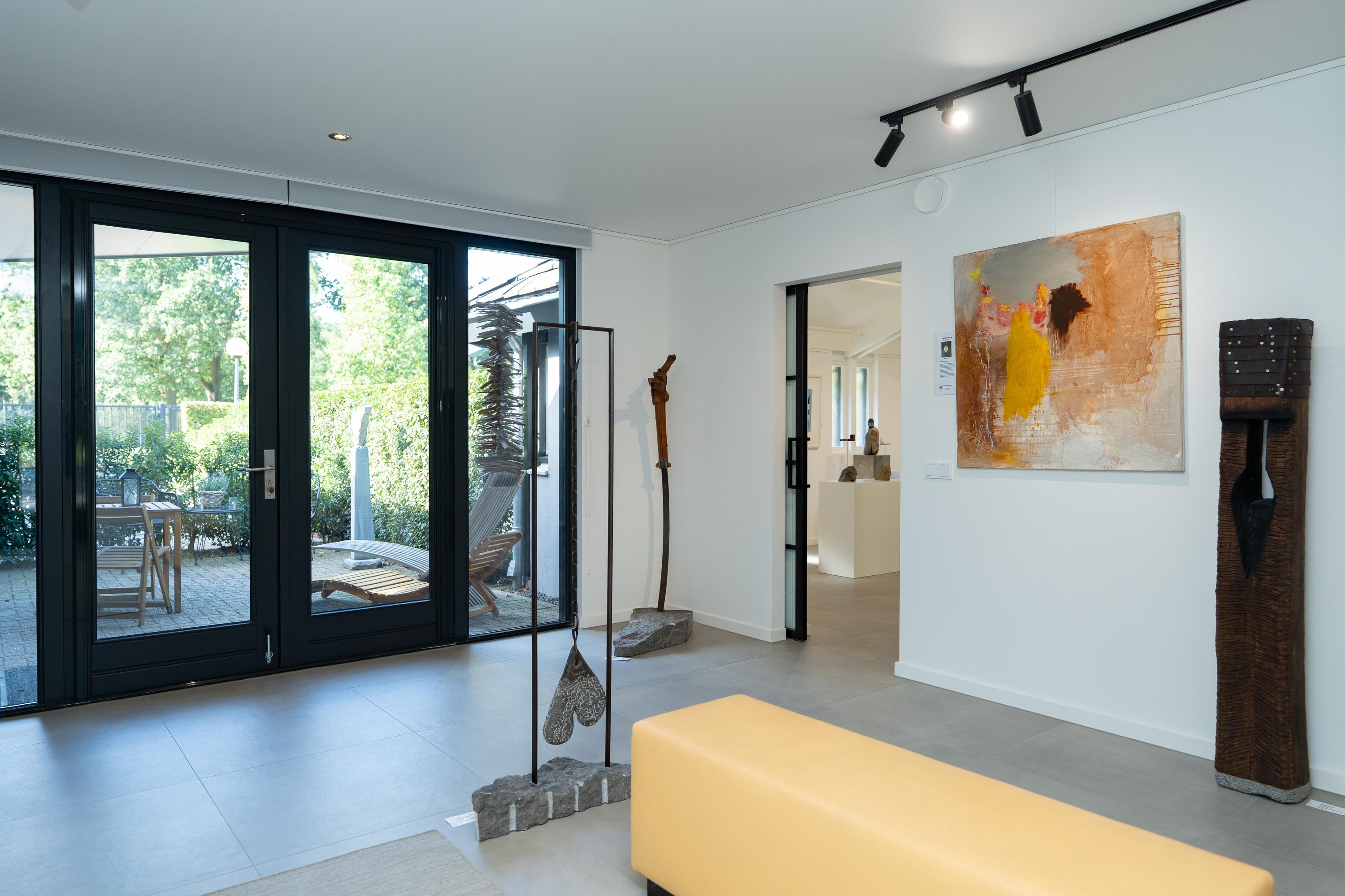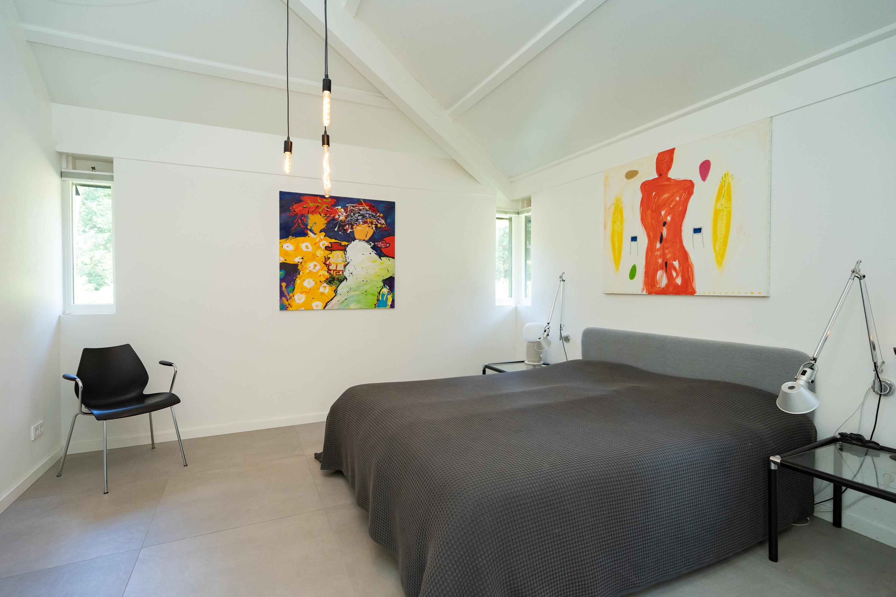 There are a total of three bedrooms and a multifunctional study on the ground floor. The study is currently used as a gallery. The master bedroom has a spacious walk-in closet and an adjoining very spacious bathroom with a combination sauna, freestanding bathtub, shower, double sink, and toilet. Here you can relax and enjoy the green surroundings while bathing. The second bathroom is located near the other bedrooms and is equipped with a shower, double sink and toilet.