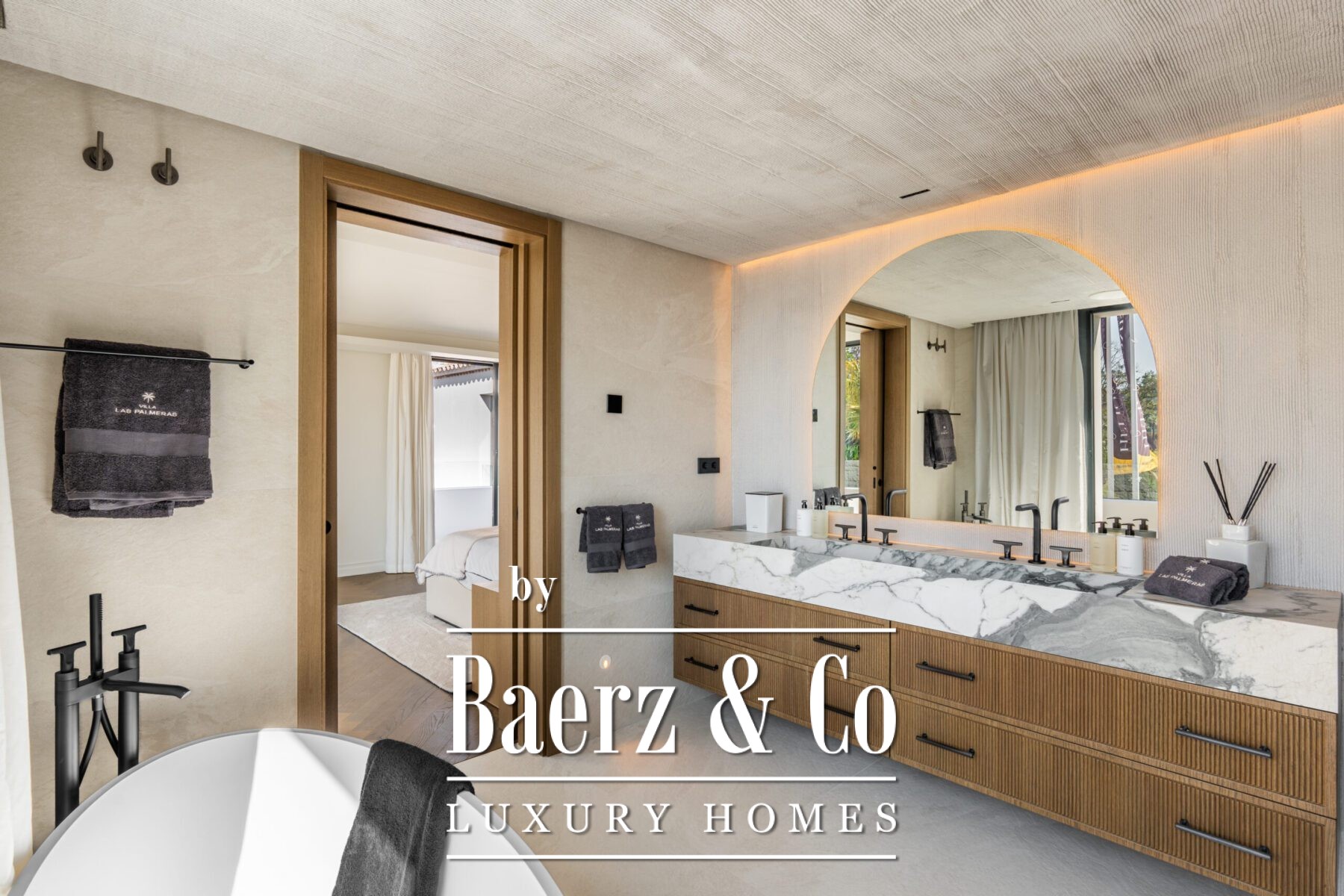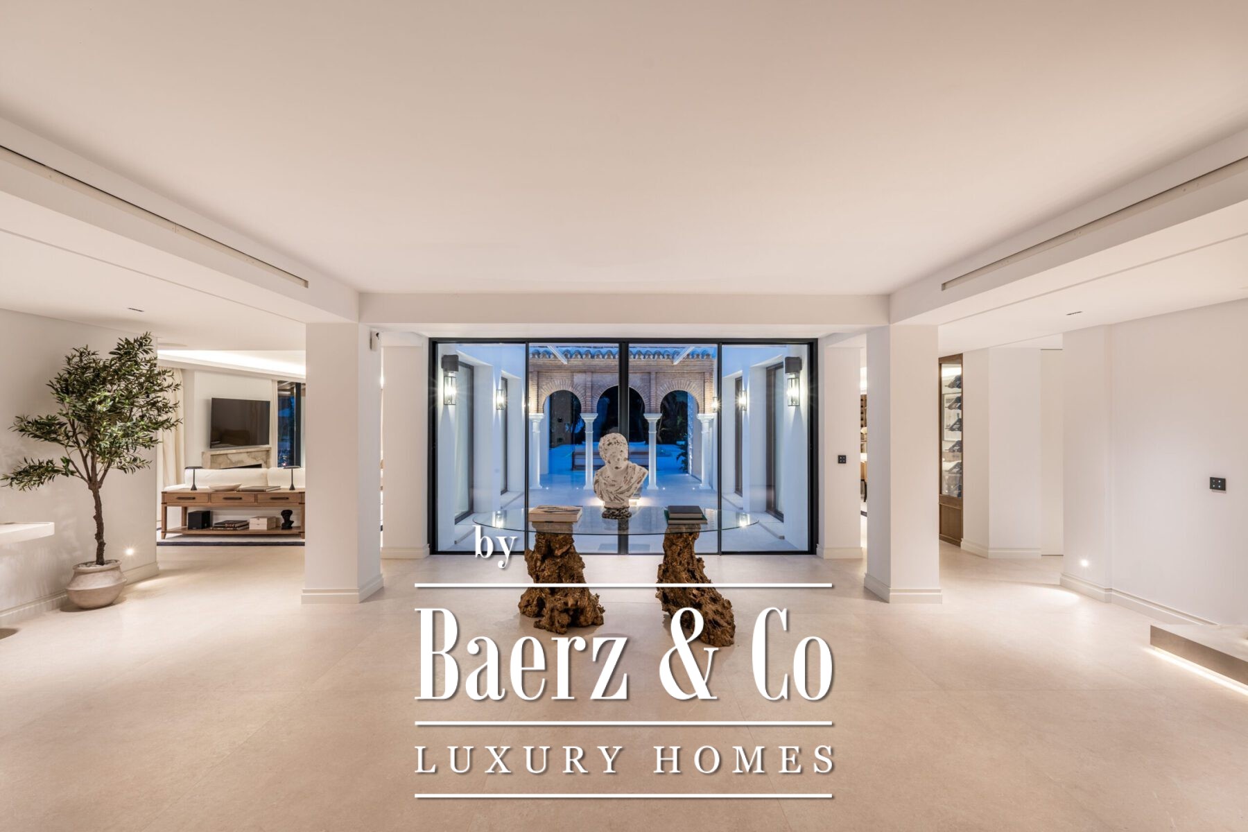 Villa Marbella with golf and mountain views redefines the rhythm of coastal living. Set within 1,257m² of carefully designed interiors on a 2,563m² plot, the villa is organized across three spacious levels, each shaped by natural light and the tranquility of its central patio. The master suite, with its private terrace and outdoor shower, frames views across the golf course, a place to reflect or recharge as the day unfolds.