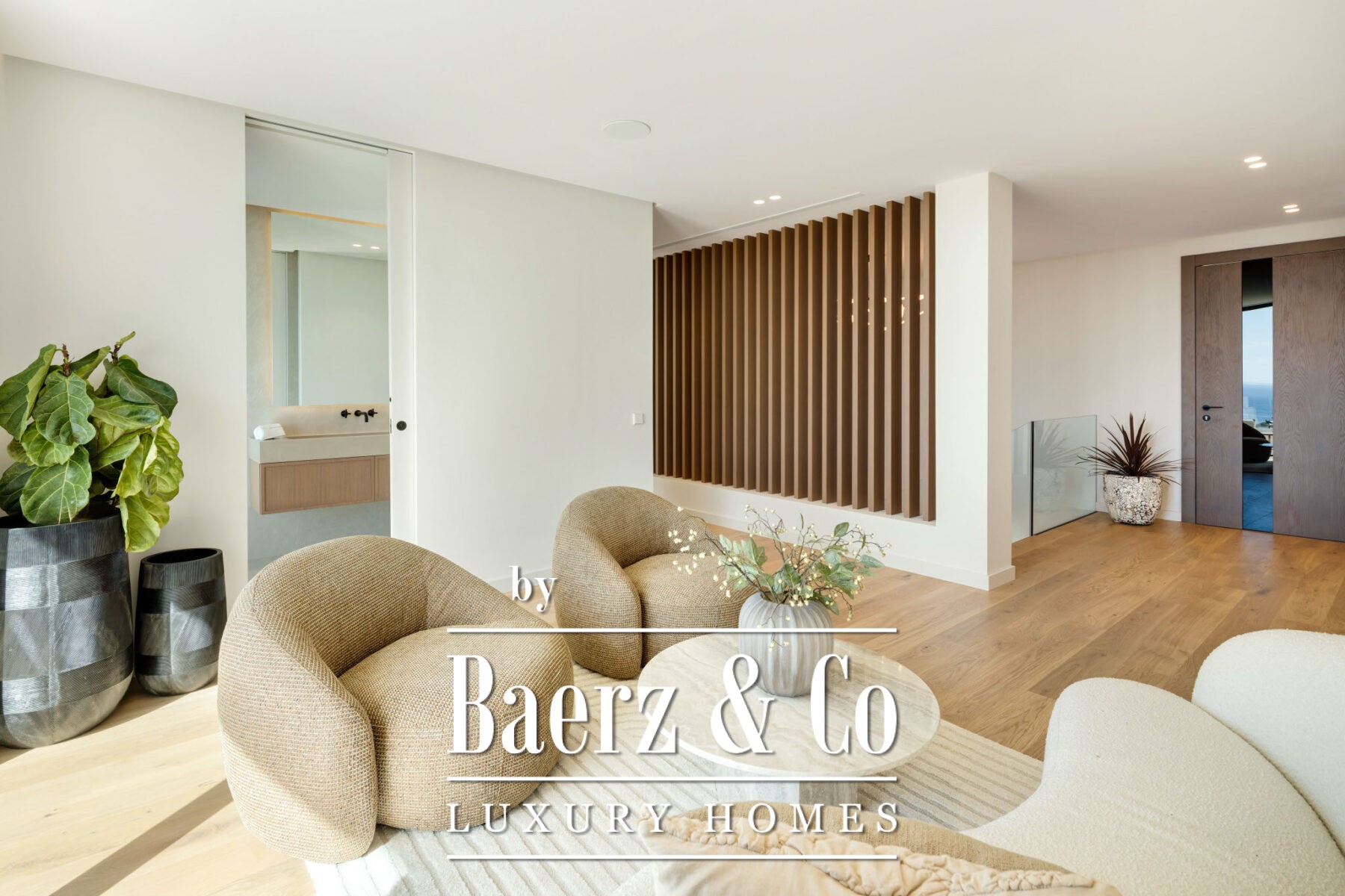 The villa’s interior is distinguished by high-grade oak flooring, large-format porcelain tiles, and state-of-the-art appliances from Gaggenau and Siemens. Leisure pursuits are indulged through a private heated swimming pool, a dedicated cinema room, and a gym. The garage meets modern needs, and the property is offered fully furnished in a contemporary style, with furniture available separately at €250,000.