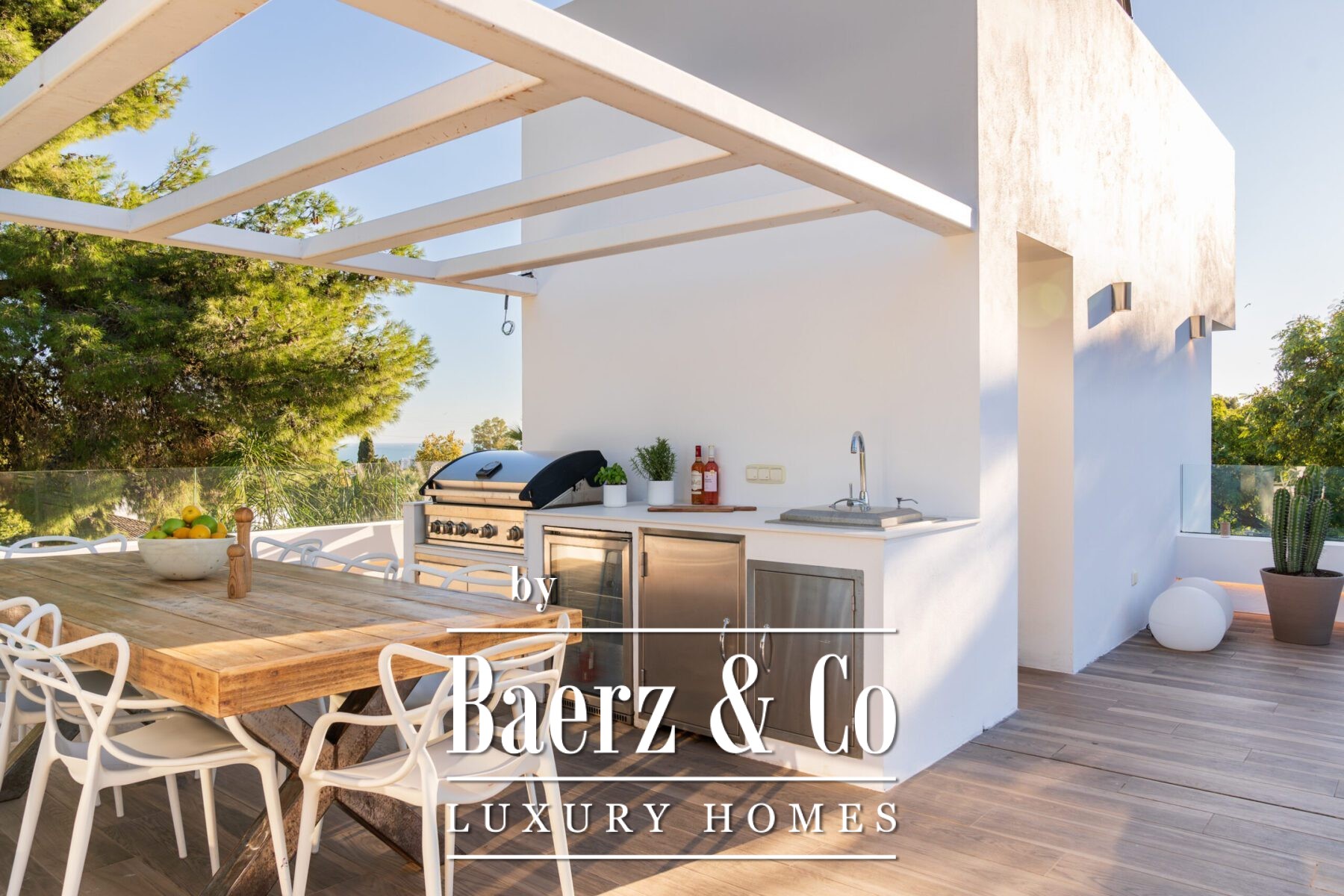 Upstairs, the master suite offers a generous walk-in wardrobe and a refined en-suite bathroom. An additional guest bedroom on this floor features its own walk-in closet and en-suite, while the living area opens to the solarium terrace, framing partial sea and mountain views. The terrace provides ample opportunity for both relaxation and entertaining.