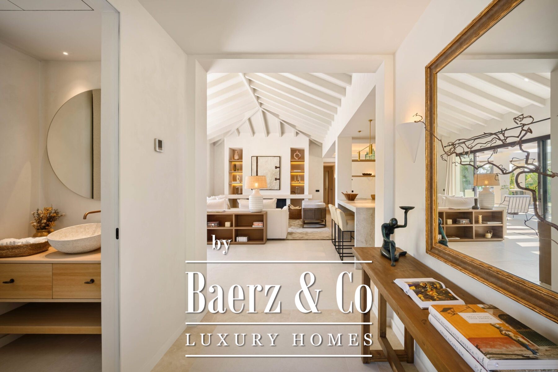 Villa Marbella with Sea and Mountain Views sits quietly in Nueva Andalucía, minutes from Los Naranjos Golf Course and close to Marbella’s celebrated beaches and dining. This fully renovated single-level villa, with 241 m² of living space and set on an 855 m² elevated plot, captures the essence of Mediterranean life. The main living area is defined by its open-plan design, vaulted ceilings, and a palette of soothing natural tones. Light moves freely throughout, courtesy of floor-to-ceiling glass doors that lead to a generous terrace, where an infinity-edge pool appears suspended above the valley. From both inside and the rooftop terrace, expansive views reach across the valley to meet the sea.
