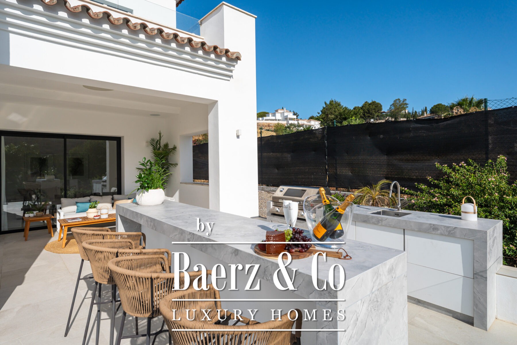 The residence’s architecture balances contemporary clarity with warmth, employing ceramic stone and wood finishes to create a poised atmosphere. Miele appliances, solar panels, electric blinds, and an advanced irrigation system speak to its sustainable detailing. Terraces open from all bedrooms and main spaces, leading to a covered swimming pool, outdoor barbecue area, and sauna, while panoramic golf course and Mediterranean Sea views act as a constant aesthetic backdrop.