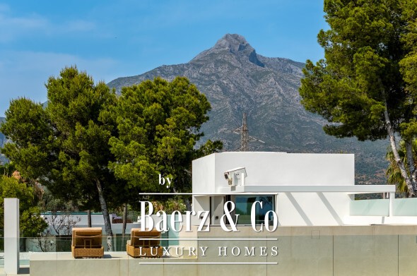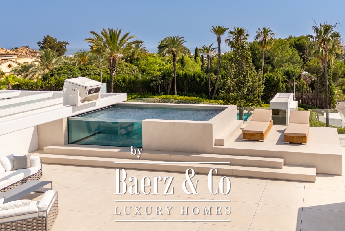 Accommodation comprises four bedrooms and five bathrooms. Three are en-suite sanctuaries enhanced by oak wood flooring and Porcelanosa marble finishes, while the flexible fourth suite on the lower level adapts to guests, staff, fitness, or office use. An outstanding private rooftop solarium crowns the residence, offering a plunge pool, rooftop cinema, and open views to the Mediterranean Sea and La Concha Mountain. This solarium sets a stage for sunset conversation or quiet reflection beneath the stars.