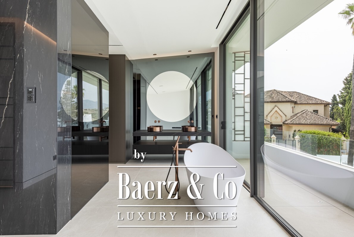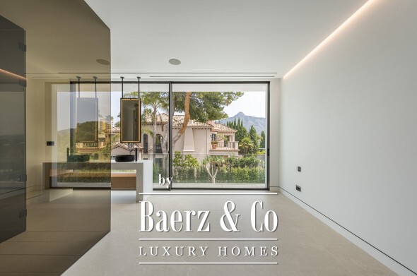 The property’s four distinctive levels are interconnected by an elegant staircase. The open-plan living and dining areas flow seamlessly to a sunlit terrace, ideal for gatherings and enjoying the pace of Marbella’s outdoor living. A Gaggenau-fitted kitchen and custom cabinetry underscore the home’s focus on aesthetics and daily ease.