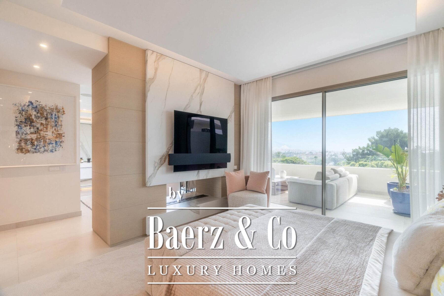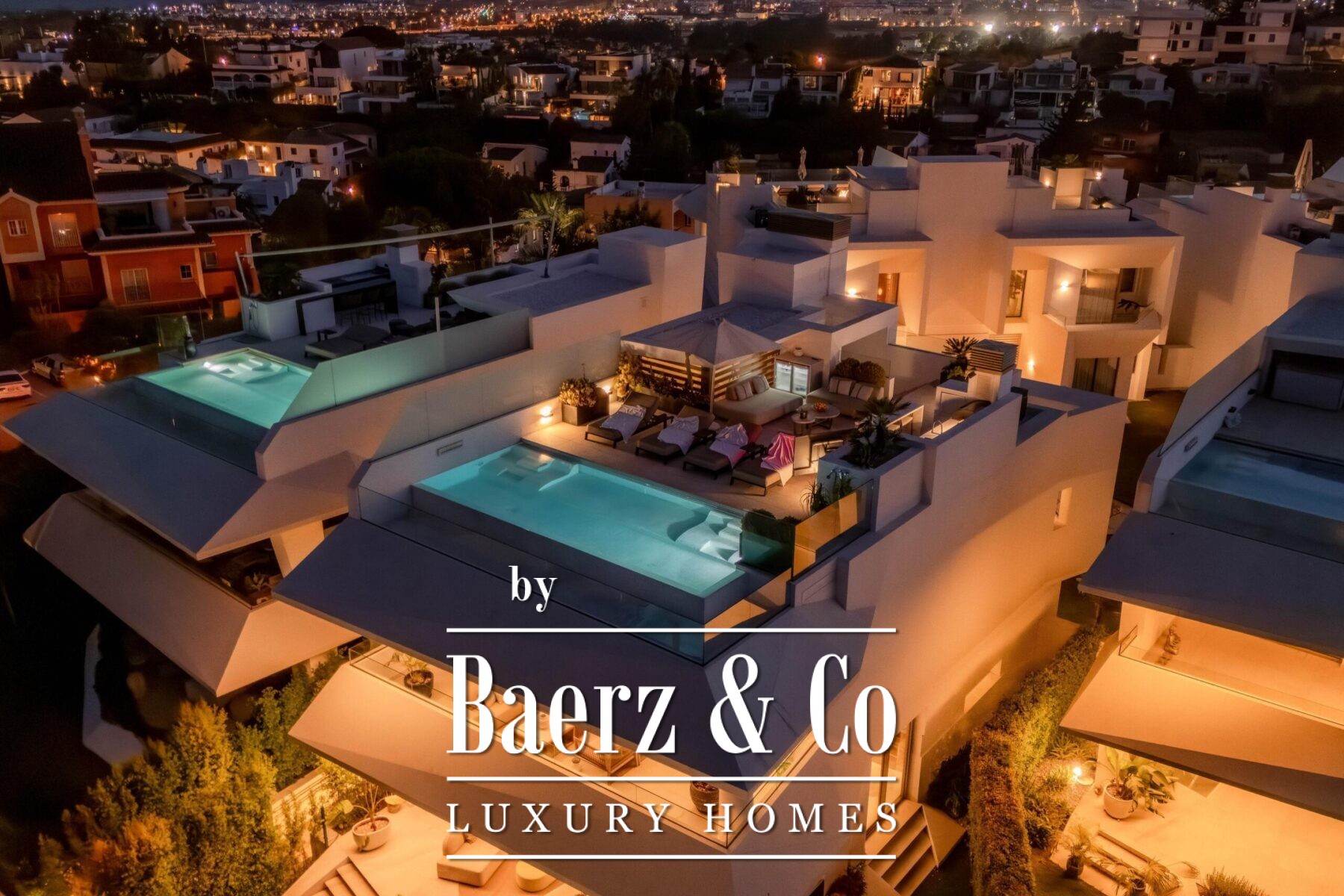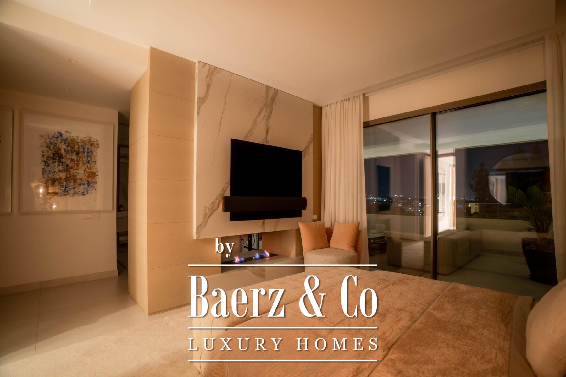 Generous living areas connect to a covered terrace designed for seamless indoor-outdoor living. The custom rooftop solarium, complete with a private plunge pool, opens up panoramic views over the Golf Valley and the iconic La Concha mountain. A private elevator links each of the four levels, allowing effortless access throughout, while the fully equipped Siematic kitchen invites convivial gatherings.