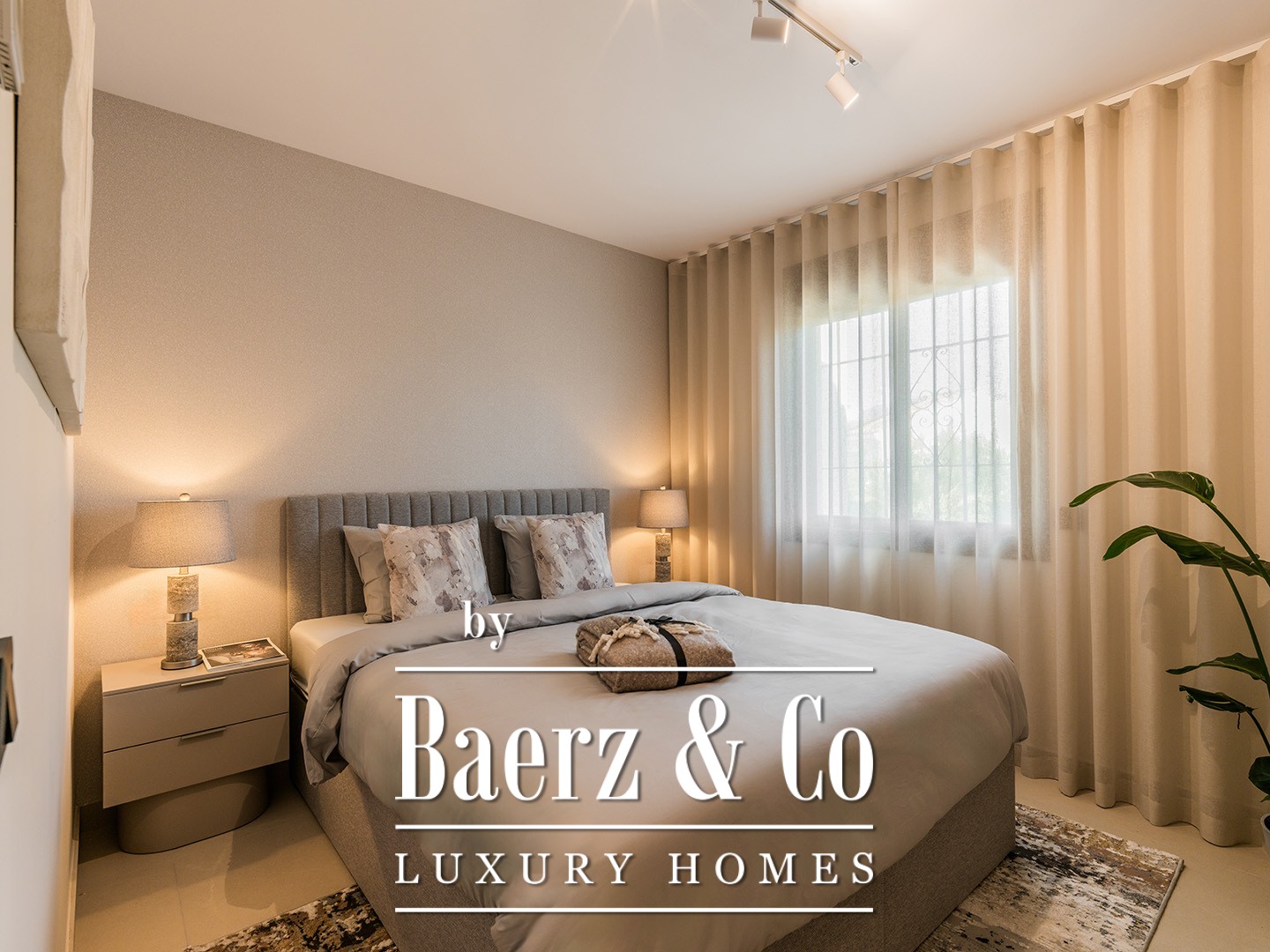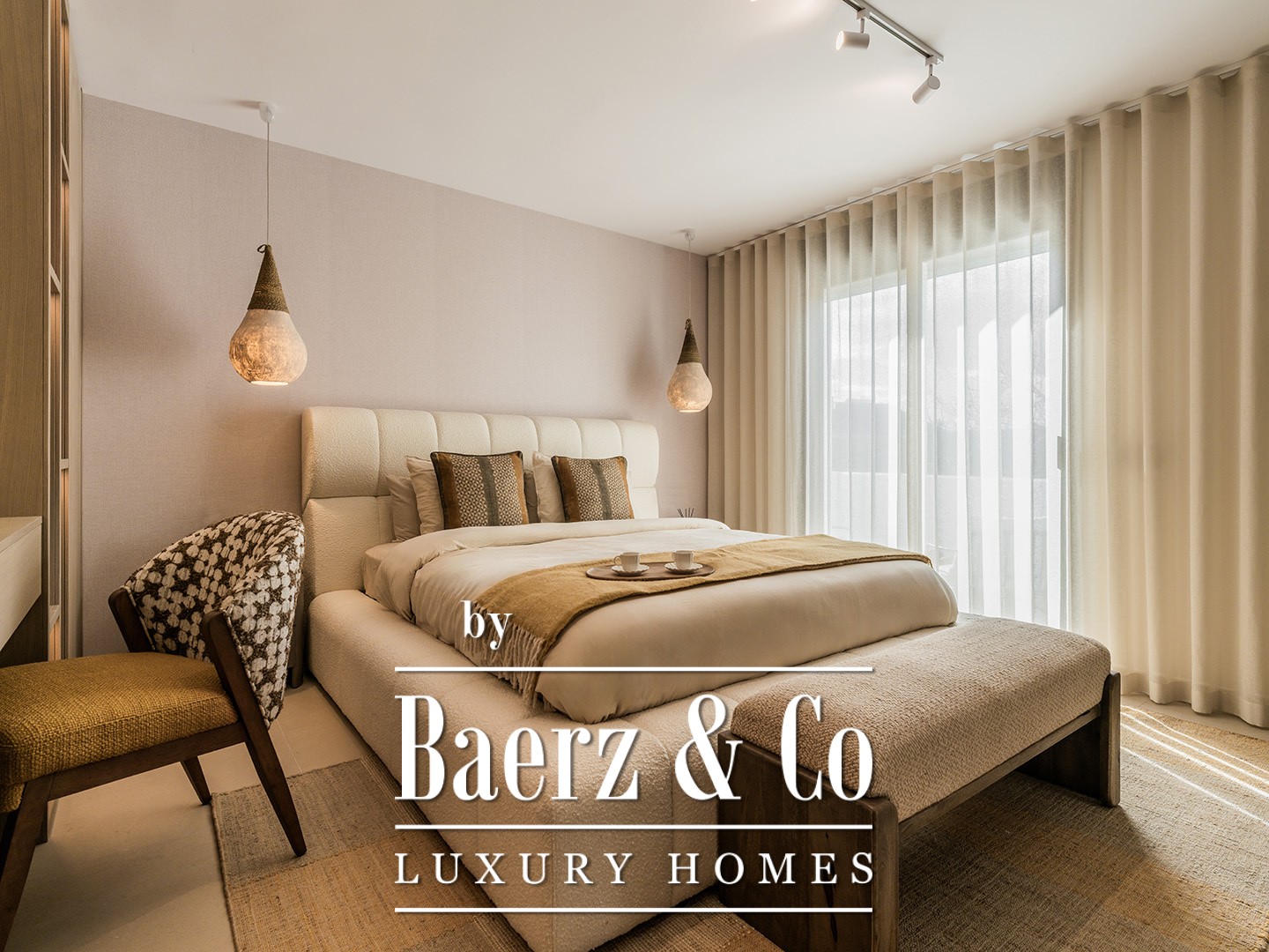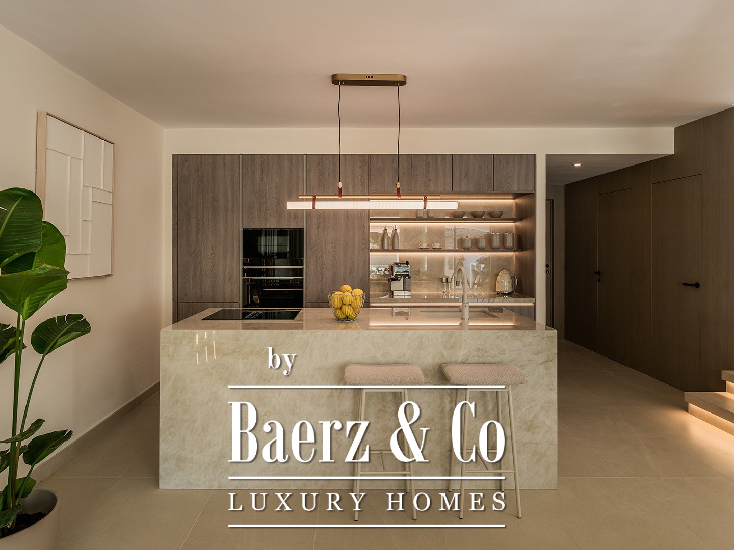 Across two thoughtfully planned levels, the house features four bedrooms and three bathrooms, including a main suite with a double walk-in shower, dressing area, and private terrace. The spacious ground floor provides an open plan living space with a modern kitchen, central island, and integrated high-end appliances. Natural light fills the interiors, while direct access to a partially covered terrace reveals an outdoor kitchen, BBQ, wine fridge, and a private heated pool—ideal for alfresco dining and year-round enjoyment.