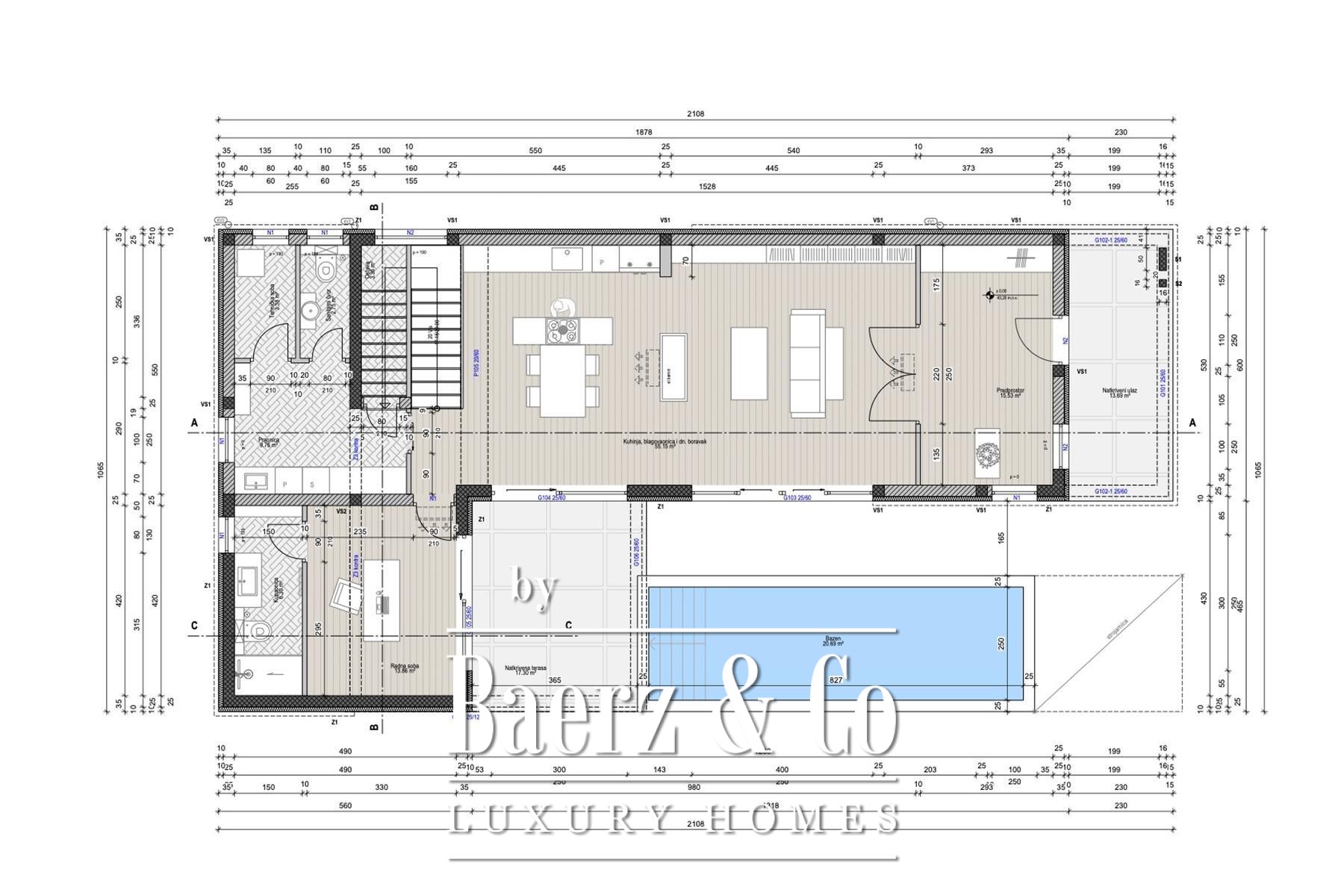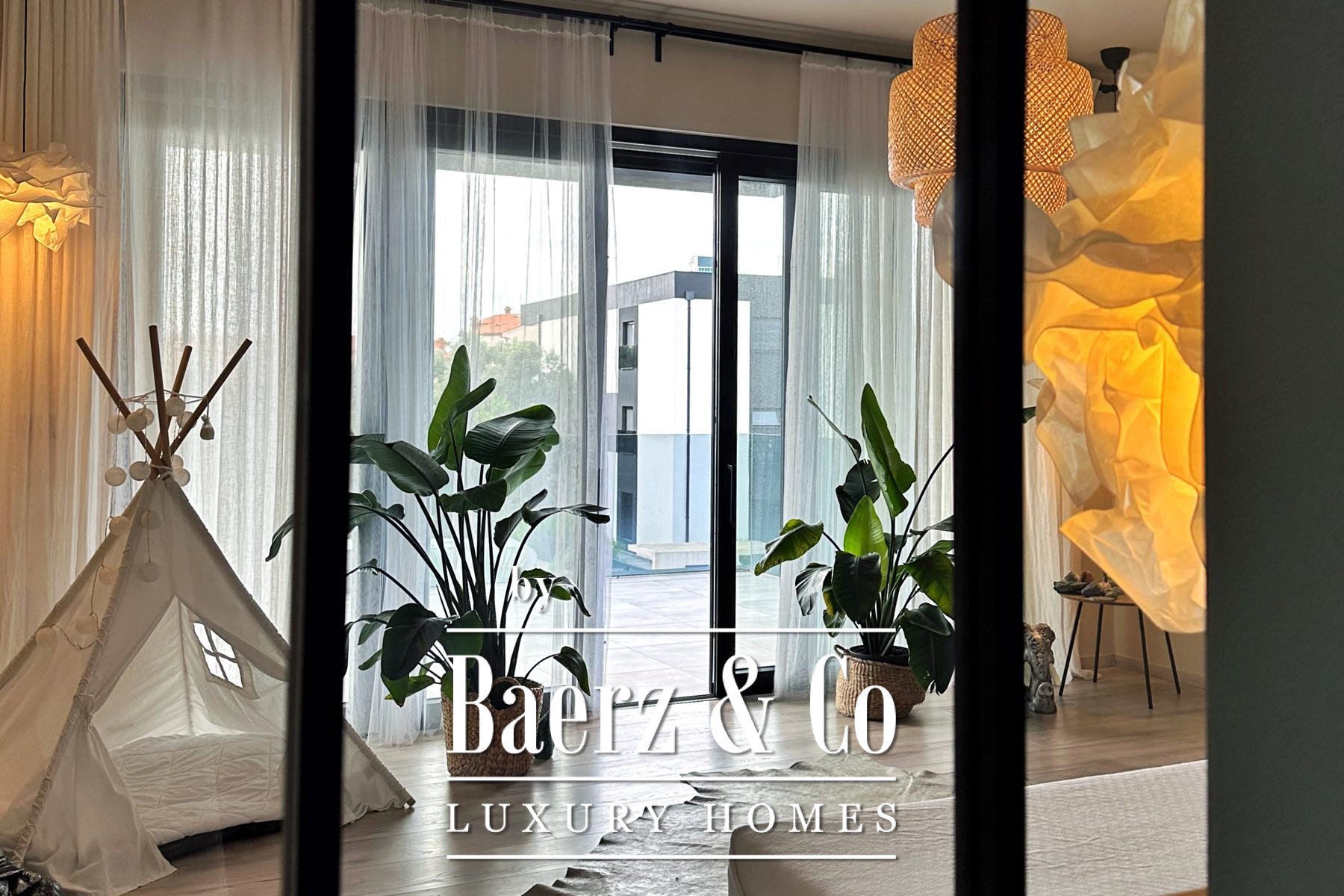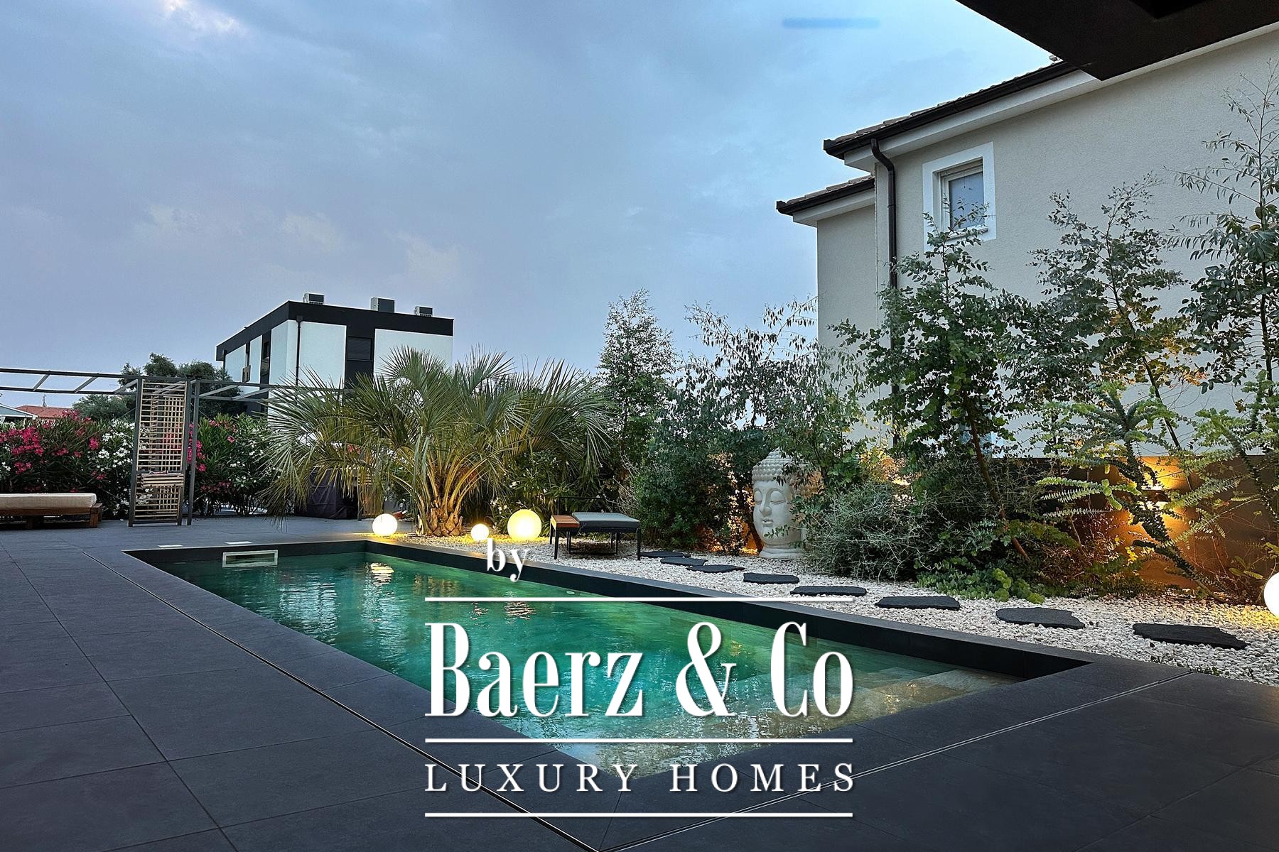Villa Premantura Medulin is set on a carefully landscaped 710 m² plot at the southern edge of the Istrian peninsula. This property extends over 205 m², offering a sense of tranquility with understated architectural lines and natural light shaping each space. The ground floor welcomes you into a large living room, defined by warm tones, custom furnishings, and a fireplace that anchors the atmosphere. Floor-to-ceiling glass opens to reveal the swimming pool and garden, forging a seamless blend between indoors and out. A comfortable kitchen, a bedroom, a guest toilet, utility rooms, and access to the backyard encourage both relaxed living and practical intention.