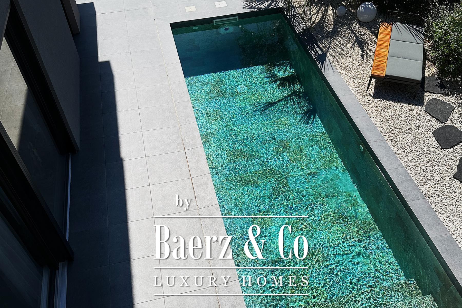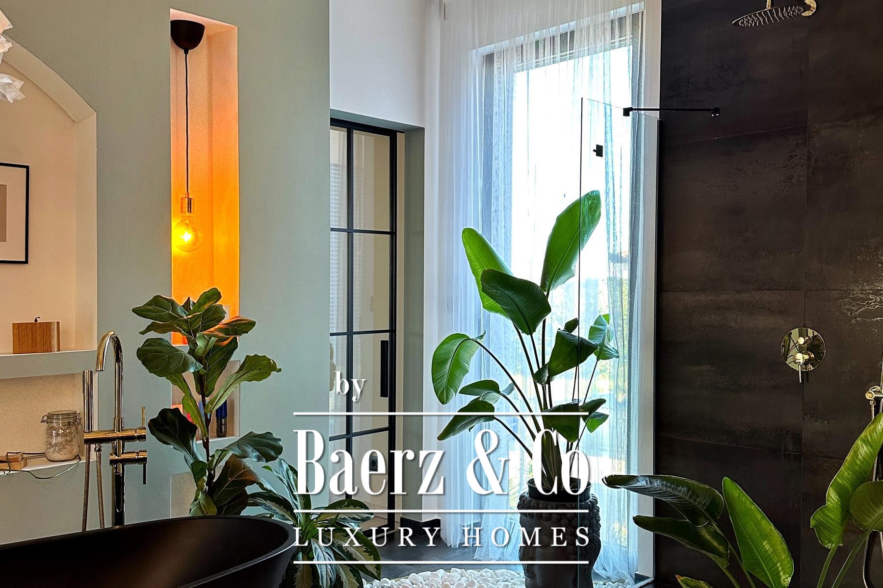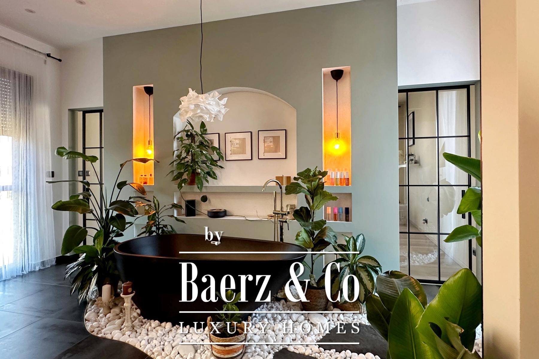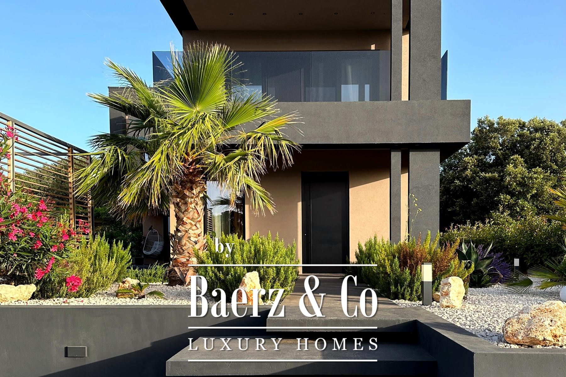 On the first floor, the main bedroom is airy, extending onto a covered terrace with views of the surrounding landscape, while its spacious bathroom integrates green elements for a sense of retreat. A second bedroom of modern design features its own private bath. Throughout, furniture and finishes originate from Germany, Italy, and the Czech Republic, curated for quality and enduring appeal. Underfloor heating using a heat pump system and individual air conditioning units ensure comfort all year. Outdoors, the villa’s barbecue, terraces, and mature greenery encourage privacy and conviviality, complemented by evening lighting and video security. Parking for four vehicles is offered in the entrance courtyard. This villa in Premantura is rare for its assured blend of seclusion, light, and European craftsmanship.