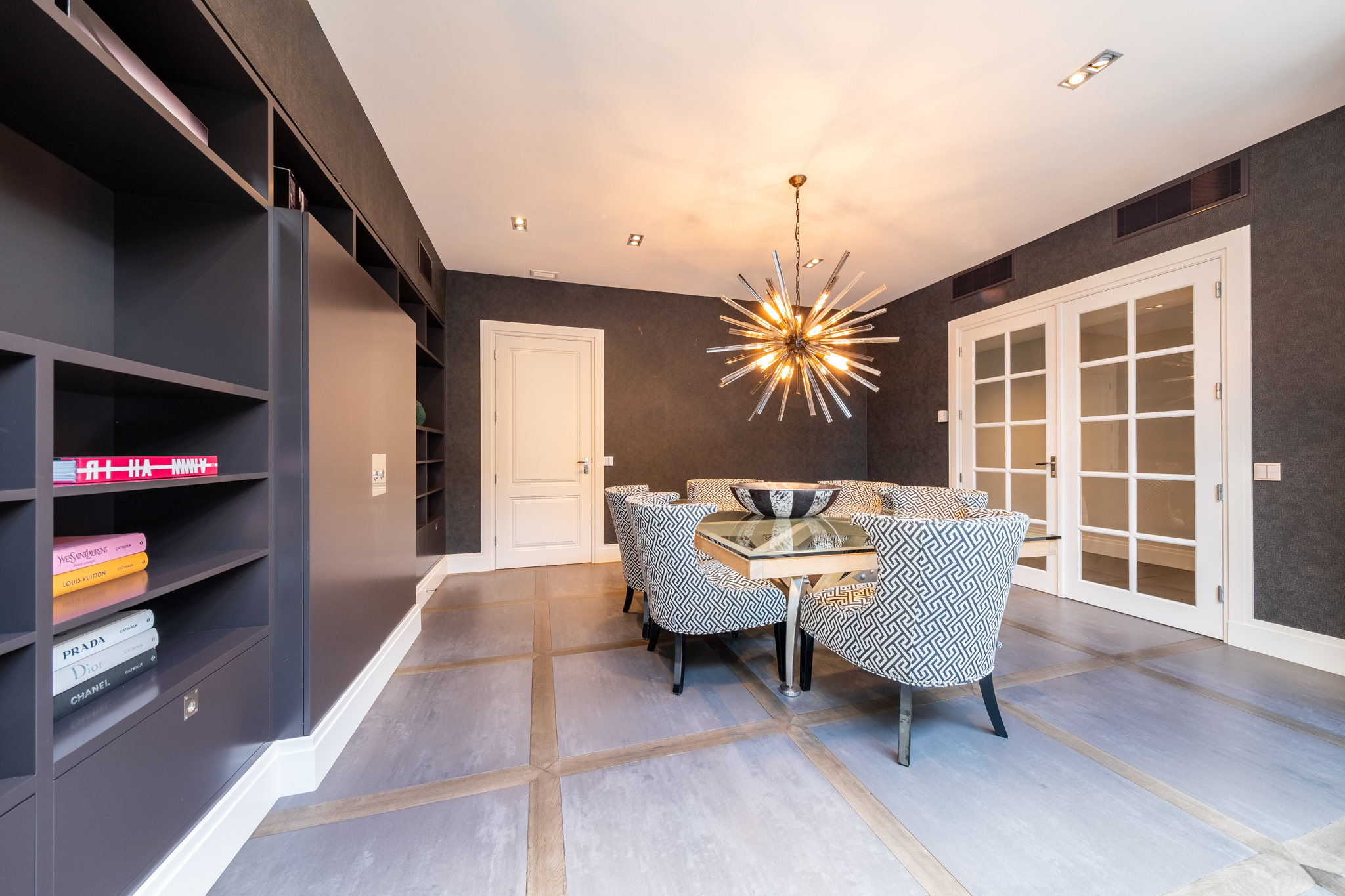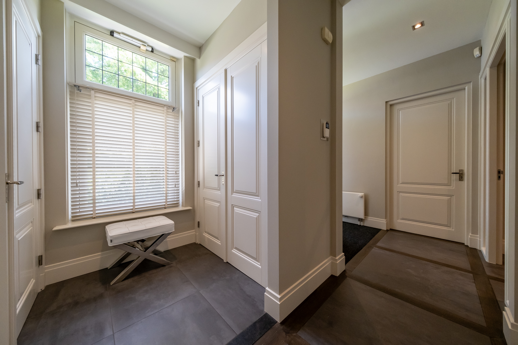 Ground floor with elegant ceramic tiles framed in unique wood detailing