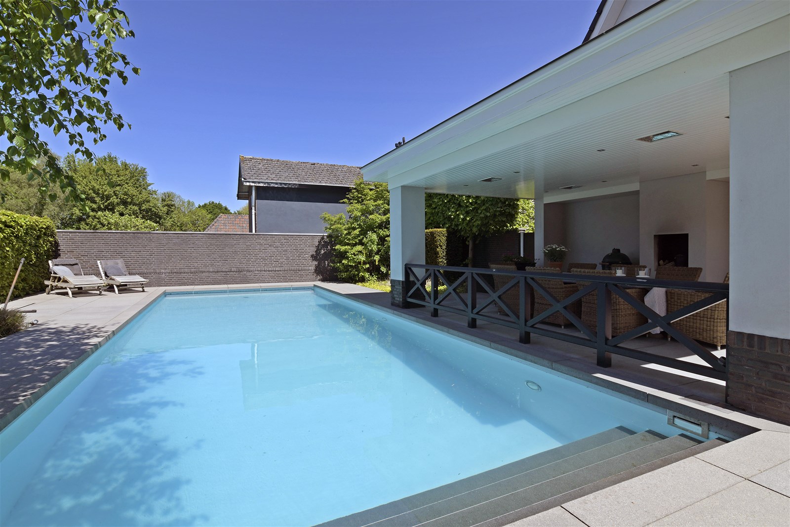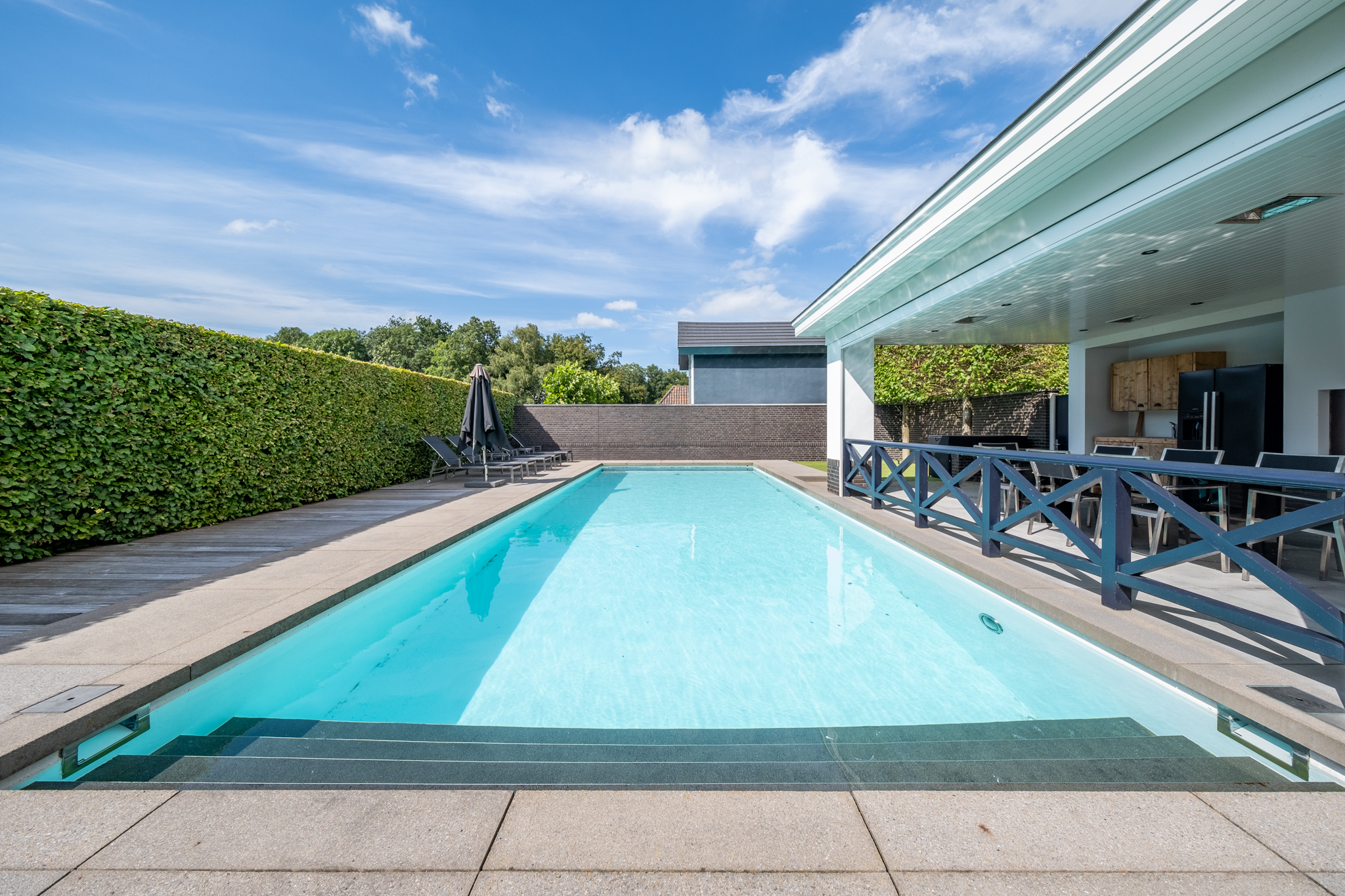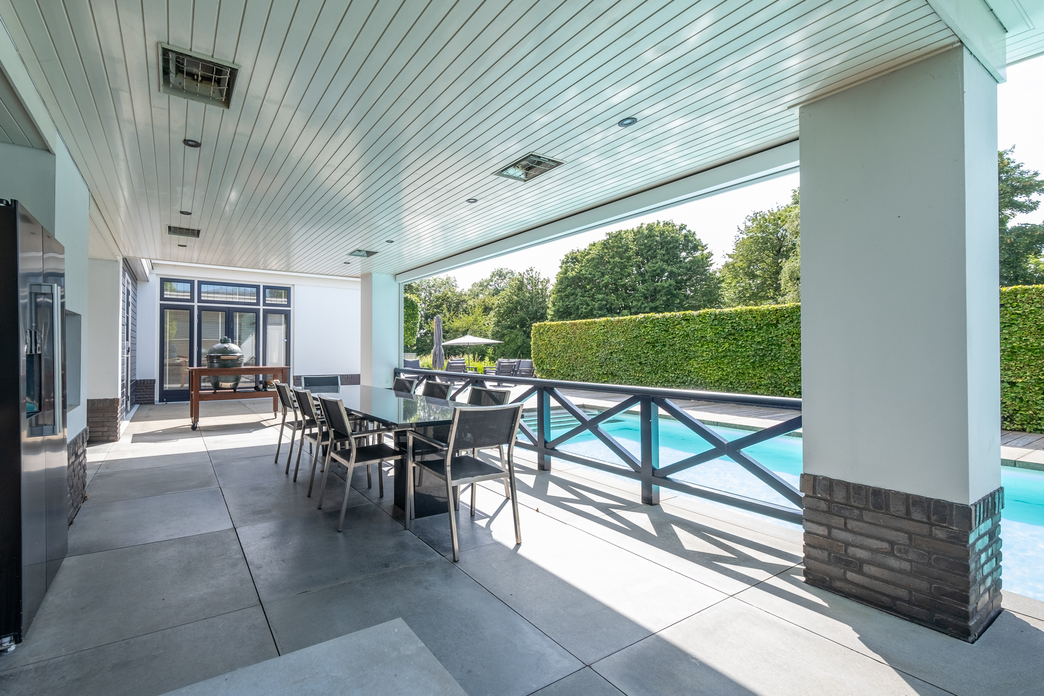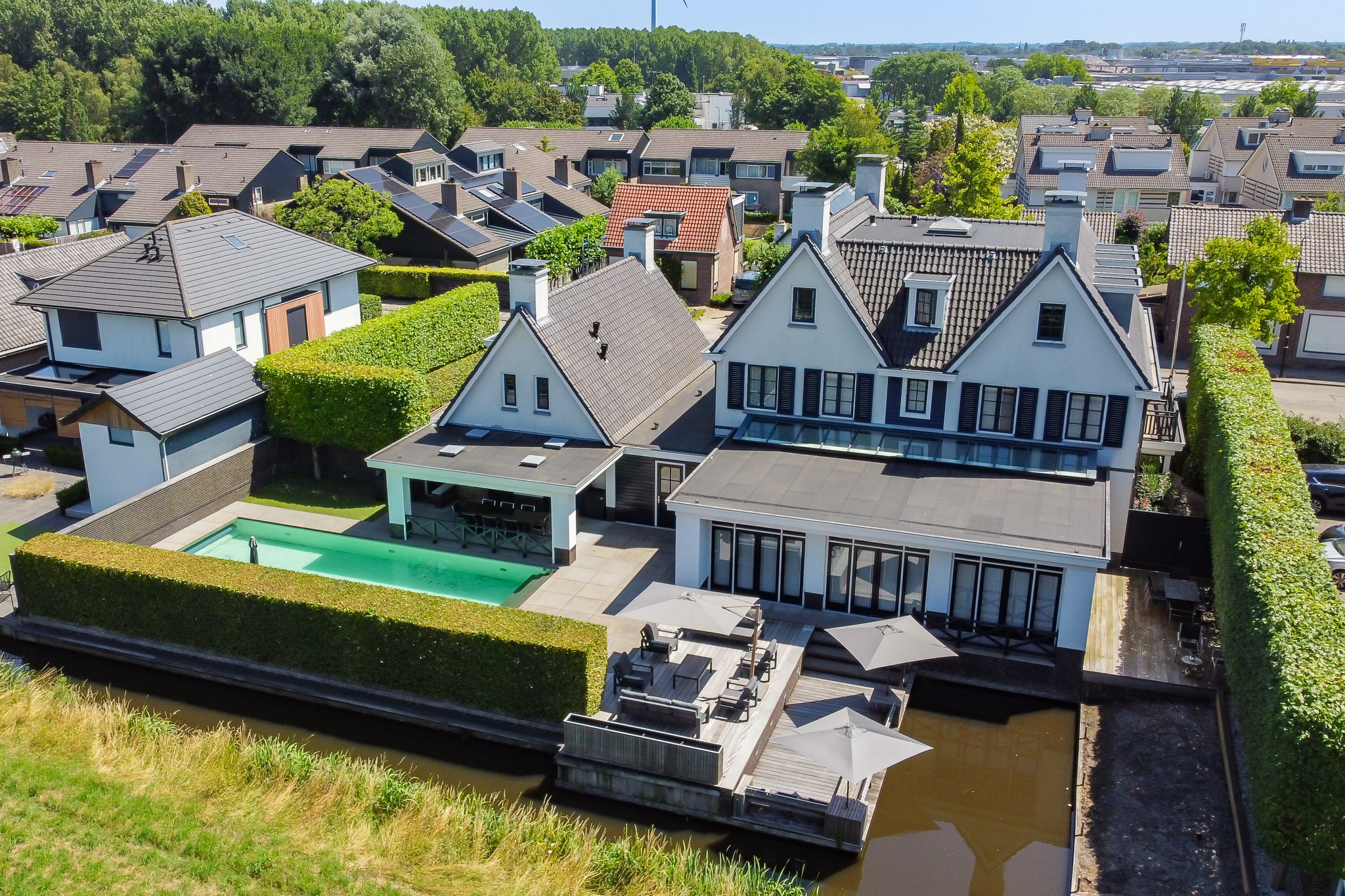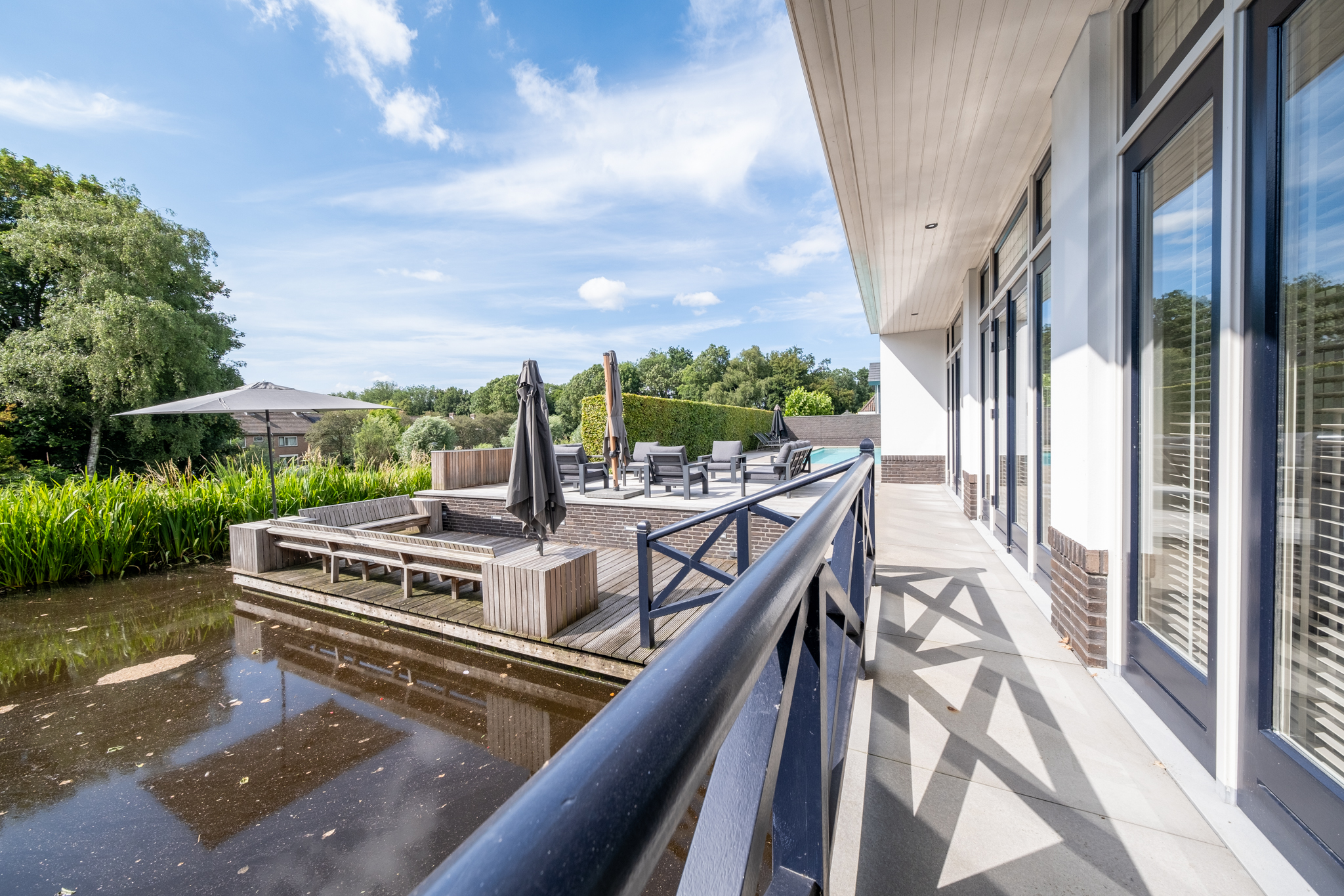 The villa is surrounded by lush, enclosed gardens, ensuring maximum privacy. A spacious veranda, multiple parking spaces, a double garage, and a heated outdoor swimming pool all contribute to an exceptional outdoor lifestyle. The rear garden borders the water and overlooks a green embankment, providing uninterrupted views and full seclusion. Outdoor living here is simply effortless.