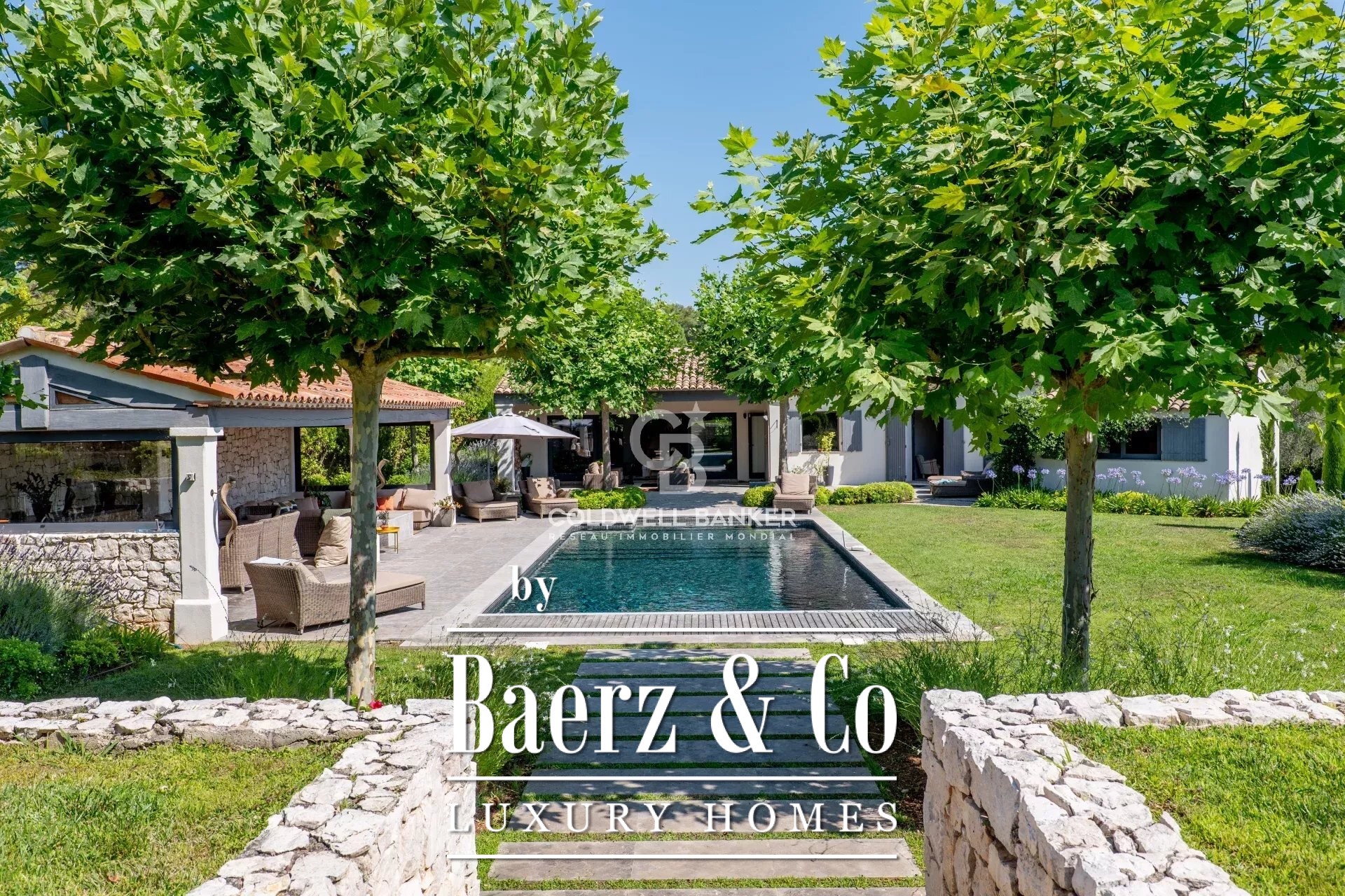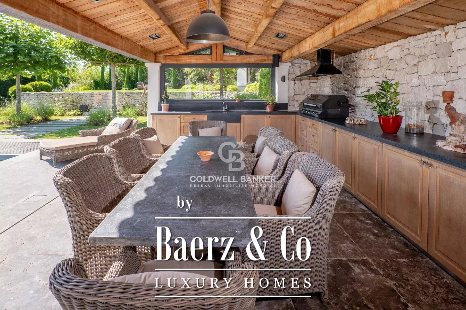 room, a vine cellar and a laundry room. The property also includes a guest house with a lovely bedroom, shower room and kitchenette. Superb outdoor area with beautiful swimming pool and pool house of around 130 m2 with brazier and outdoor kitchen. Located just a few minutes from international schools and the old village. Carport for two cars and parking space for at least two more cars.