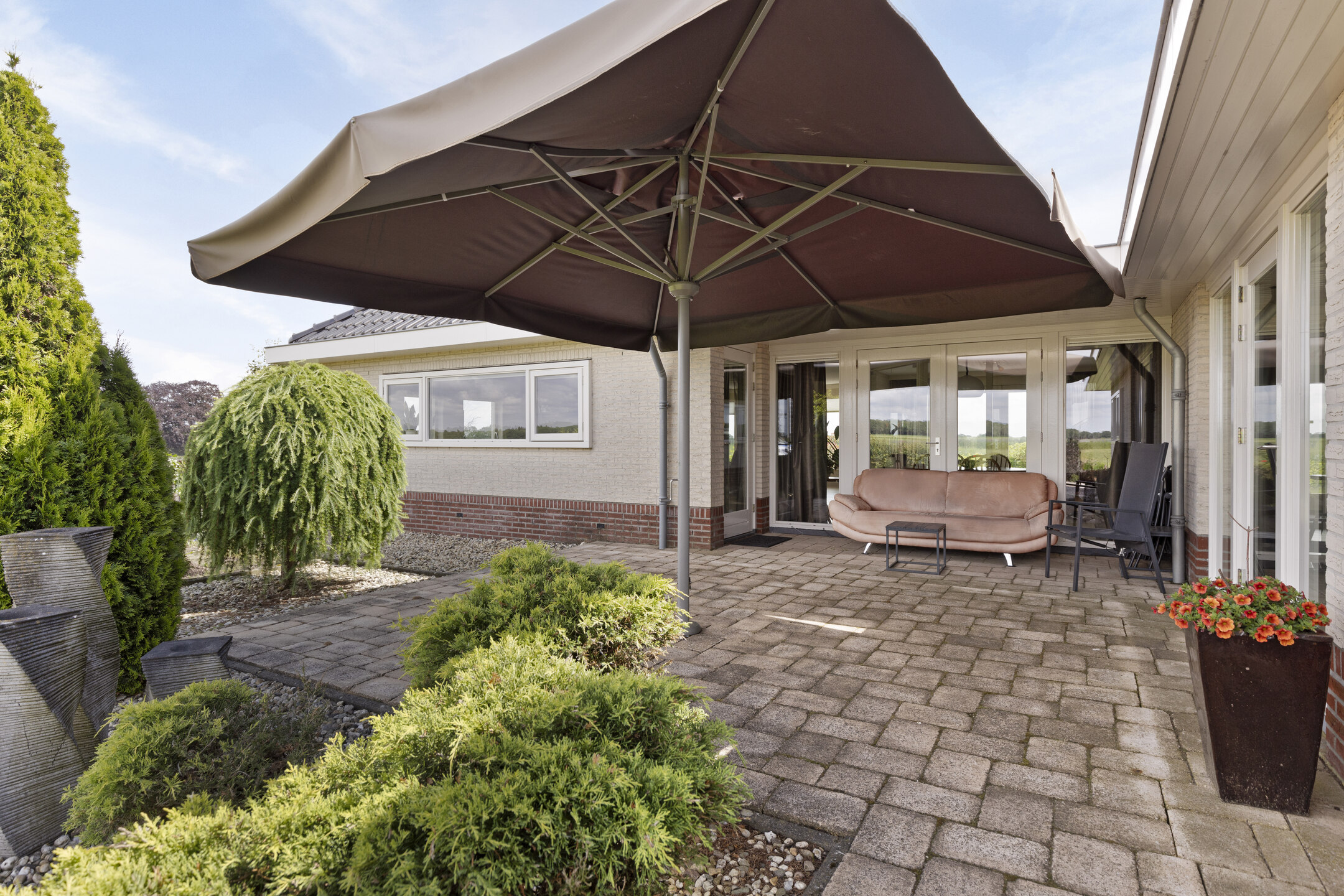 At the rear of the house is a covered terrace made by the French doors; a lovely place to end the day. Here there is also a large fixed parasol, to make the most of the garden even on hot days.