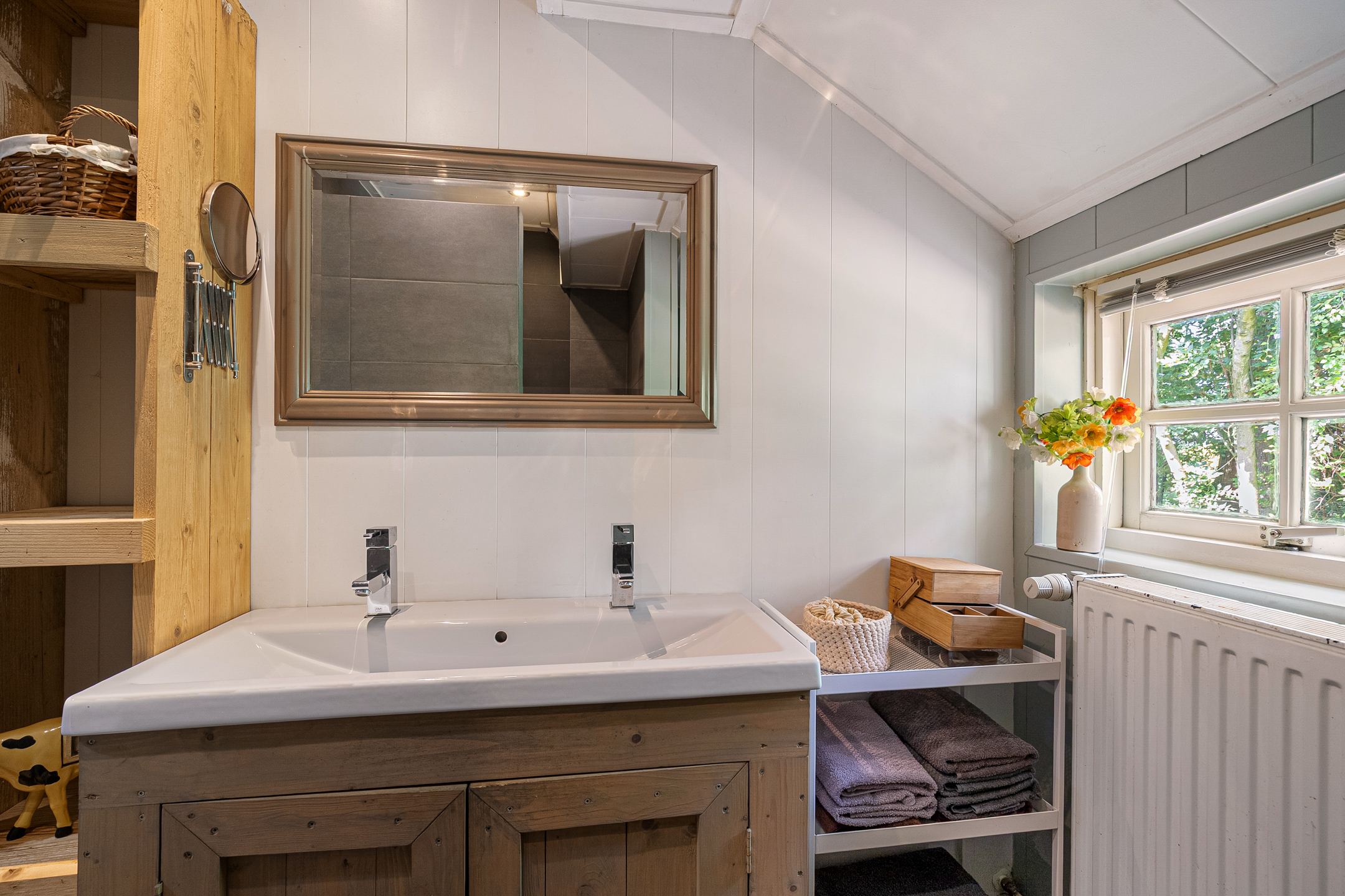 Beyond the dining room, a hall leads to the bathroom with shower, toilet and washbasin. The ground-floor master bedroom features characteristic stable windows, a private washbasin and a snug seating area – an intimate, romantic retreat. The ground floor is finished with sturdy whitewashed wooden floors and heated by radiators.