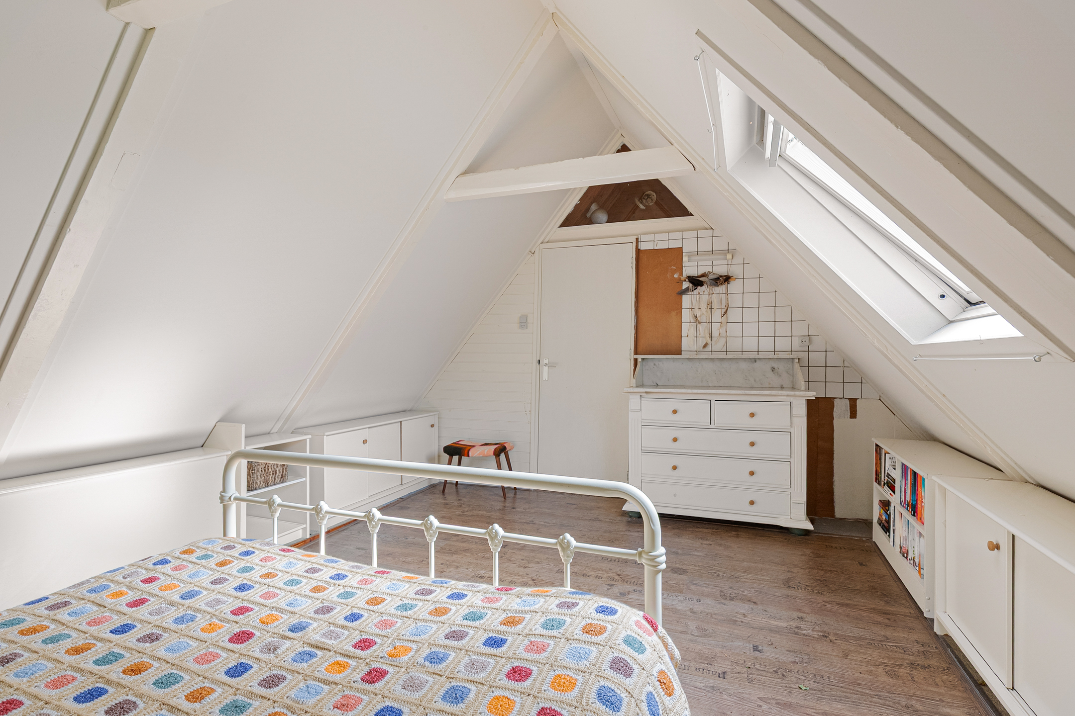 A closed staircase from the hall leads to two simple bedrooms beneath the pitched roof, each with windows and a skylight.