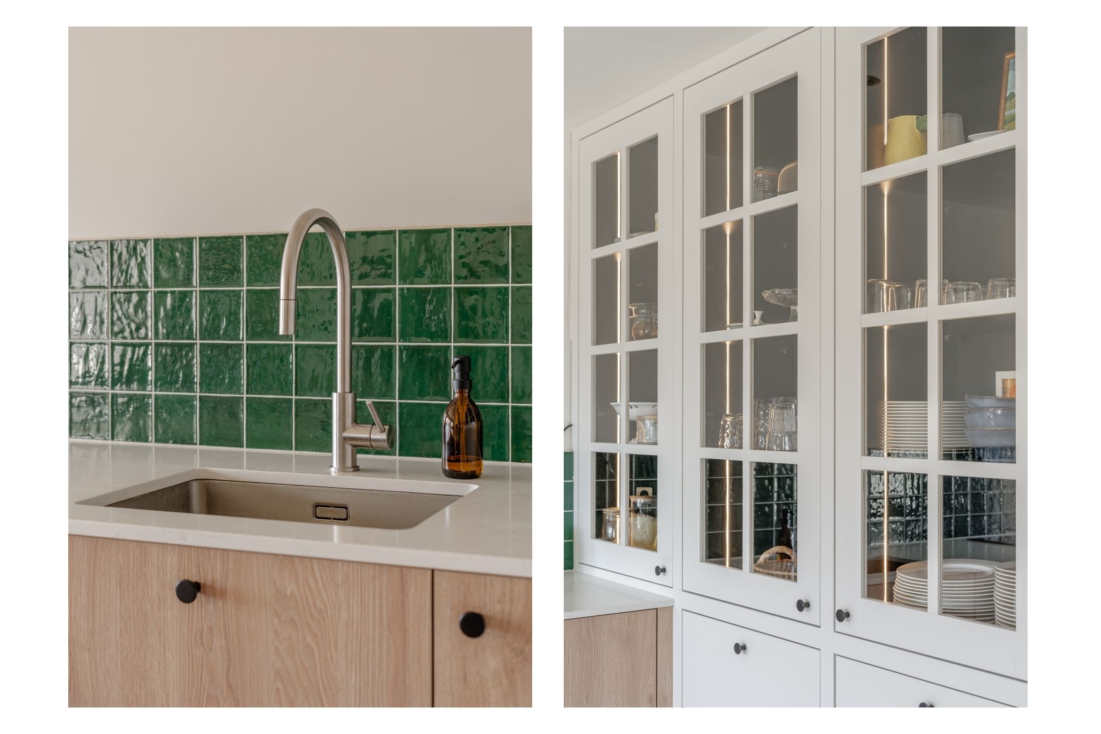 The bespoke kitchen features a generous worktop and is fitted with high-end built-in appliances, predominantly by Bosch, including a dishwasher, refrigerator, freezer, washing machine, and induction hob. The oven is by AEG. A custom-made cabinet for tableware completes the space, creating a clean and sophisticated look.