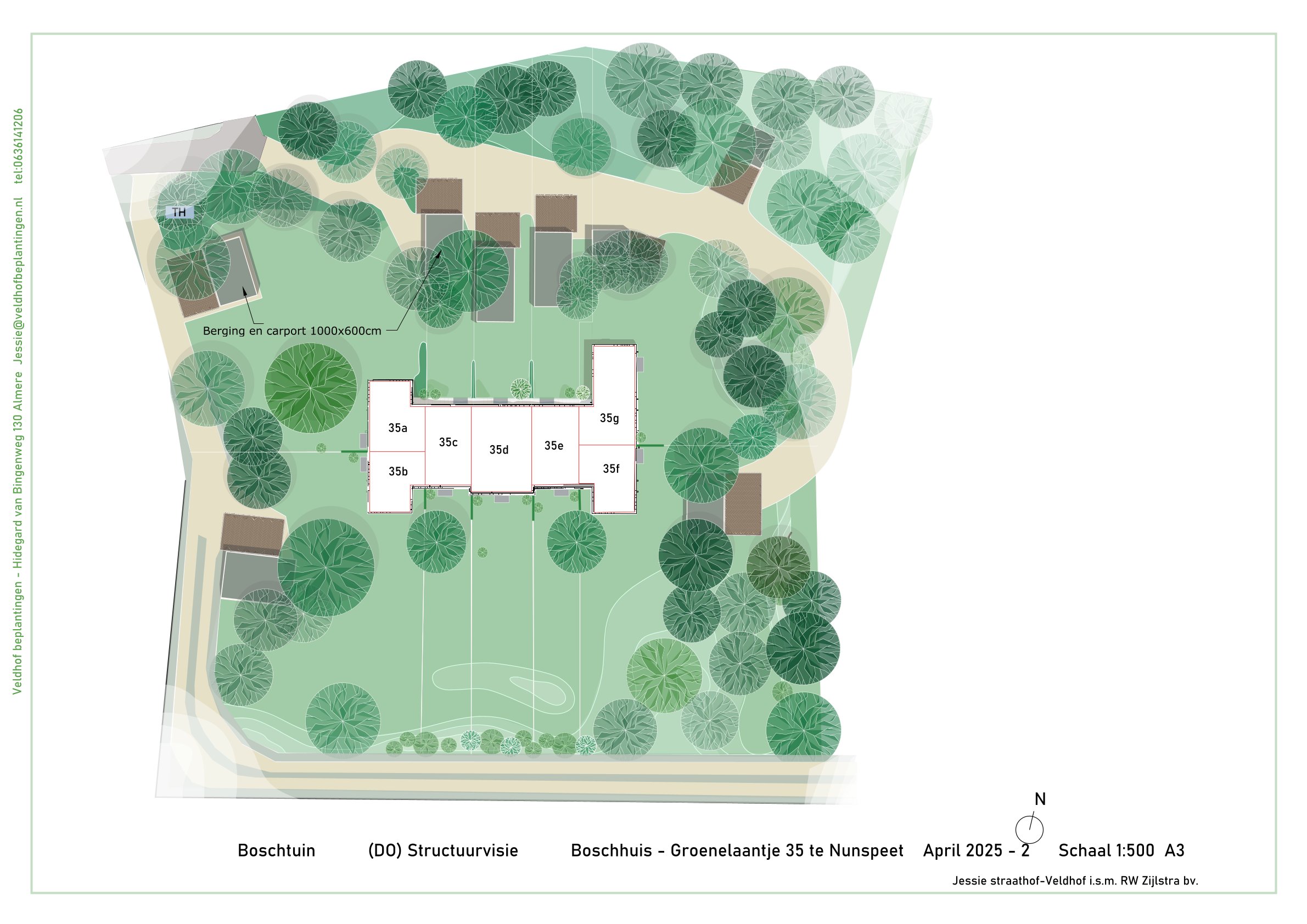 - Parkeergelegenheid: nieuwe houten garage (circa 35m²), dubbele carport (circa 35m²) en nog twee extra parkeerplaatsen.
