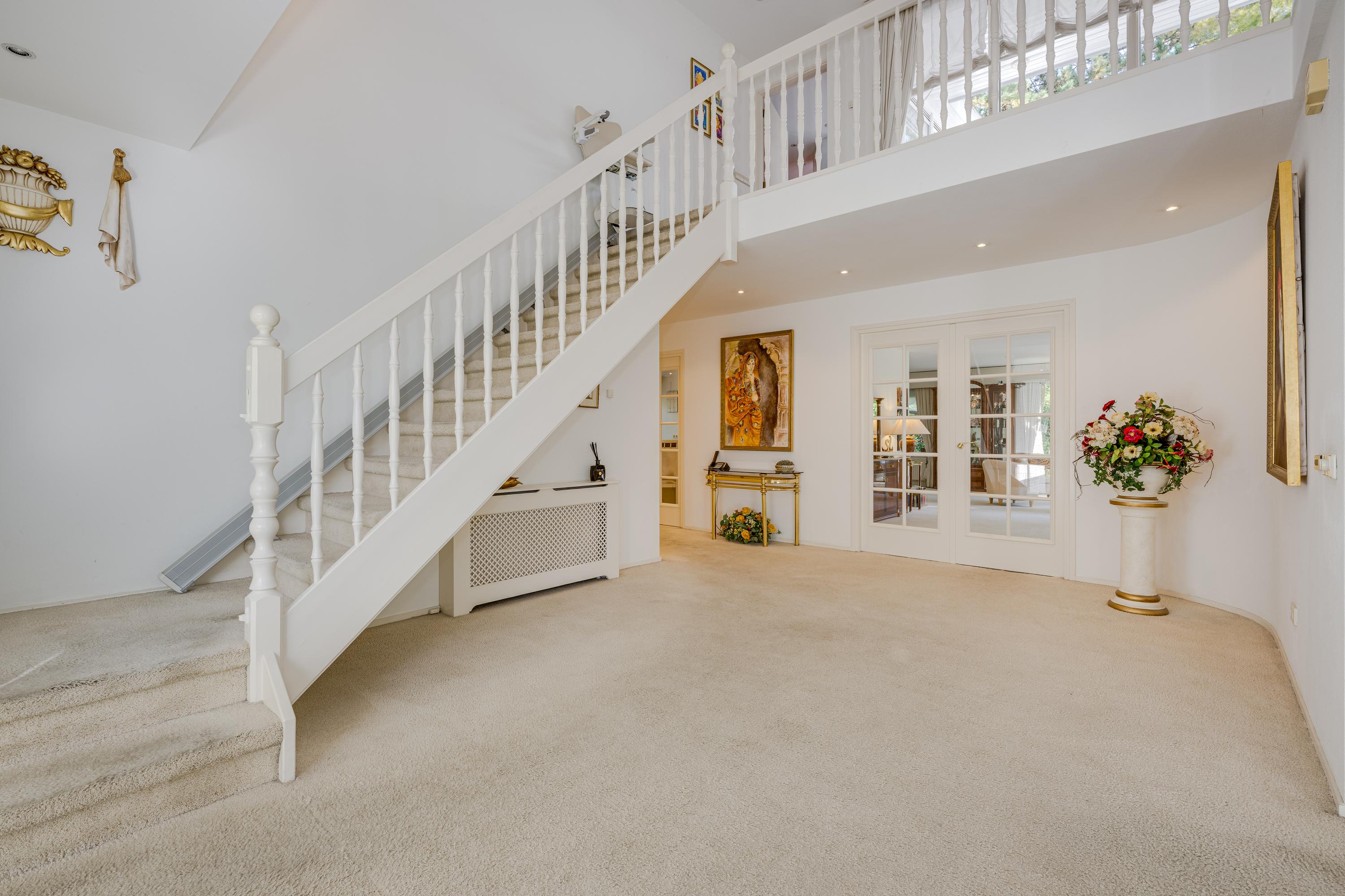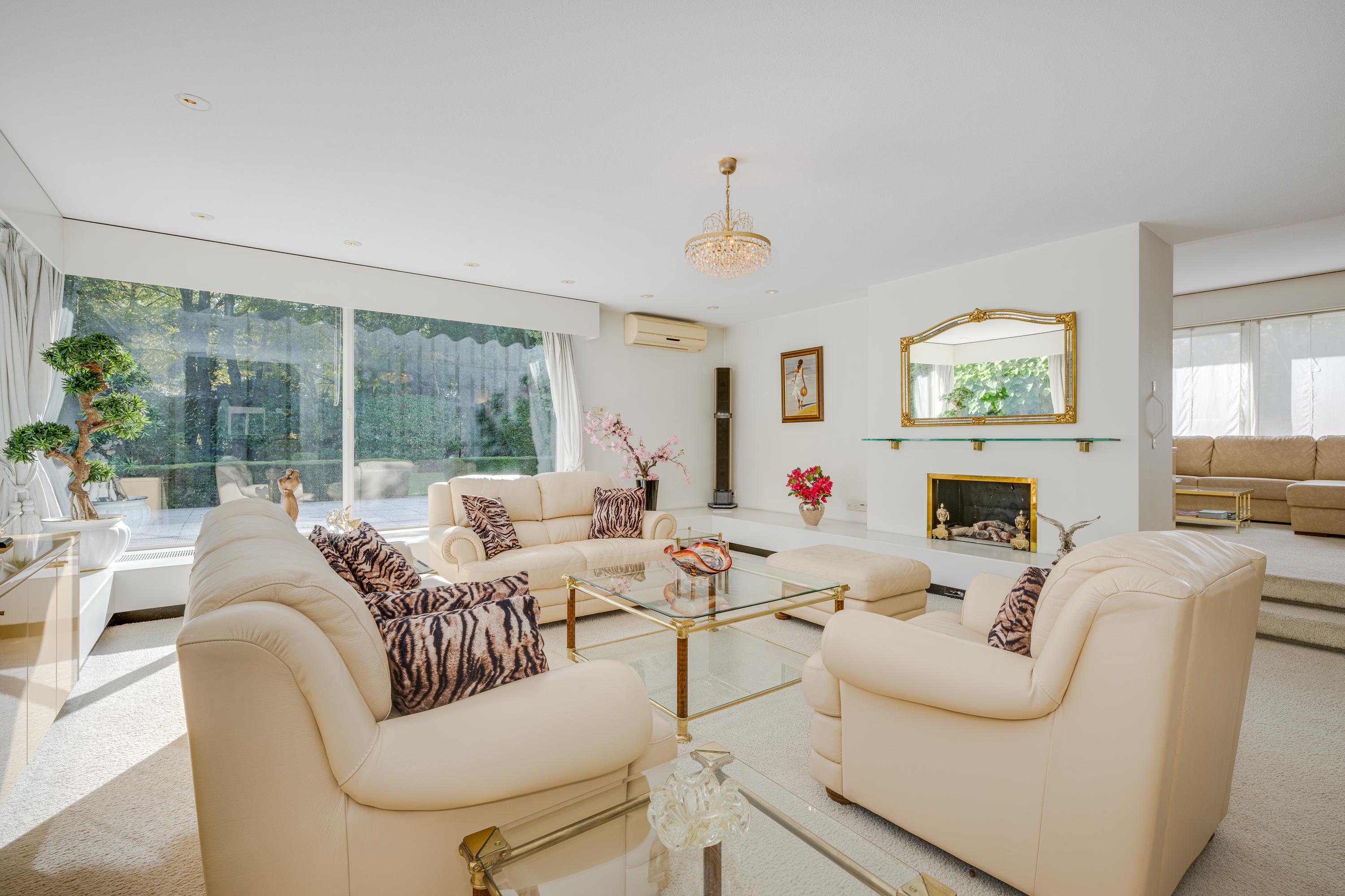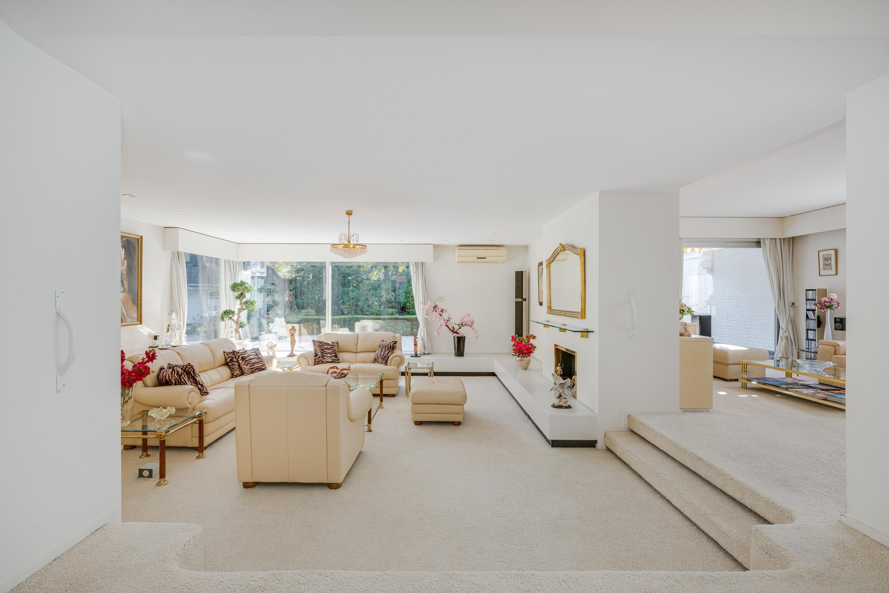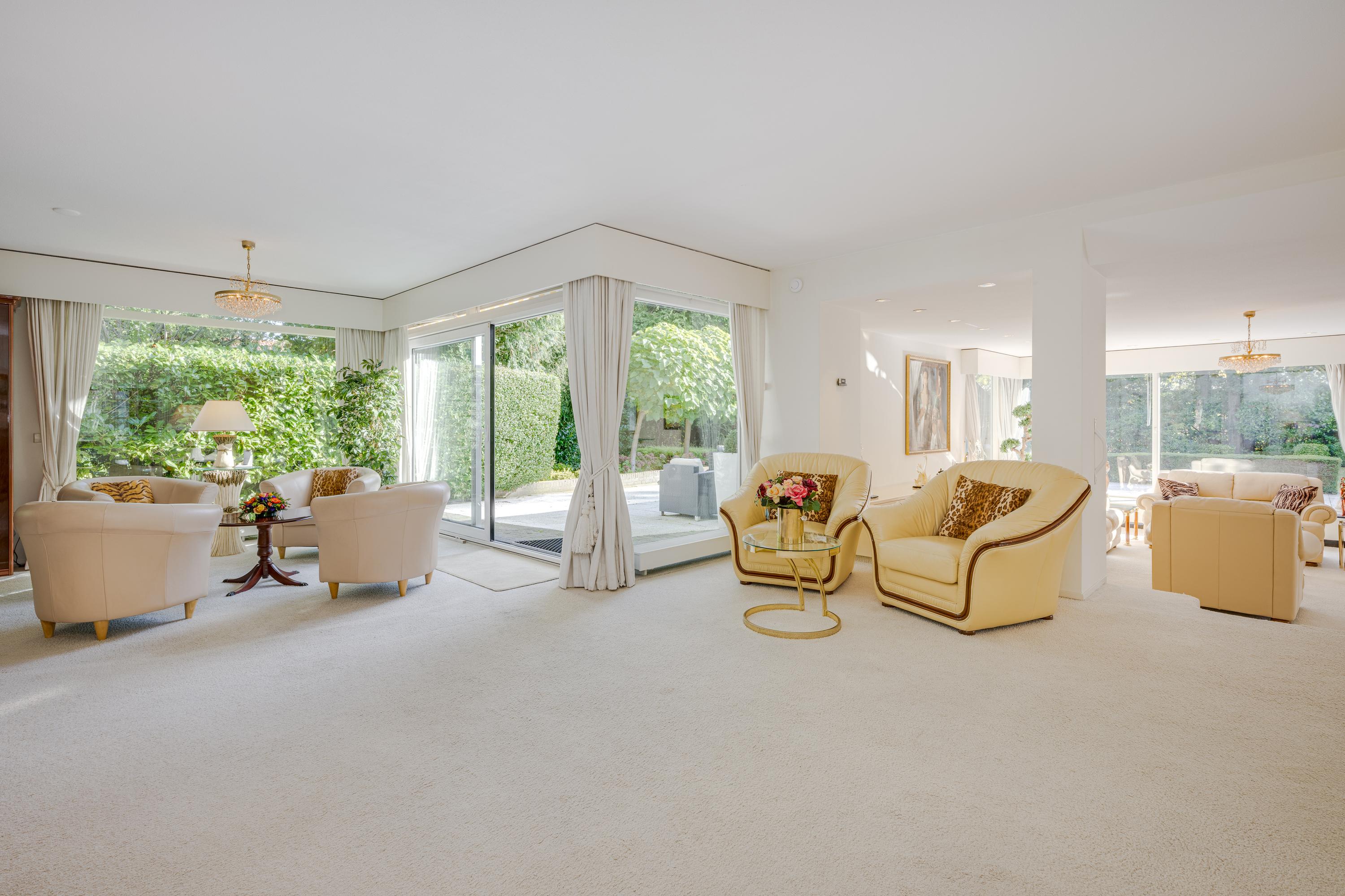 Layout: As you enter the villa, you are welcomed by a bright and spacious entrance hall with a double-height ceiling, highlighted by a grand staircase, where a luxurious high-pile carpet leads you into the living area. There is ample closet space available in the hallway. Walking straight ahead, you enter the living area consisting of a dining room, a living room, and a family room/TV room. The living room features a cosy fireplace. Together, these spaces cover more than 100 m2! Thanks to the large windows and good ceiling height, the rooms feel light and spacious. The house is surrounded by greenery, visible from the large windows in every room.