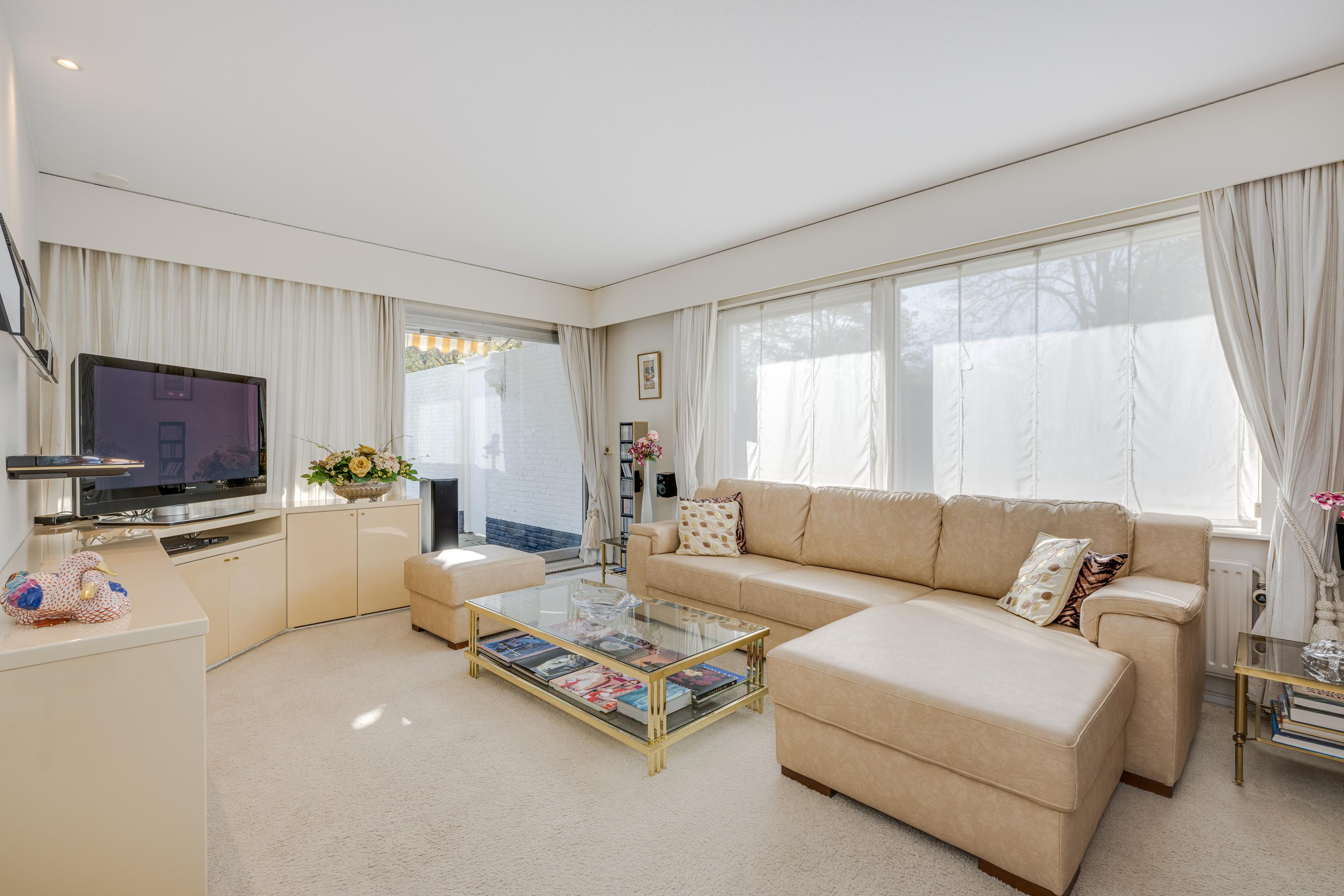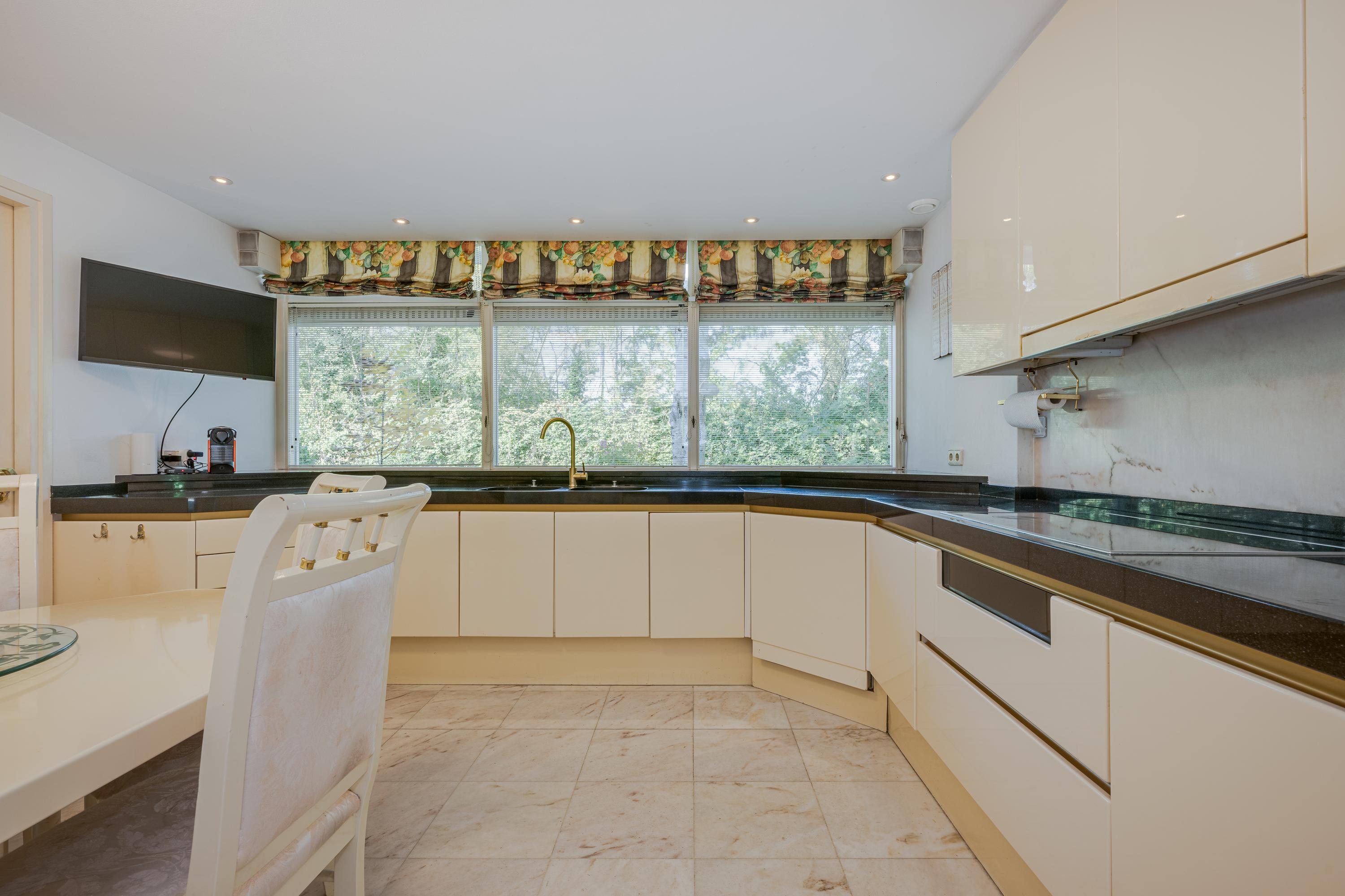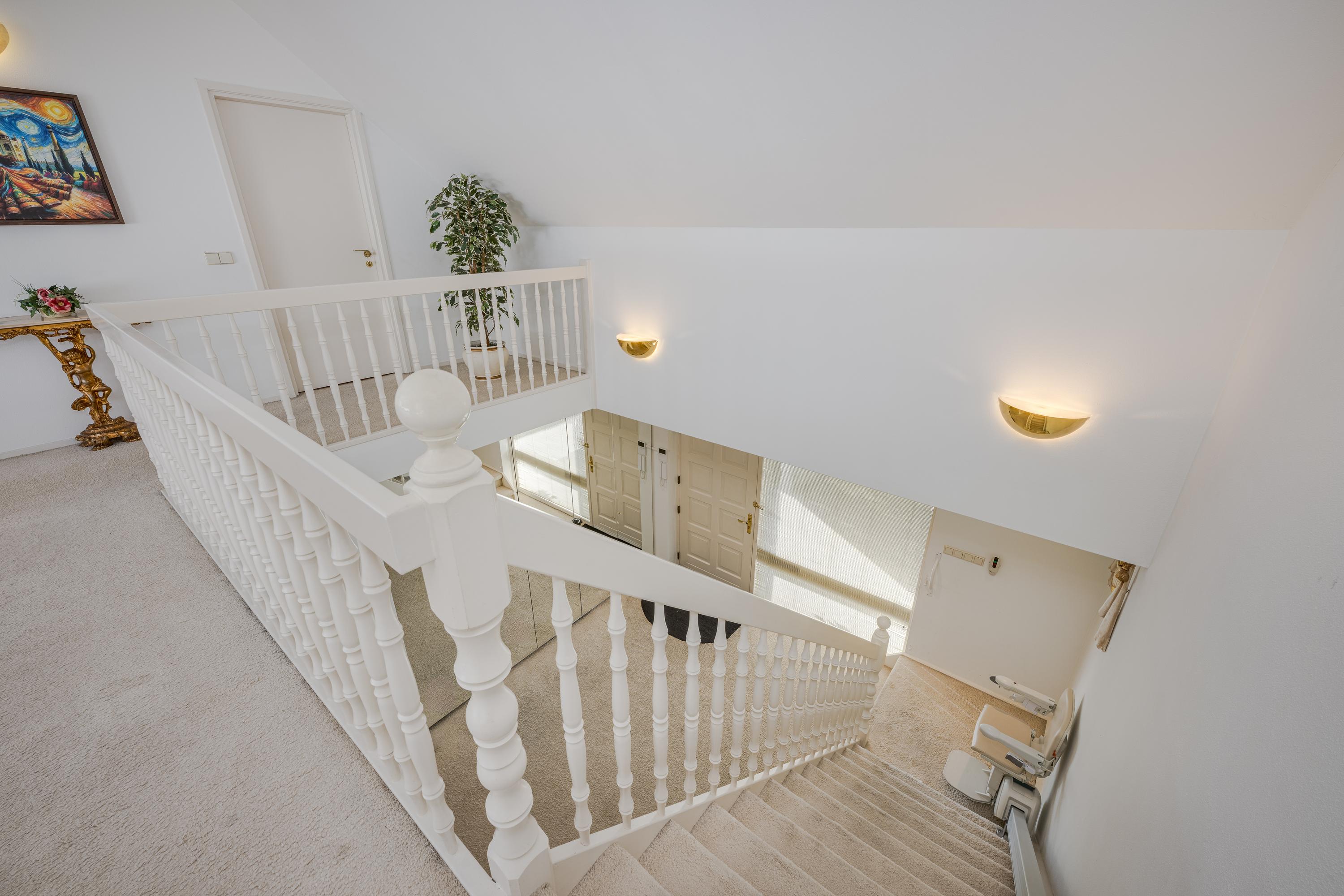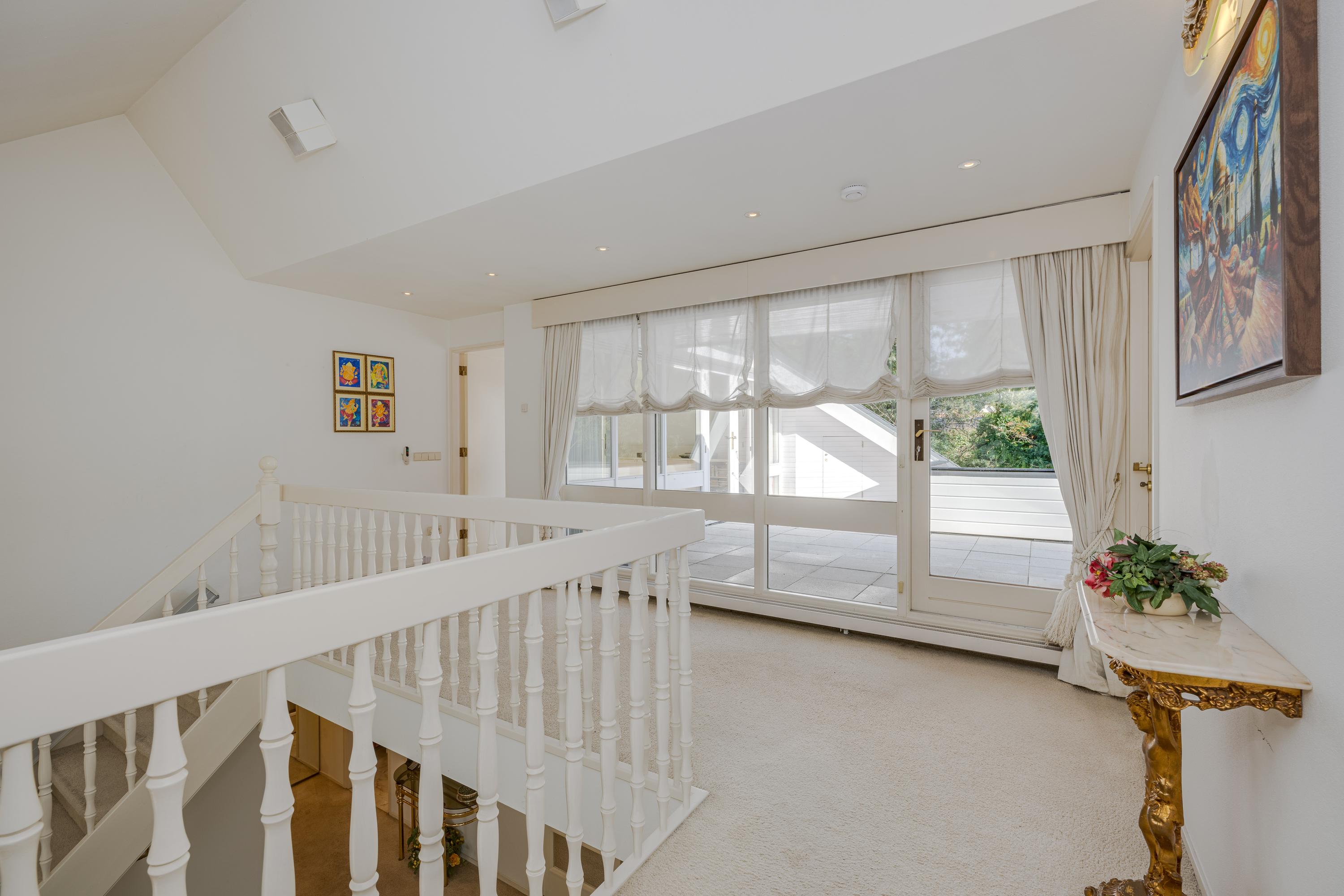 Layout: As you enter the villa, you are welcomed by a bright and spacious entrance hall with a double-height ceiling, highlighted by a grand staircase, where a luxurious high-pile carpet leads you into the living area. There is ample closet space available in the hallway. Walking straight ahead, you enter the living area consisting of a dining room, a living room, and a family room/TV room. The living room features a cosy fireplace. Together, these spaces cover more than 100 m2! Thanks to the large windows and good ceiling height, the rooms feel light and spacious. The house is surrounded by greenery, visible from the large windows in every room.