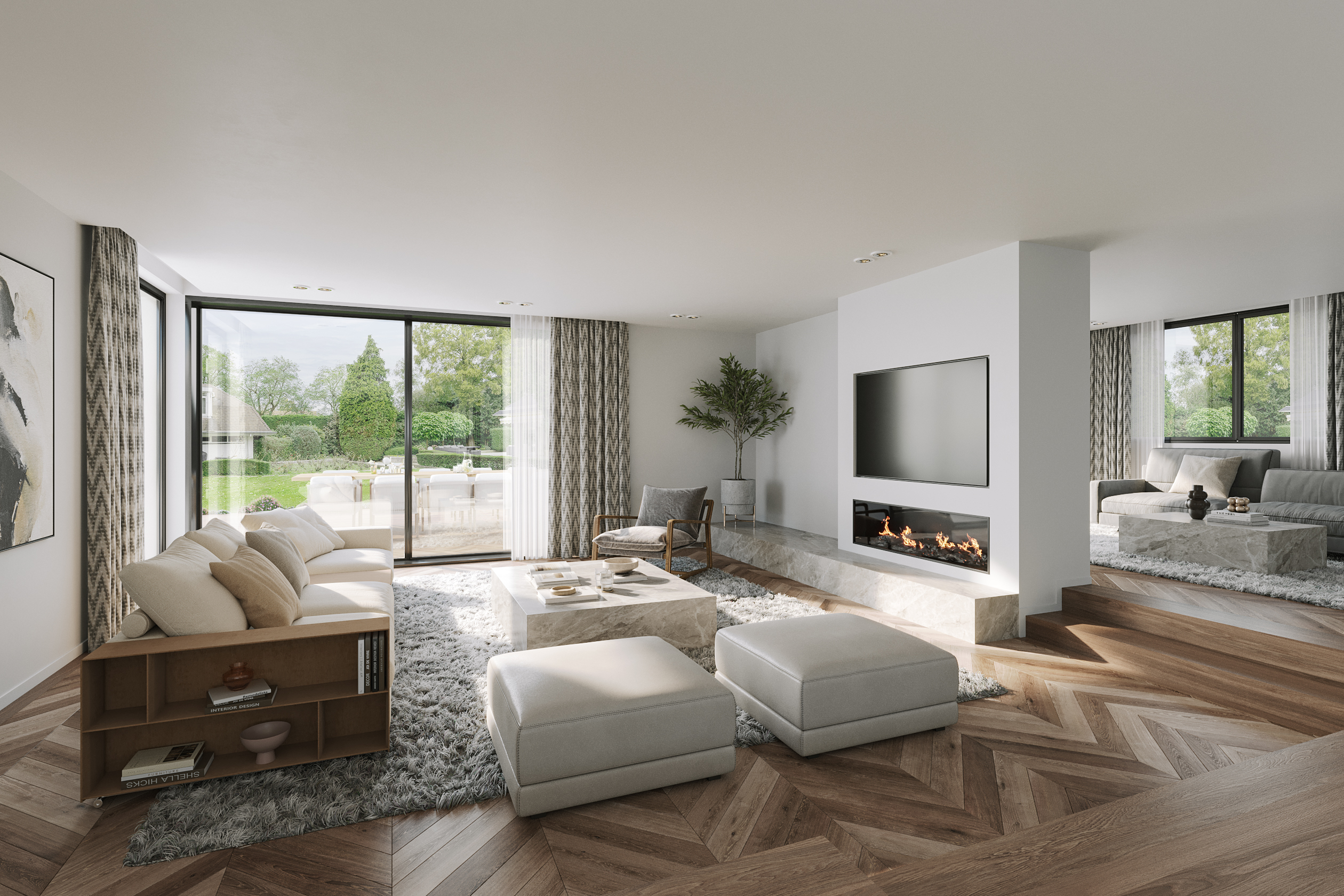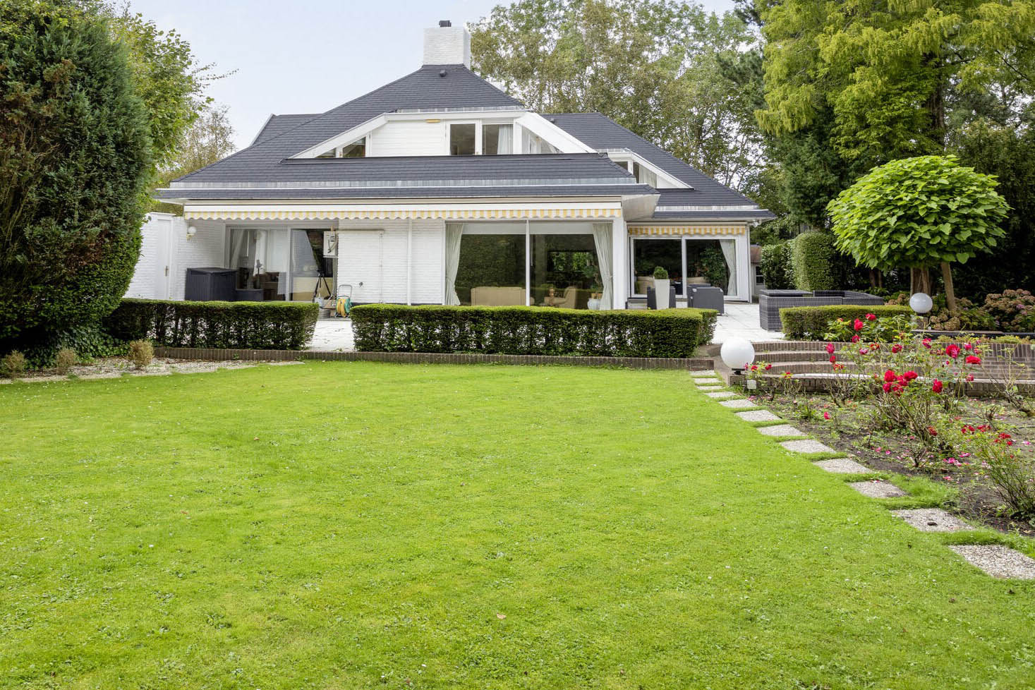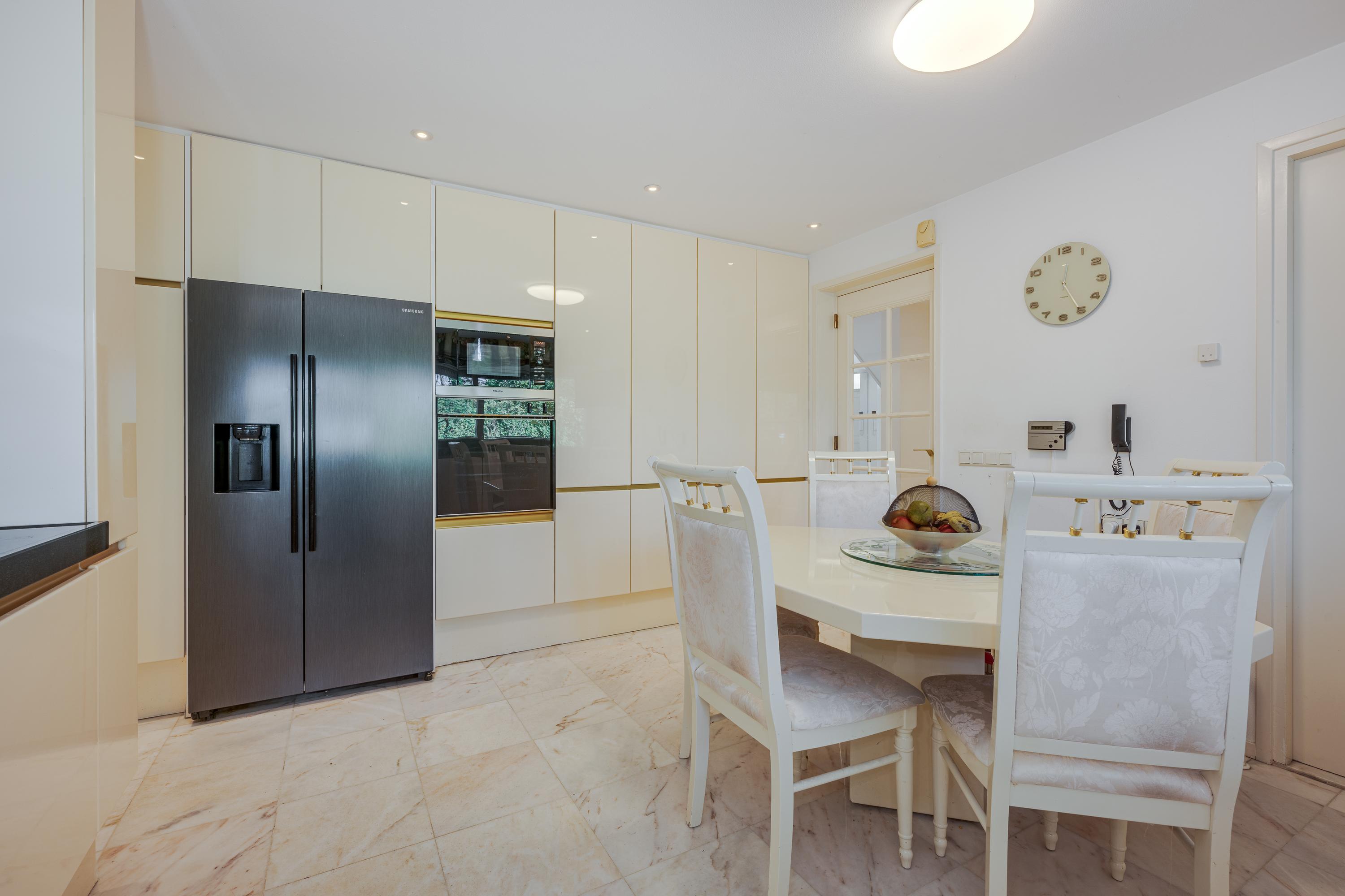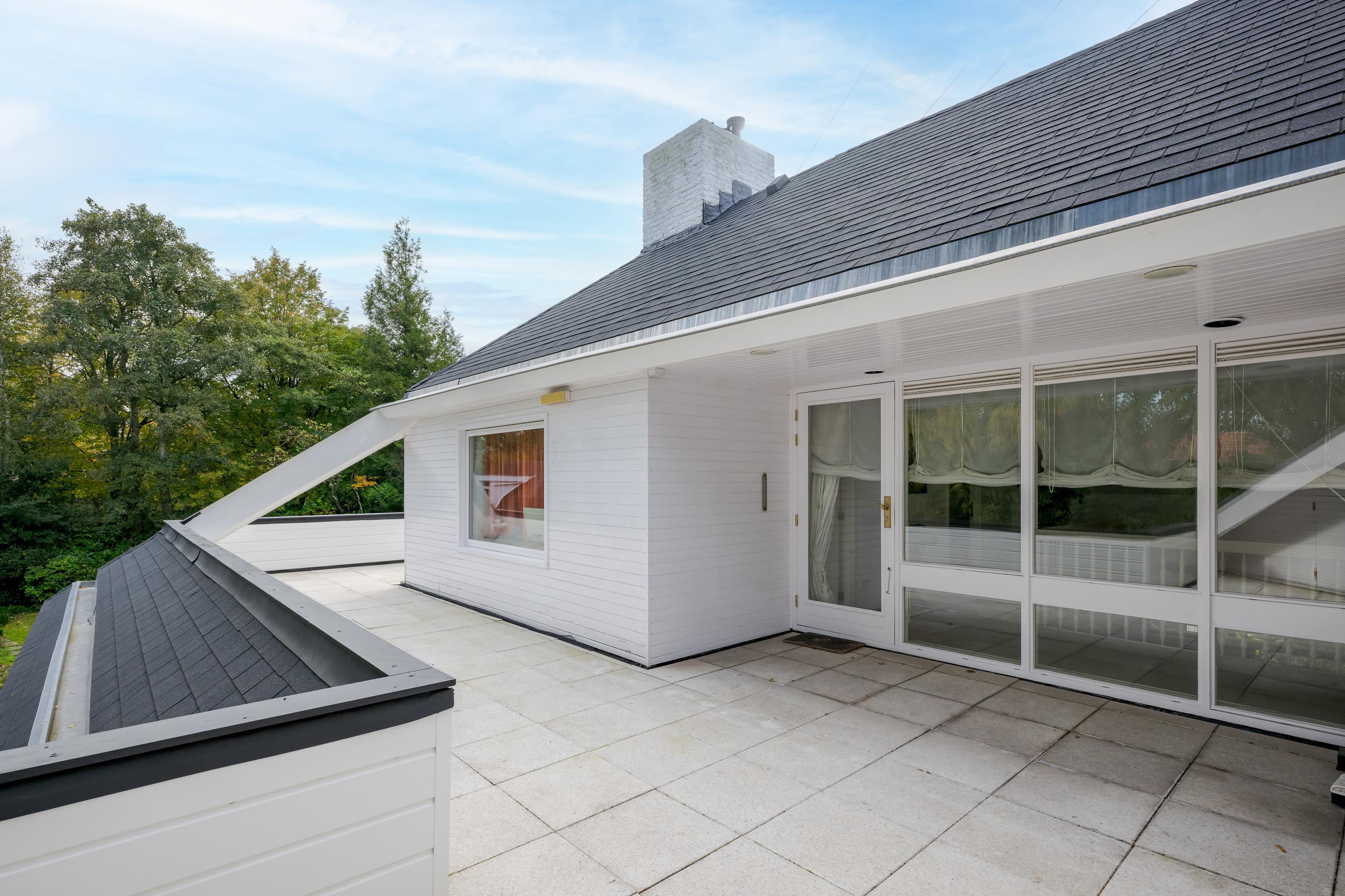 Layout: As you enter the villa, you are welcomed by a bright and spacious entrance hall with a double-height ceiling, highlighted by a grand staircase, where a luxurious high-pile carpet leads you into the living area. There is ample closet space available in the hallway. Walking straight ahead, you enter the living area consisting of a dining room, a living room, and a family room/TV room. The living room features a cosy fireplace. Together, these spaces cover more than 100 m2! Thanks to the large windows and good ceiling height, the rooms feel light and spacious. The house is surrounded by greenery, visible from the large windows in every room.