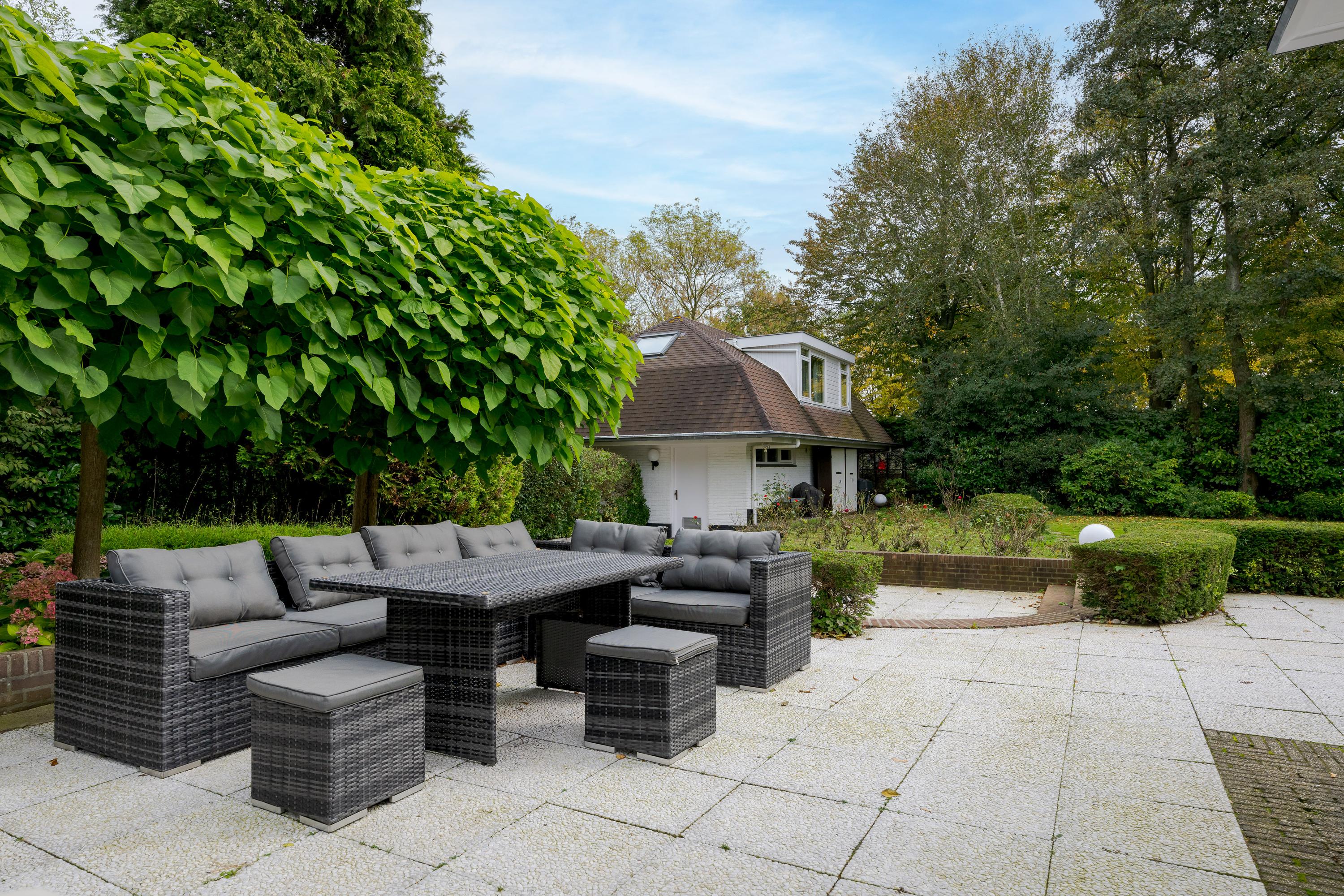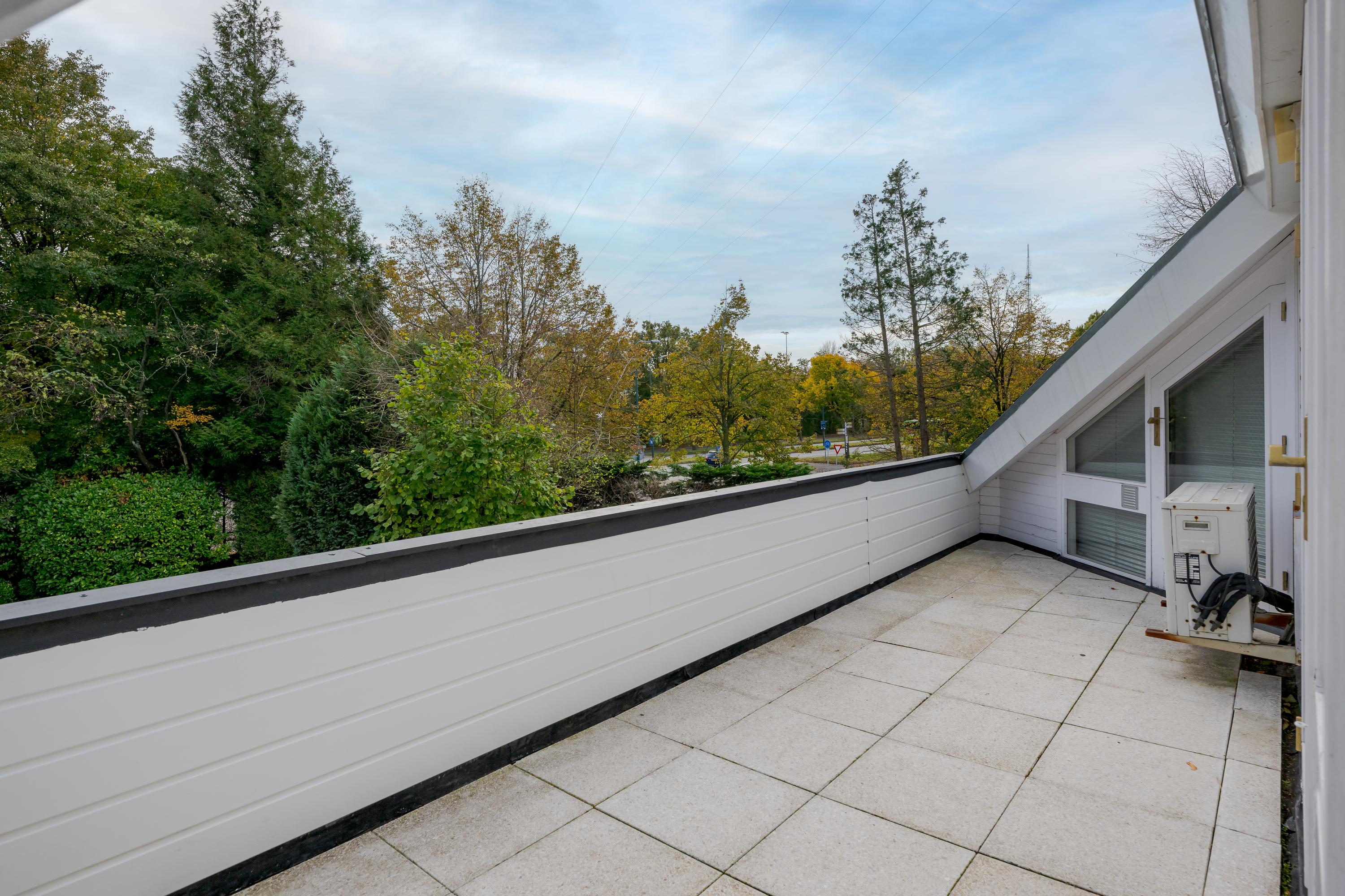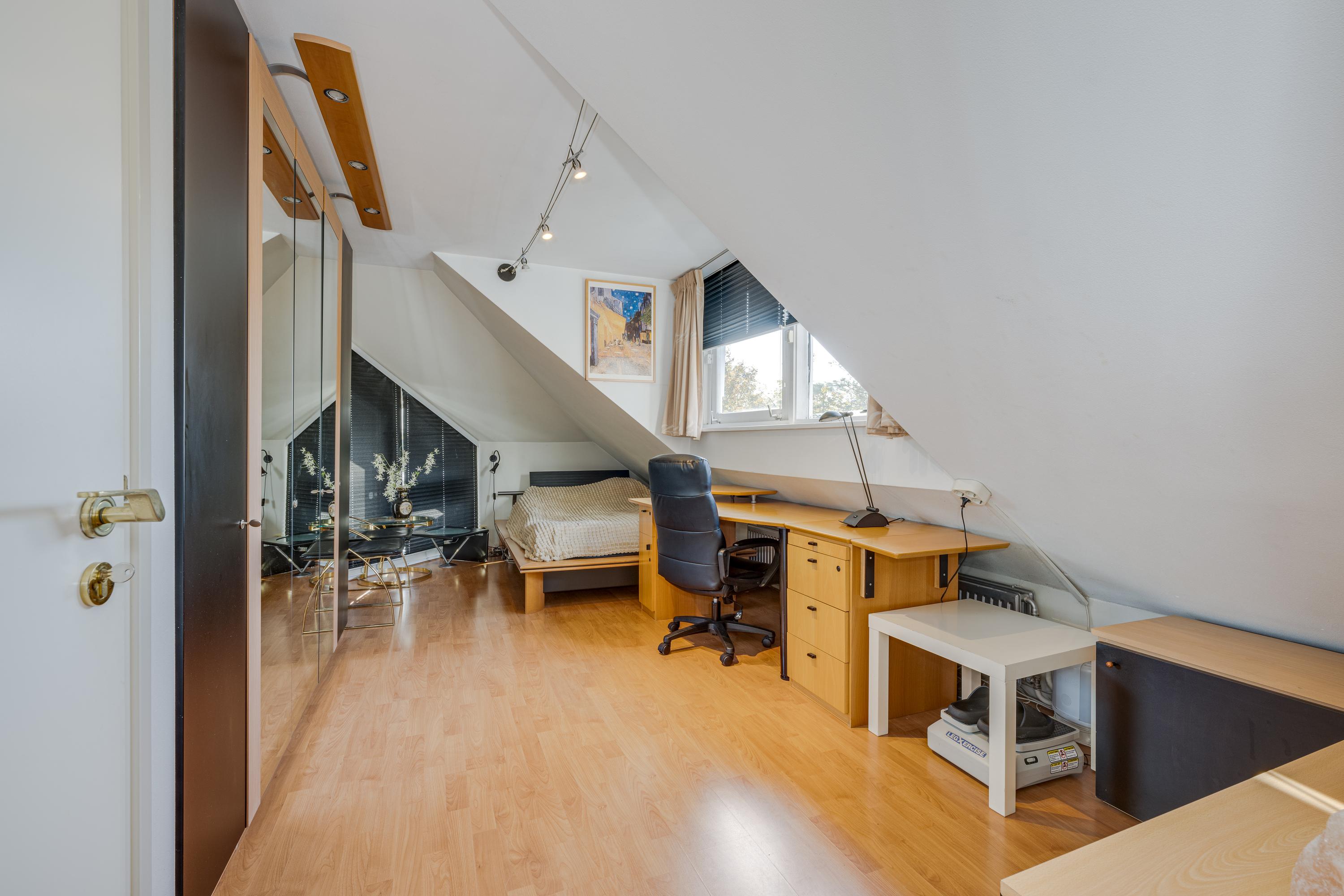 The outbuilding has its own address: Mariahoevelaan 1. One part consists of a spacious garage with fitted wardrobes and the setup for central heating, washing machine, and dryer. The other part has its own entrance on the ground floor, with a living area, kitchen, and a bathroom with toilet, shower, and washbasin. On the first floor, you will find a spacious and bright living room and a bedroom.