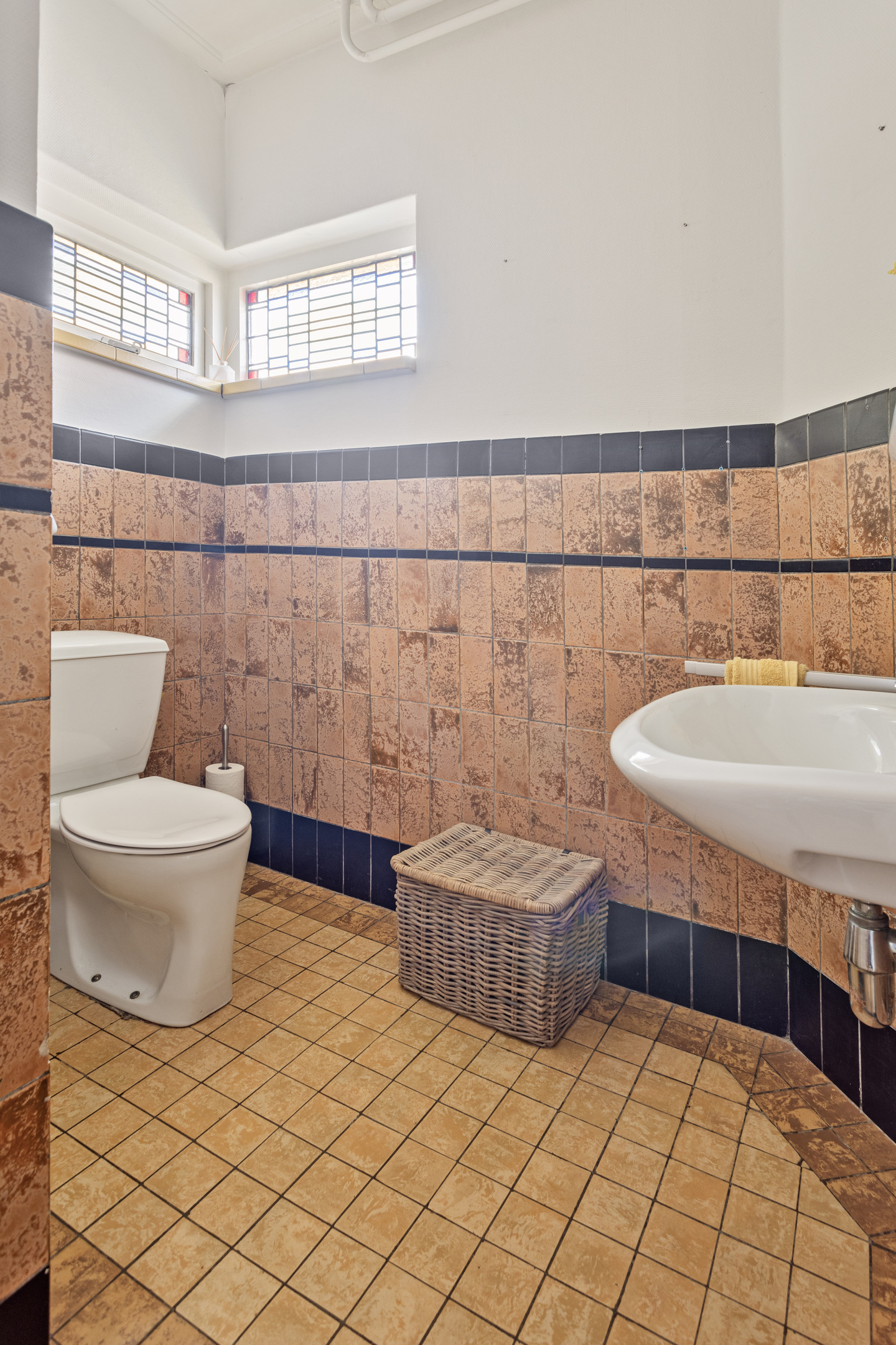 A large landing with a mezzanine grants access to four bedrooms, two of which include built-in wardrobes. The fully tiled bathroom features a shower, double sink, bathtub, and a built-in cabinet housing the central heating system. There is also a separate toilet with washbasin off the landing.