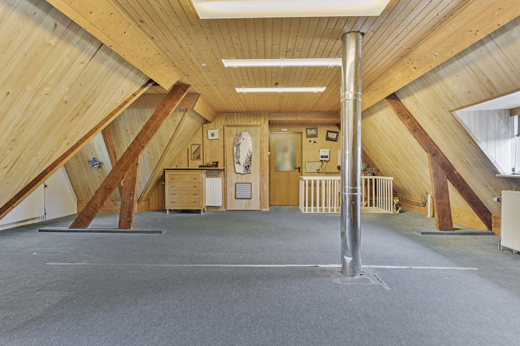 Toward the rear of the house is the garden-facing living room with double doors opening onto the terrace—ideal for enjoying the view of the lush garden. This space features a cozy open fireplace and leads to a separate room currently used as a TV lounge, though it's equally suited as a playroom, studio, or home office. A side entrance opens to a utility room with washer/dryer connections and leads into a brick-built storage room. Above this area is an additional room, currently used as an office, which could also serve well as a fifth bedroom thanks to the dormer window and roof lights.