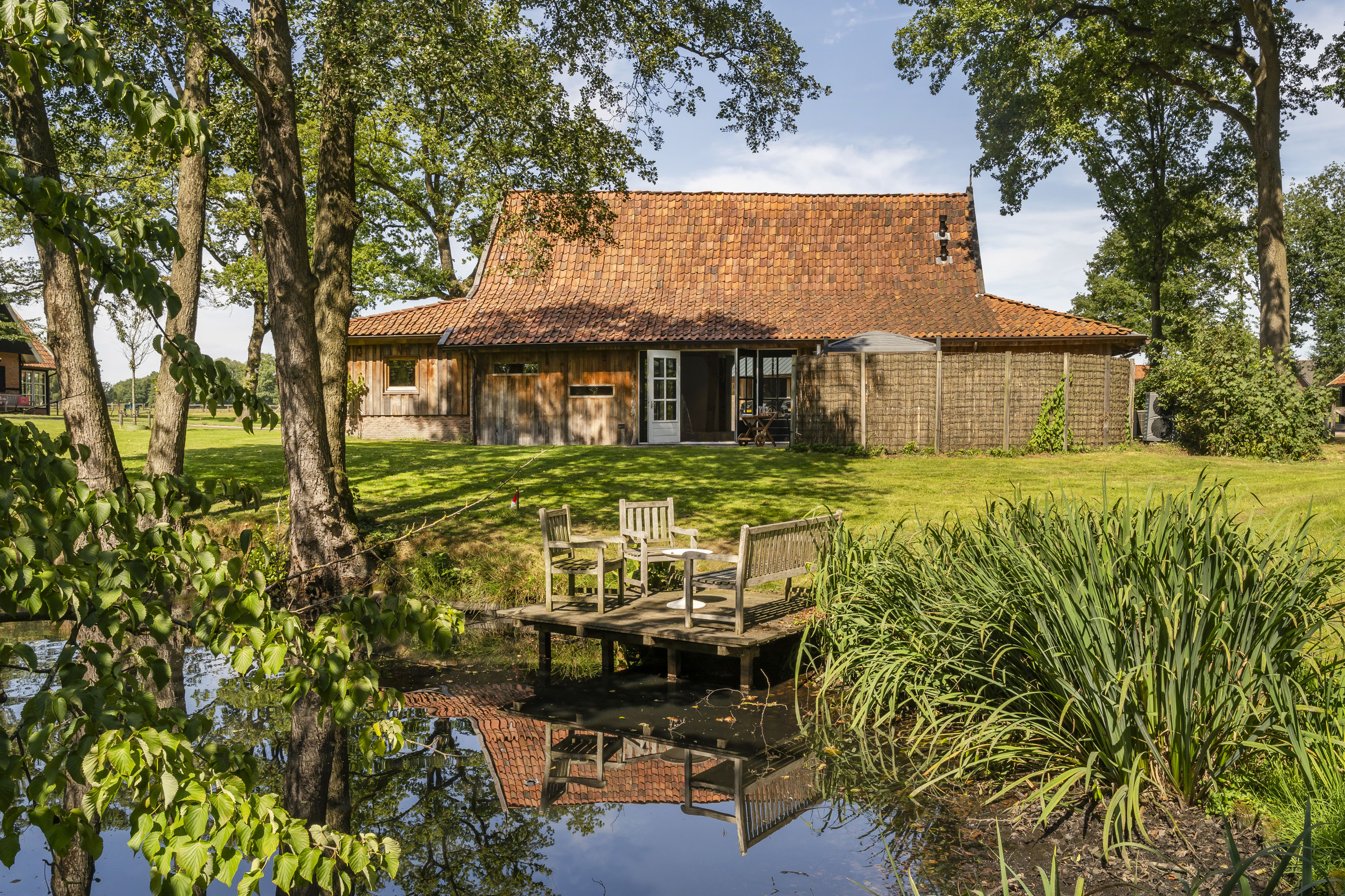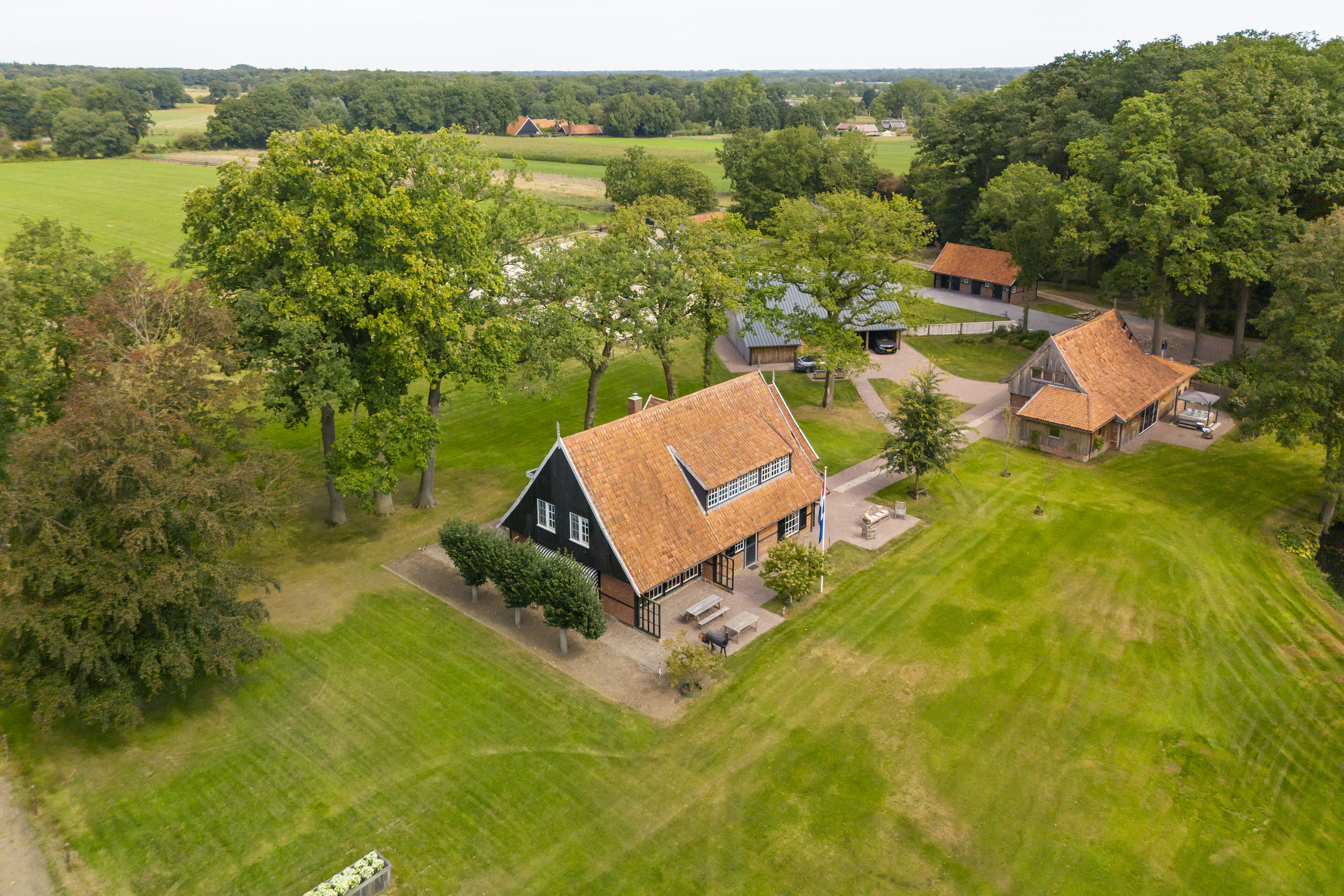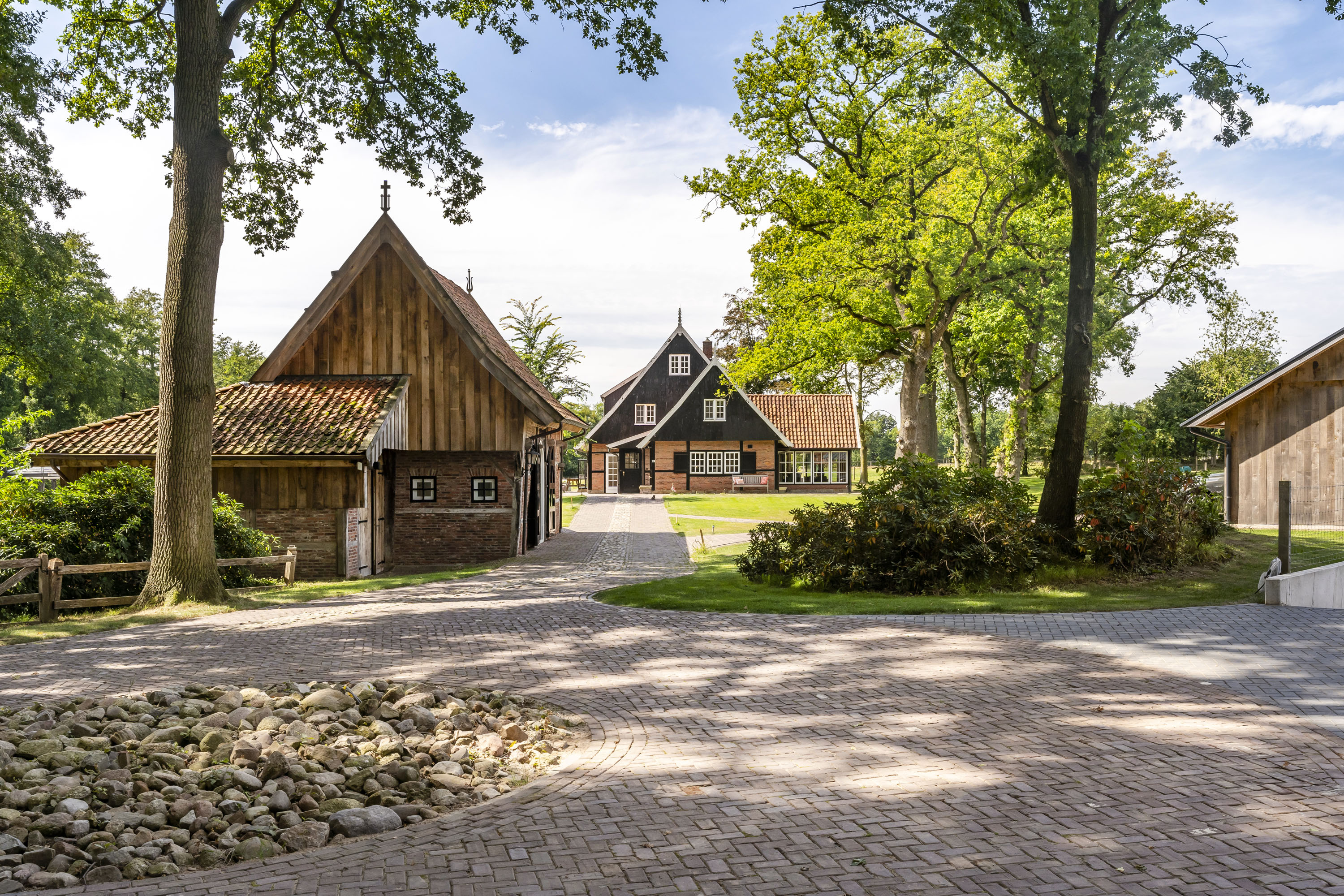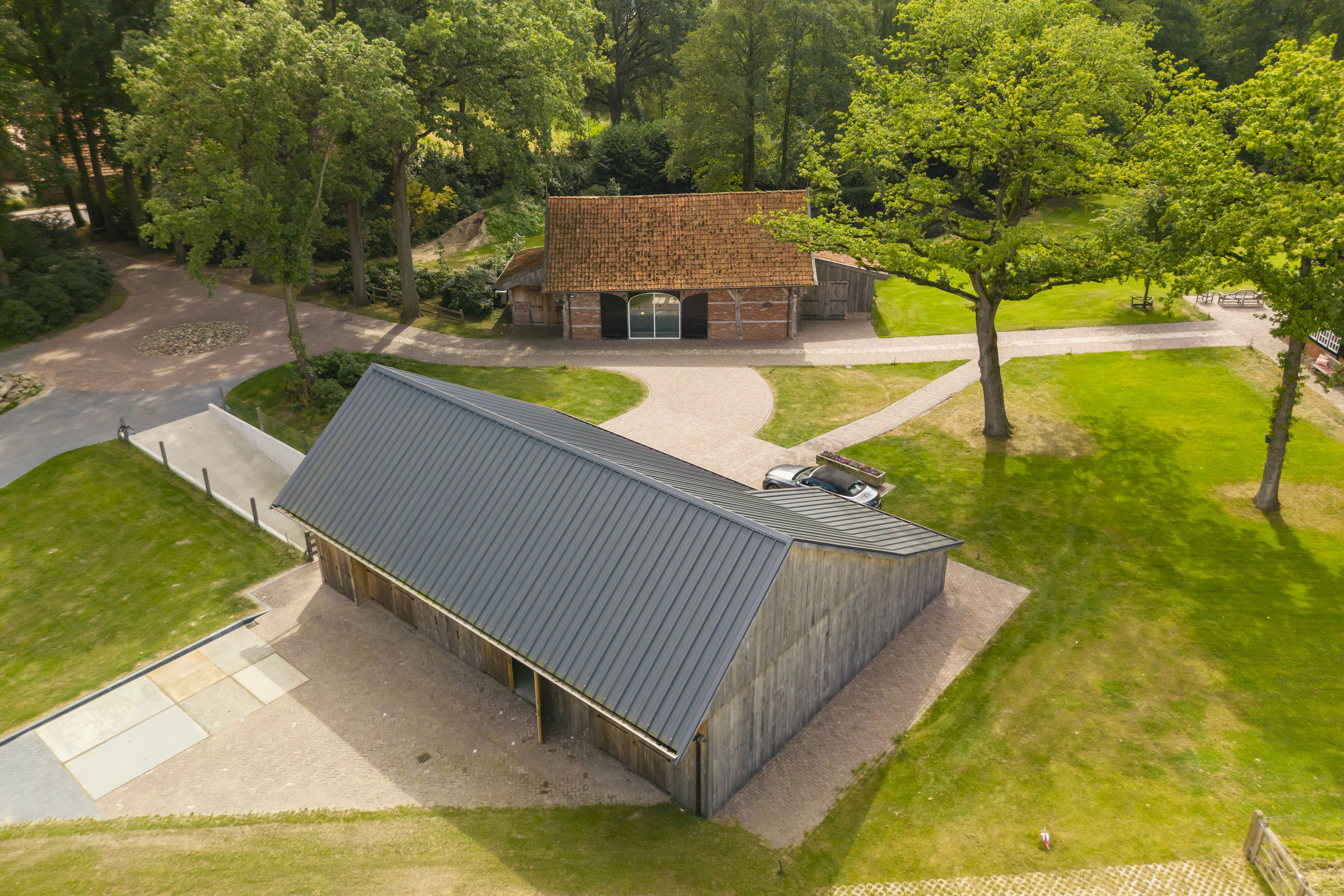 Enkele jaren geleden is een nieuwe multifunctionele schuur op het erf verrezen. Opgetrokken uit eikenhouten gebinten en wanden, sluit dit bouwwerk qua uiterlijk naadloos aan op het klassieke Twentse landschap en verbergt het de luxe en moderne voorzieningen die aanwezig zijn. Het gebouw is geheel onderkelderd en voorzien van een verwarmde hellingbaan, waardoor het geschikt is om werktuigen, groot of klein binnen te stallen. Bovendien is het volledig geïsoleerd zodat het dienst kan doen als atelier, stalling van oldtimers of andere ruimtevragende activiteiten. Maar ook een kantoor of stijlvolle herenkamer behoort tot de mogelijkheden.