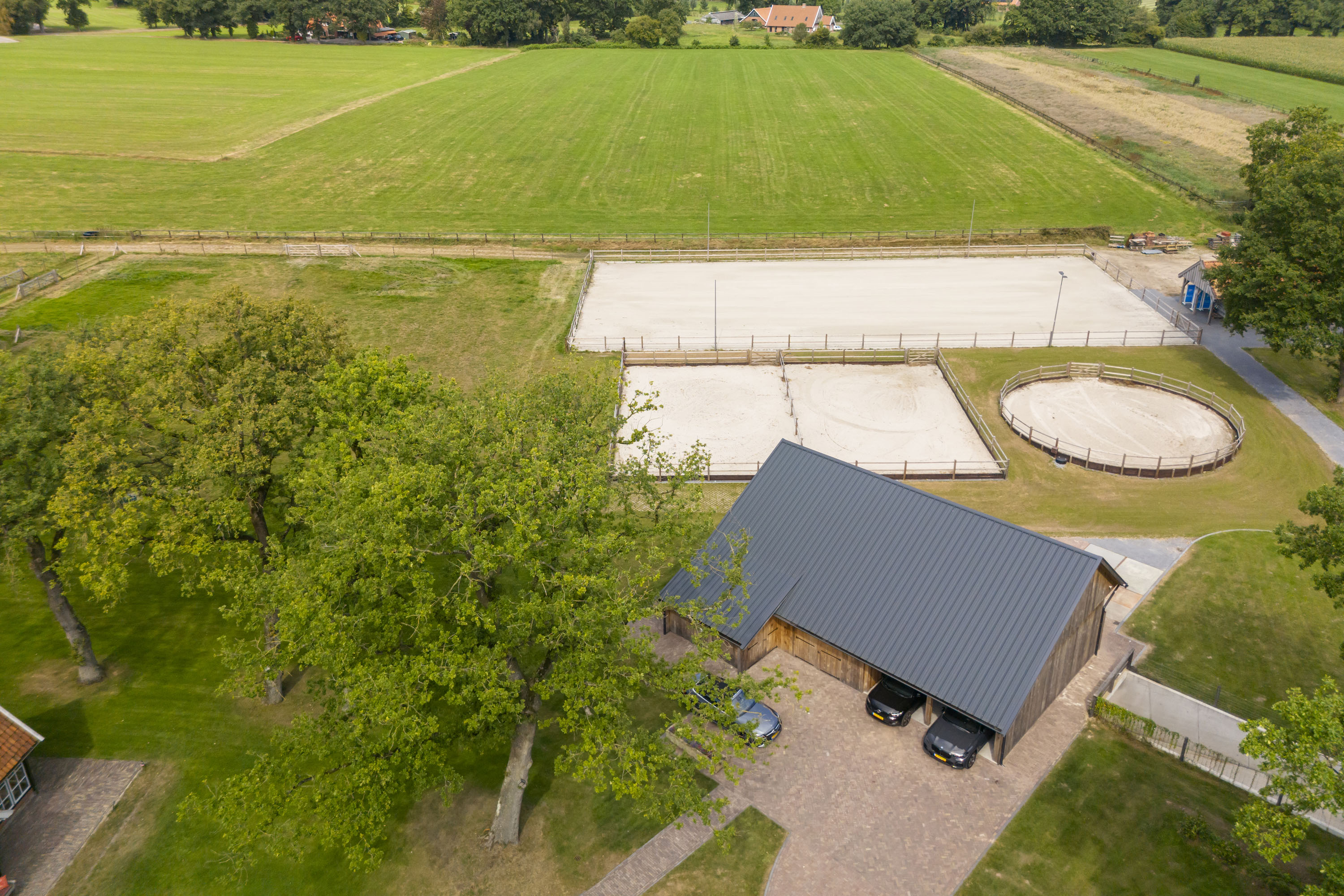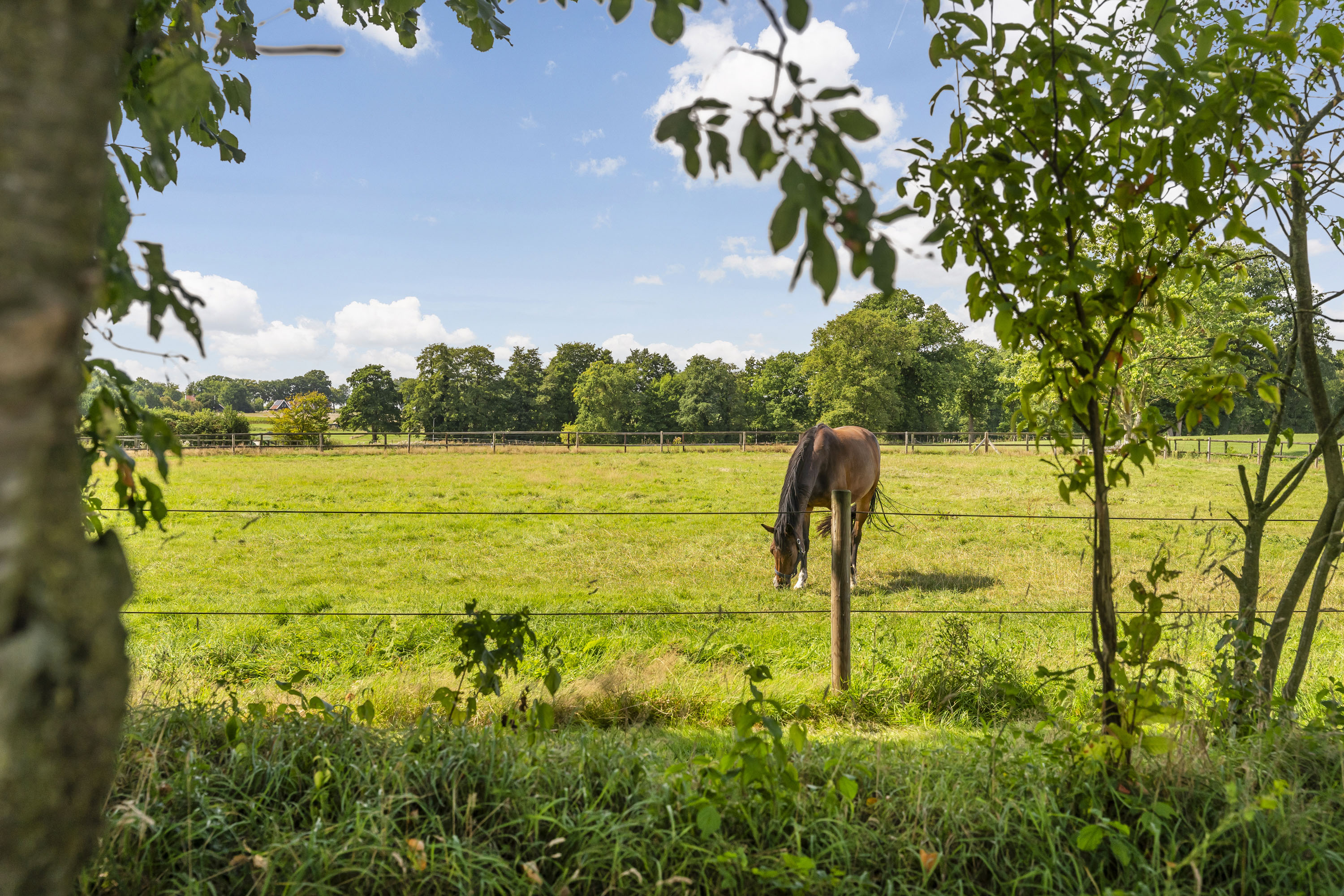 En dan zijn er nog de ruime weides. Keurig in het hout gezet, voorzien van robuuste hekken, zodat er ook eenvoudig groot materieel in en uit kan rijden. De paden er naar toe zijn semiverhard met puingranulaat zodat dit jaarrond zonder schade aan het terrein kan plaatsvinden.