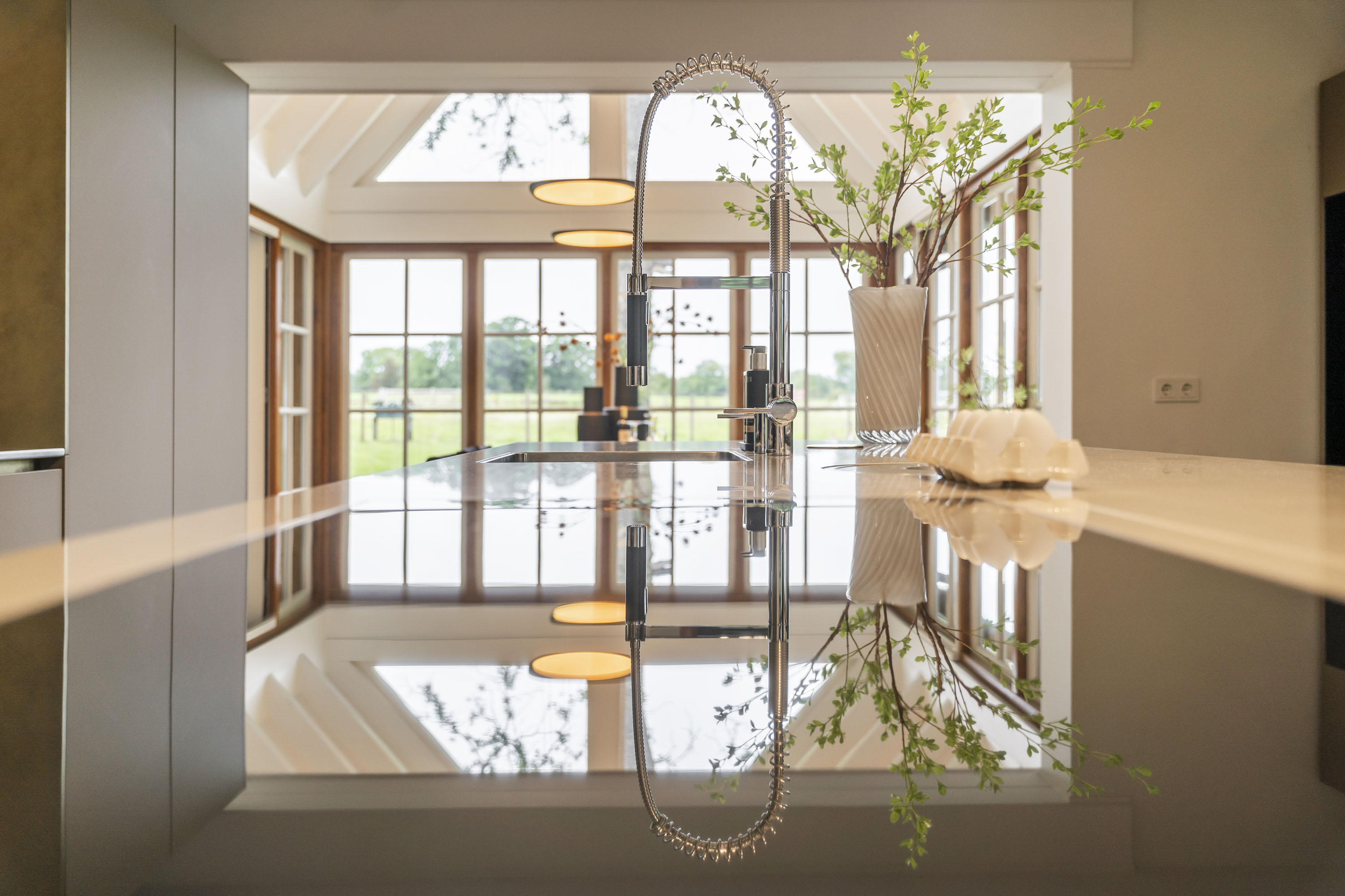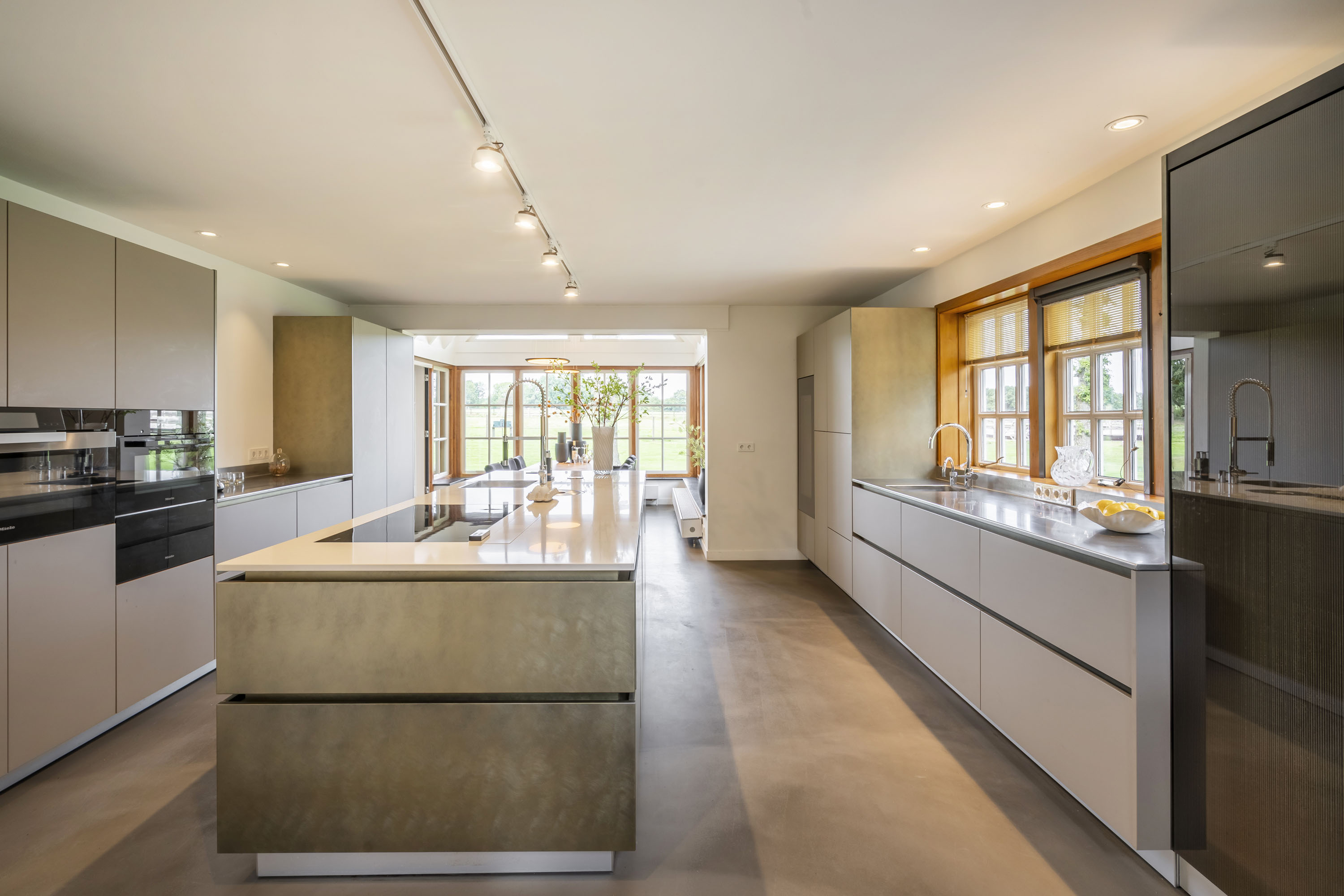 - royale leefkeuken met o.a. modern kookeiland en inbouwkeuken voorzien van composiet en RVS werkblad en luxe inbouwapparatuur waaronder oven, stoomoven, magnetron, koelkast, vriezer, vaatwasser, Quooker, en wijnkast. Volop ruimte om samen met familie of vrienden gezellig te dineren.