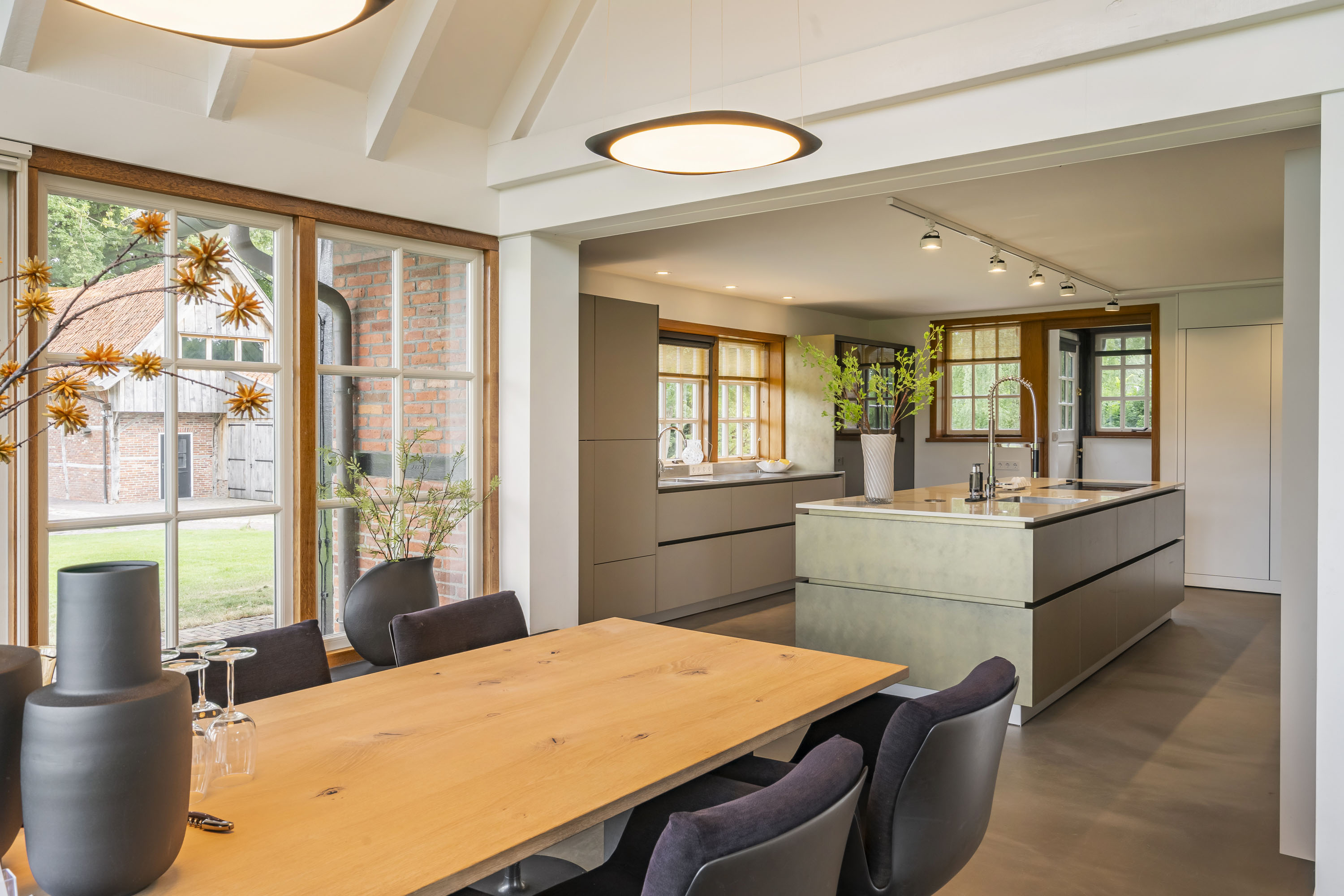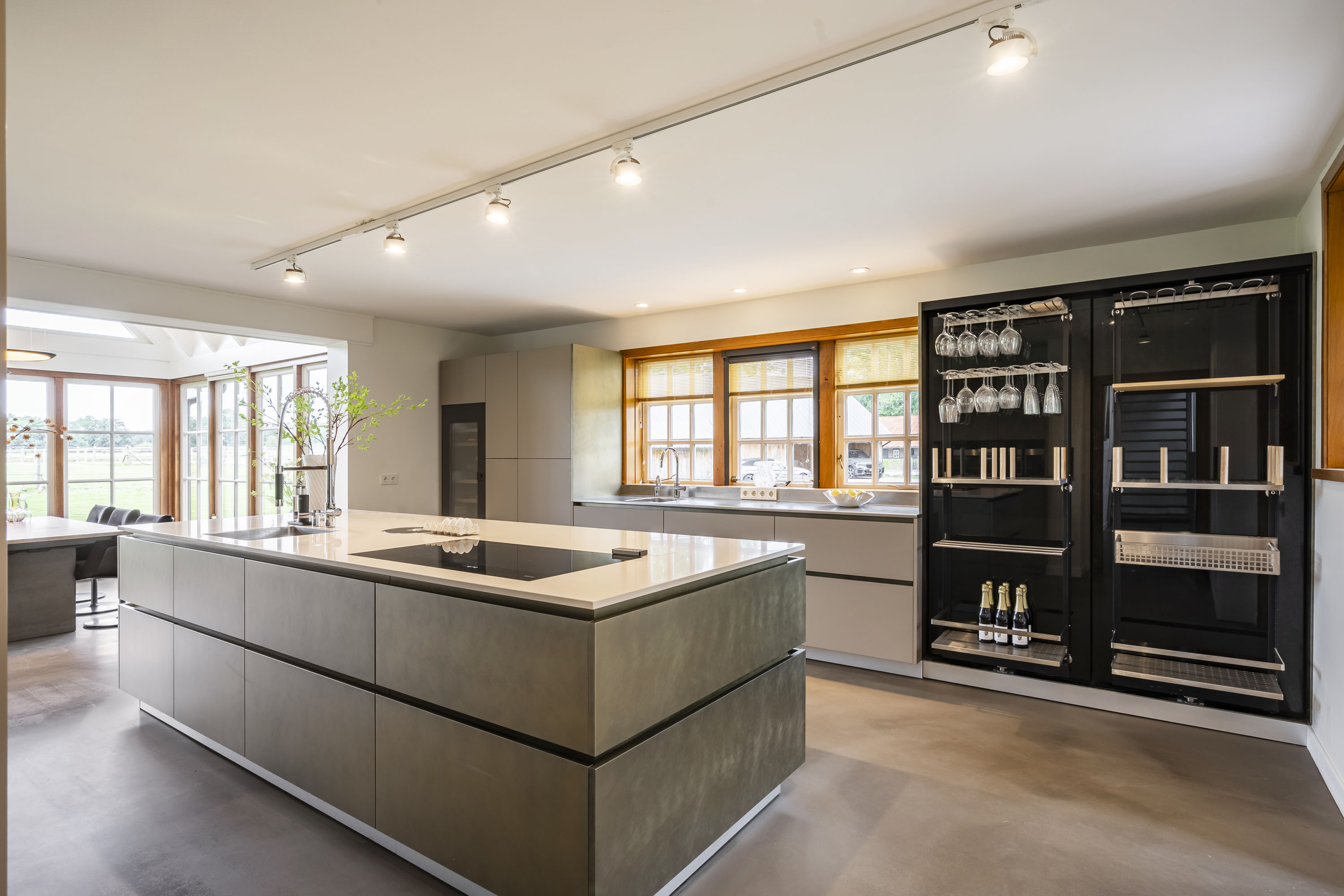 - aansluitend een grote serre, uitgevoerd in stijlvolle antracietkleurige kozijnen die in zijn geheel op kunnen worden gezet. Het eikenhout en de gietvloer combineren fraai en maken dit tot een geliefde multifunctionele ruimte;