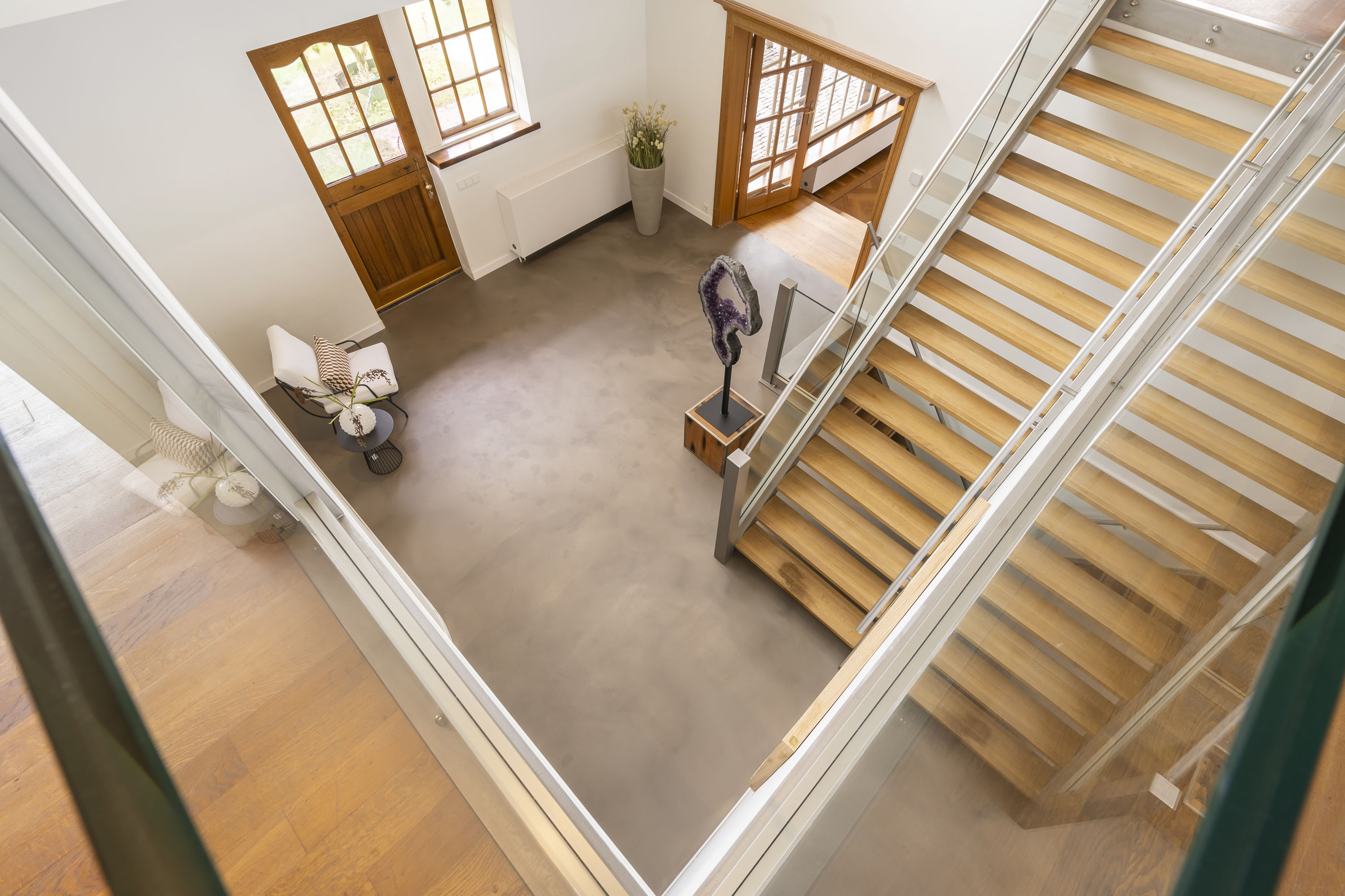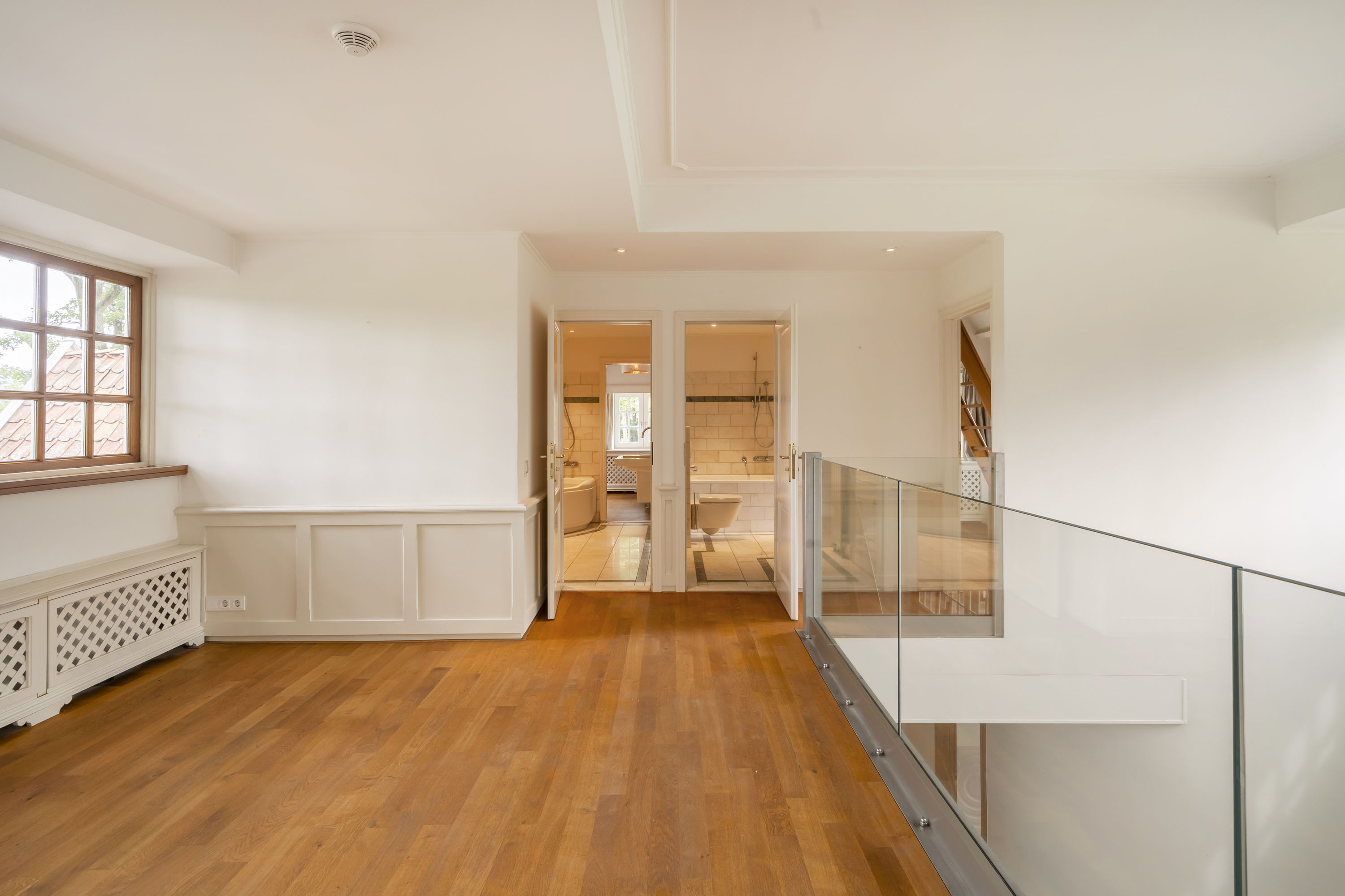 - de gehele bovenverdieping, met uitzondering van de badkamers, is voorzien van een massief eiken vloer.