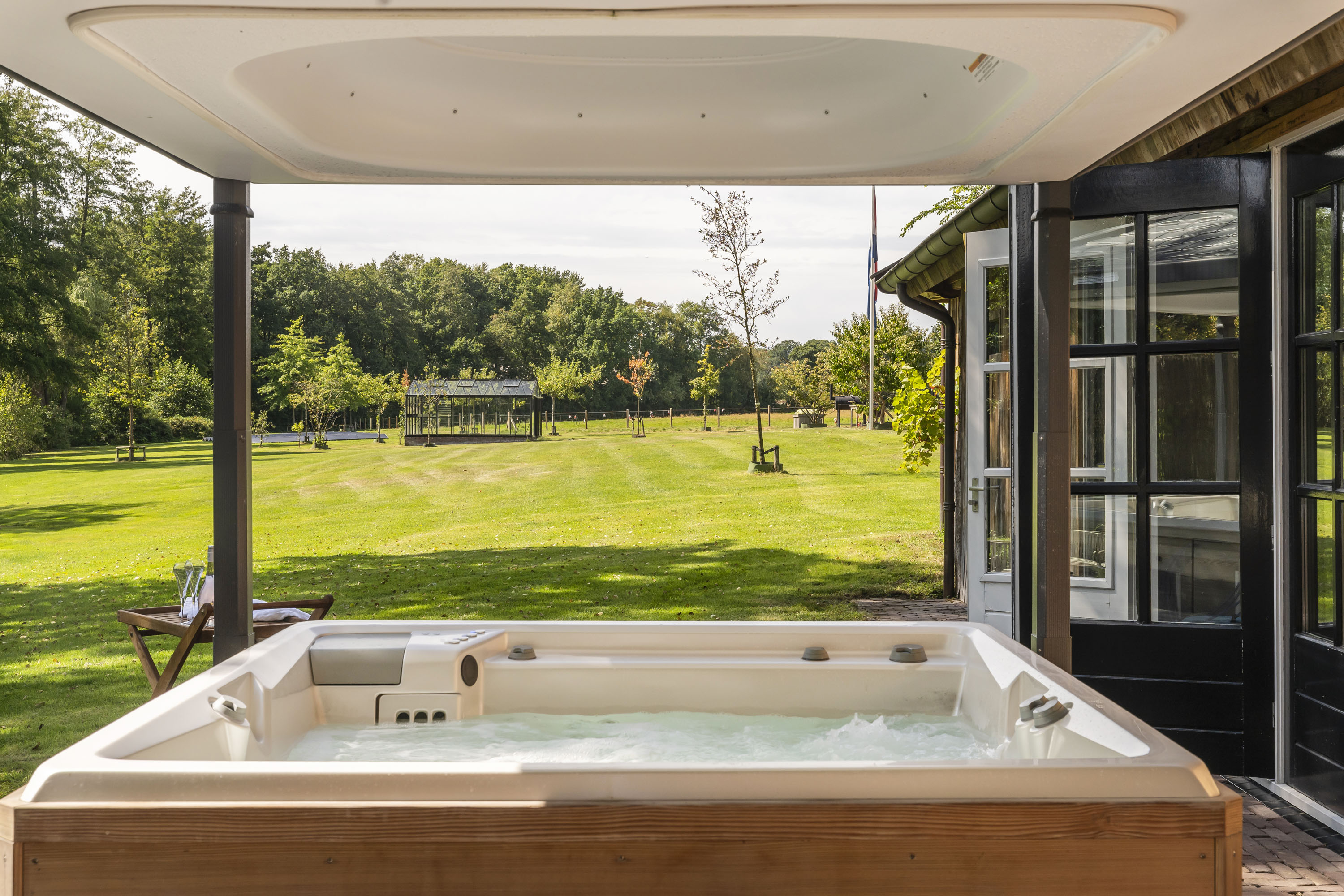Een karakteristiek bijgebouw vormt een oase van ontspanning. Hier treft u een royaal zwembad, luxe sauna, exclusieve douche- en kleedruimte. En als klap op de vuurpijl een jacuzzi op het aangrenzende buitenterras. De perfecte plek om in alle rust tot uzelf te komen of gasten op exclusieve wijze te ontvangen. De verdieping van dit gebouw leent zich er zelfs voor om een gastenverblijf te realiseren.