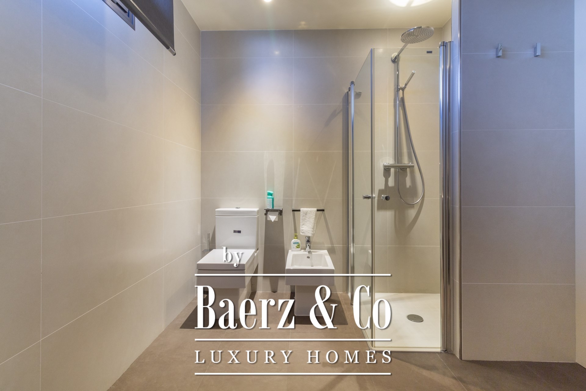 Outdoors, mature gardens surround the pool with its waterfall feature, a barbecue and outdoor kitchen, and expansive chill-out spaces. Underfloor heating, ducted air conditioning, electric windows, integrated audio, complete surveillance, and an elevator underscore the emphasis on comfort and security.