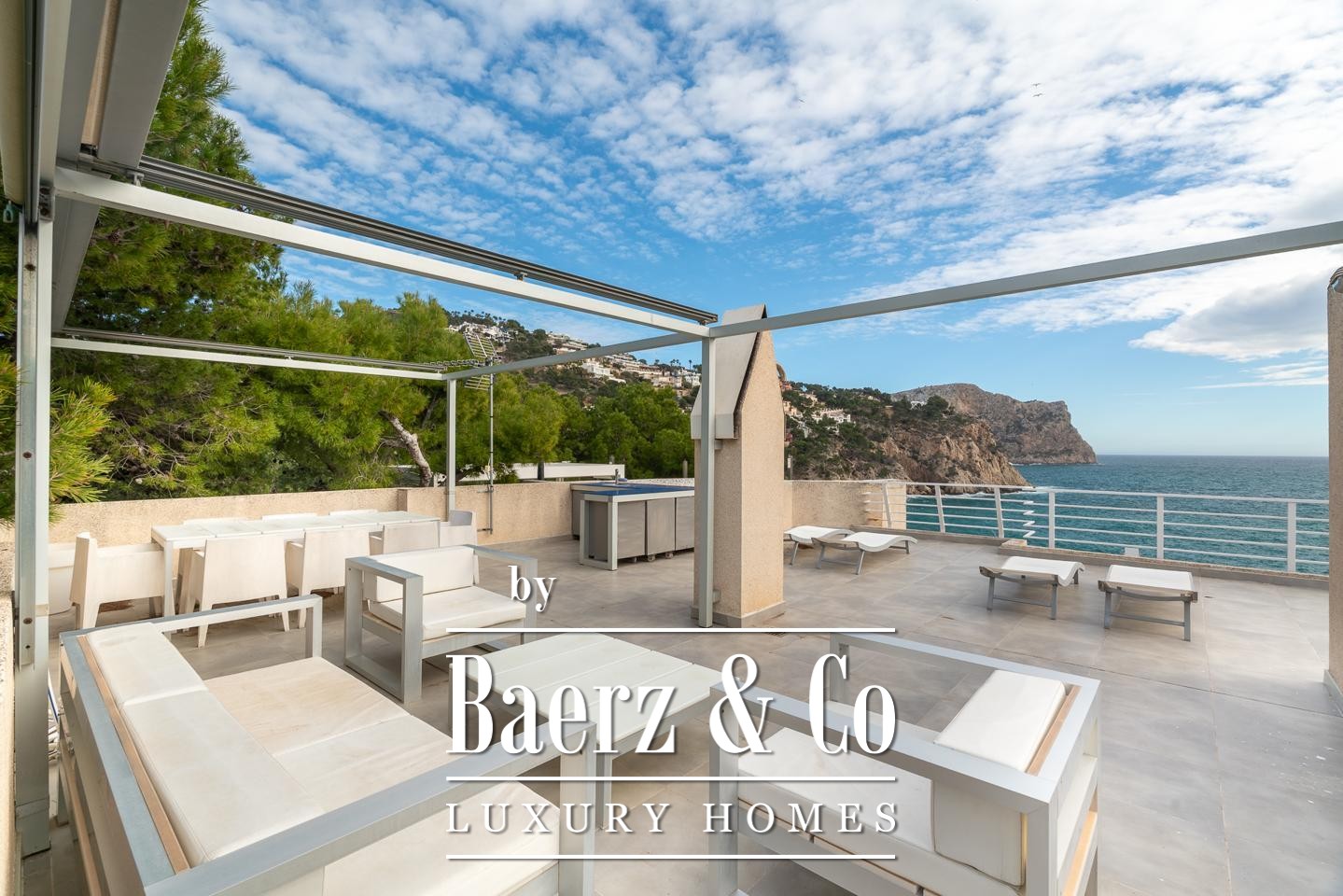 A private rooftop terrace crowns the home, inviting possibility for a tailored lounge with SPA or Jacuzzi, where sun and sky meet the deep blue of the sea. The southern orientation ensures sunlight throughout the day, while the elevated position captures evocative evening light and partial views of Dragonera Island, particularly vivid at sunset.