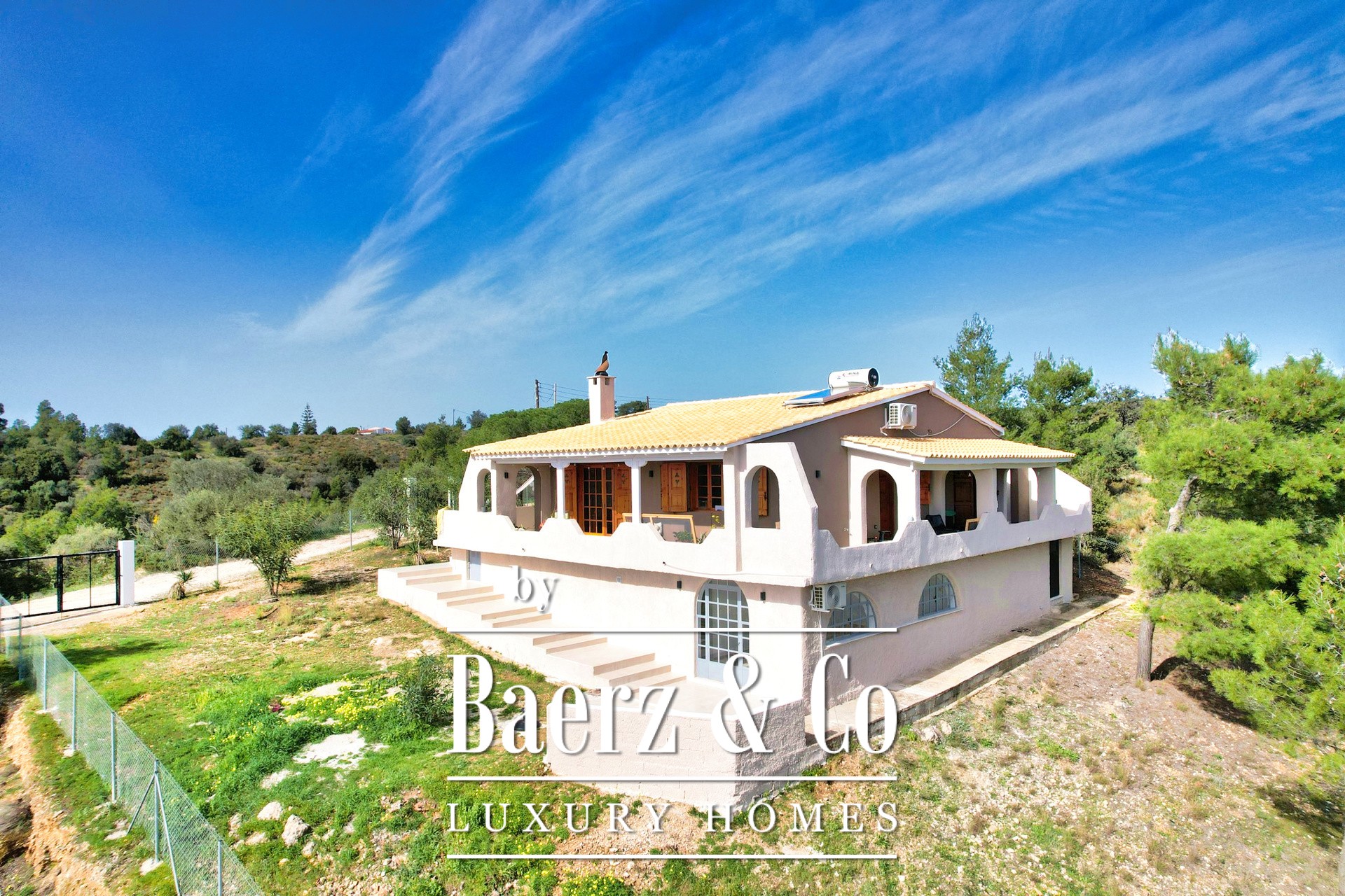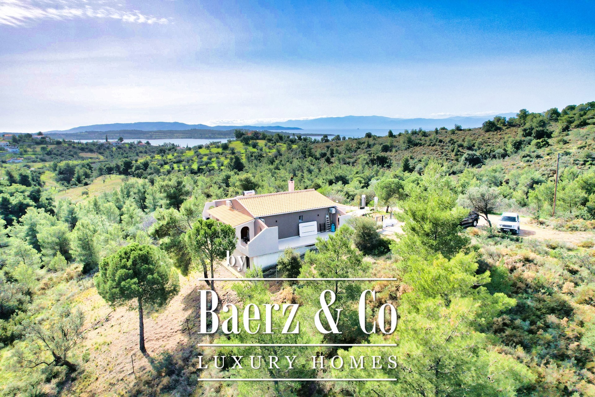 Detached house Portocheli presents a rare opportunity to experience refined living amidst natural beauty. This independent residence, with a total living area of 126 m², is set within a 2,100 m² fenced and partially landscaped plot. The house stands elevated on a quiet hillside, surrounded by elegant country homes and enriched by panoramic views of the natural landscape and the sea.