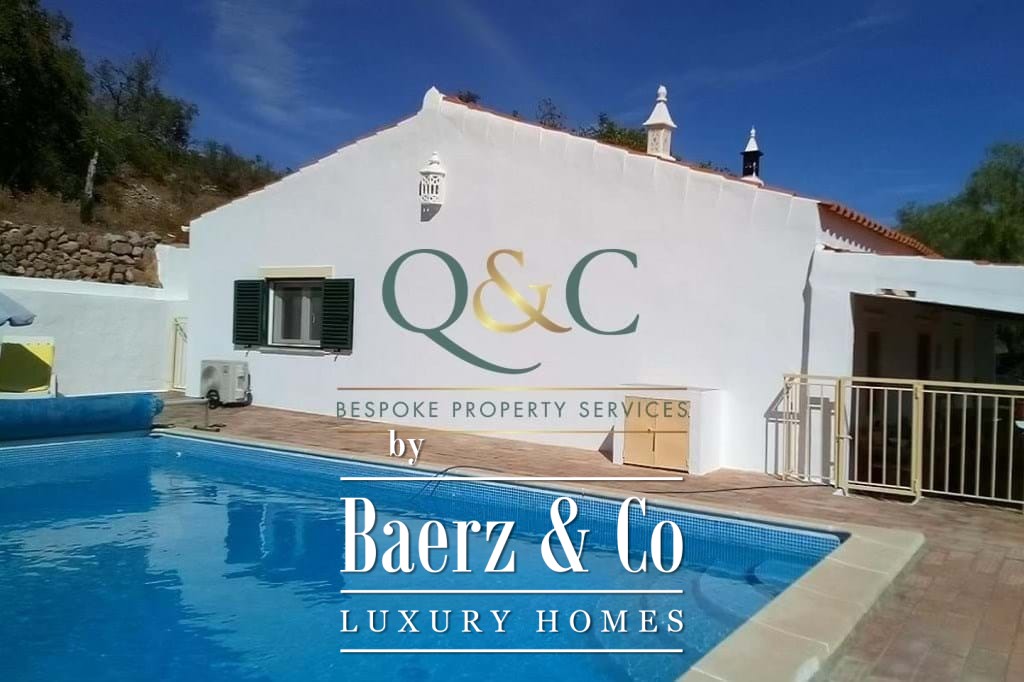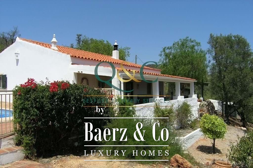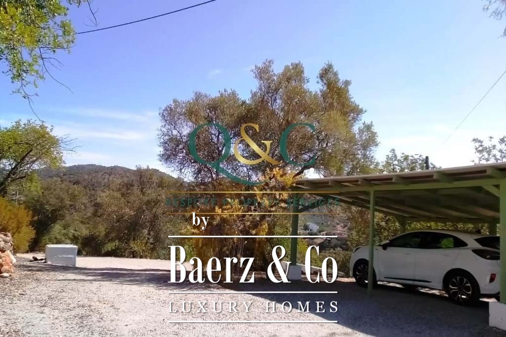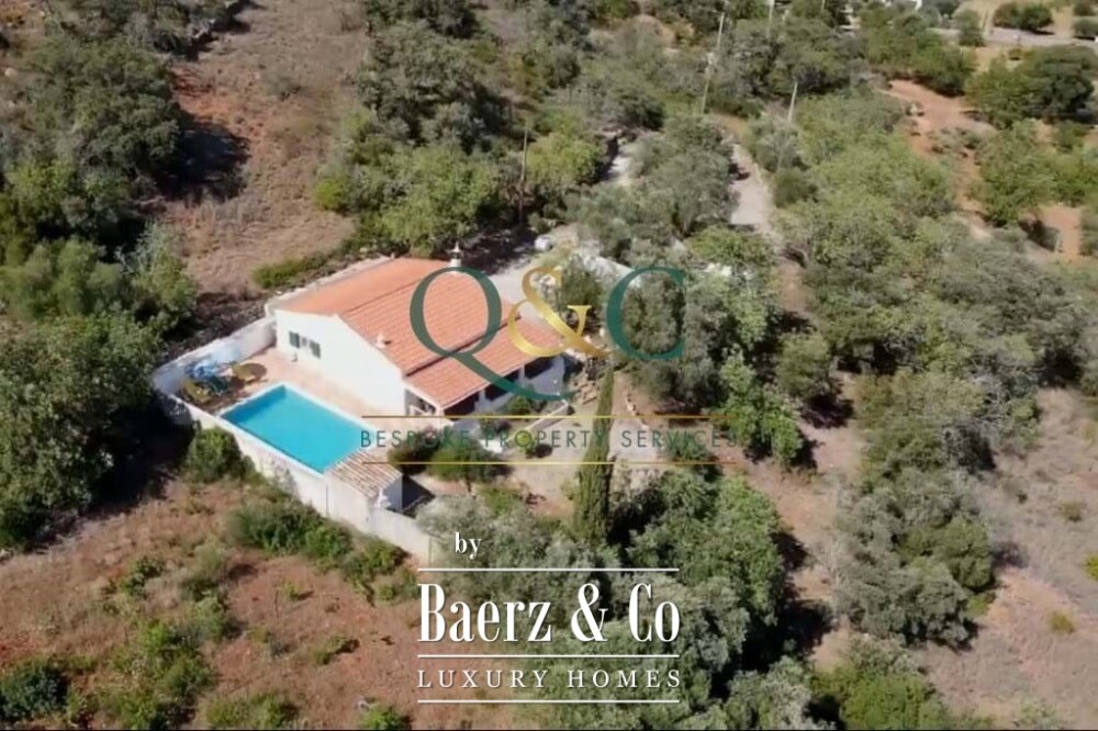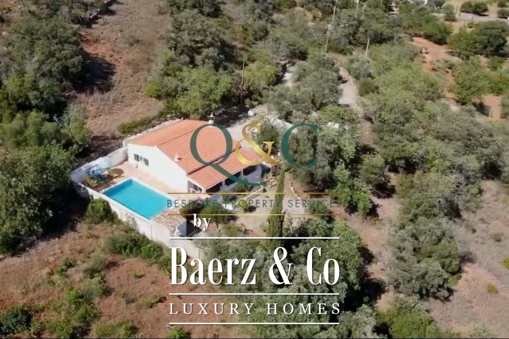 Outdoors, mature Holm oak, olive, and carob trees frame landscaped stone terraces, complemented by bougainvillea, oleanders, lantanas, and lemon trees. The 8m x 5m swimming pool, recently refurbished, is enhanced with a thermal cover for efficiency. A private drive leads to a carport with ample parking, with further potential on a lower terrace. The property benefits from borehole water, countryside and mountain views, and proximity to the Viceroy Ombria Algarve golf course, the coast, and Faro Airport, offering a peaceful yet connected lifestyle.