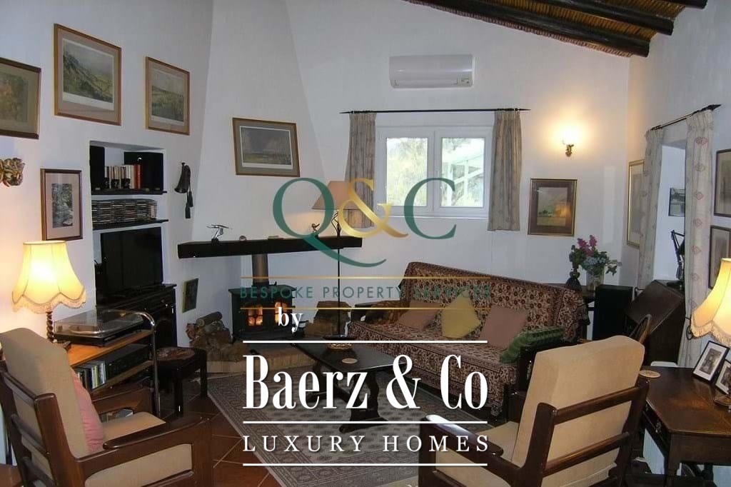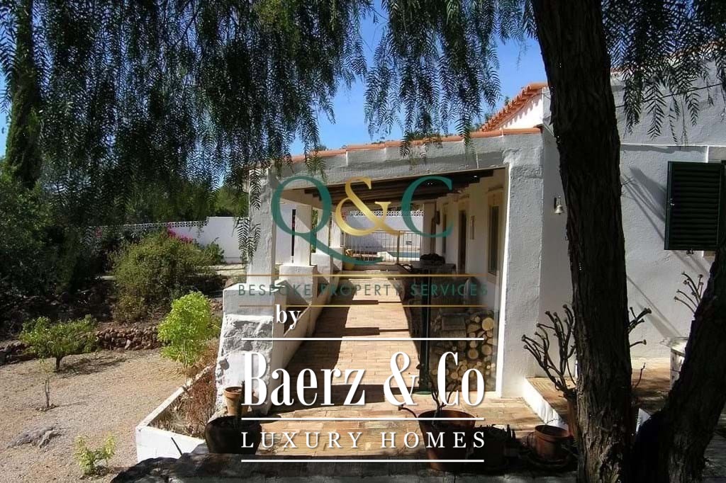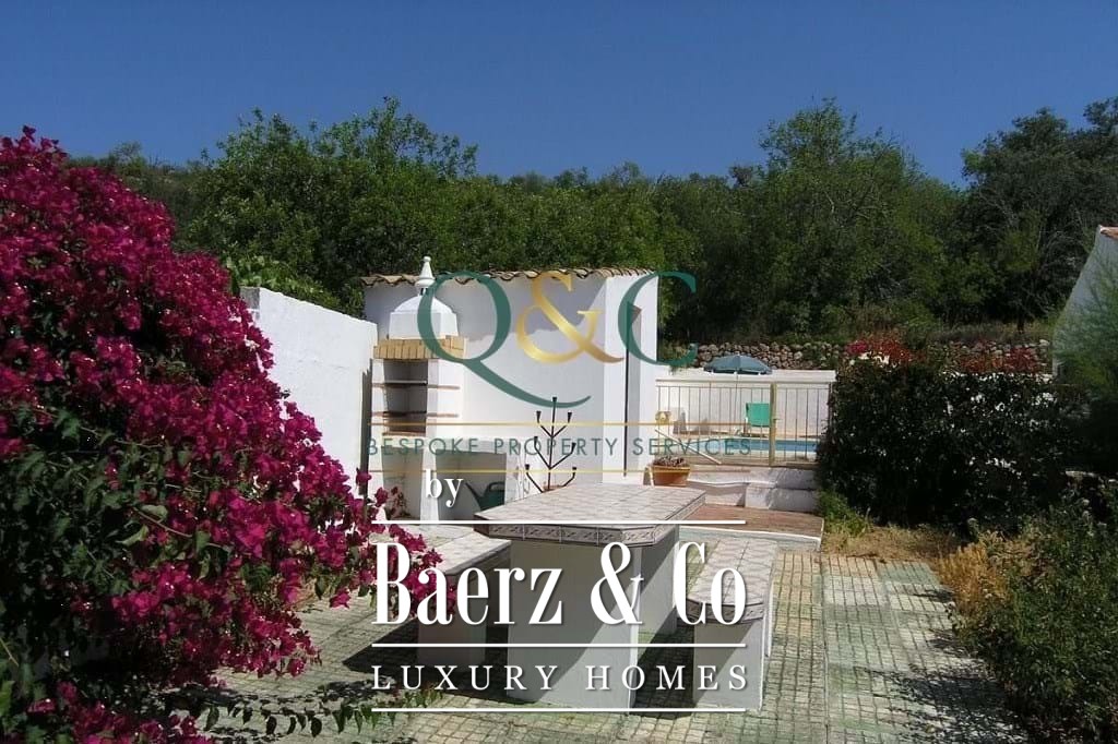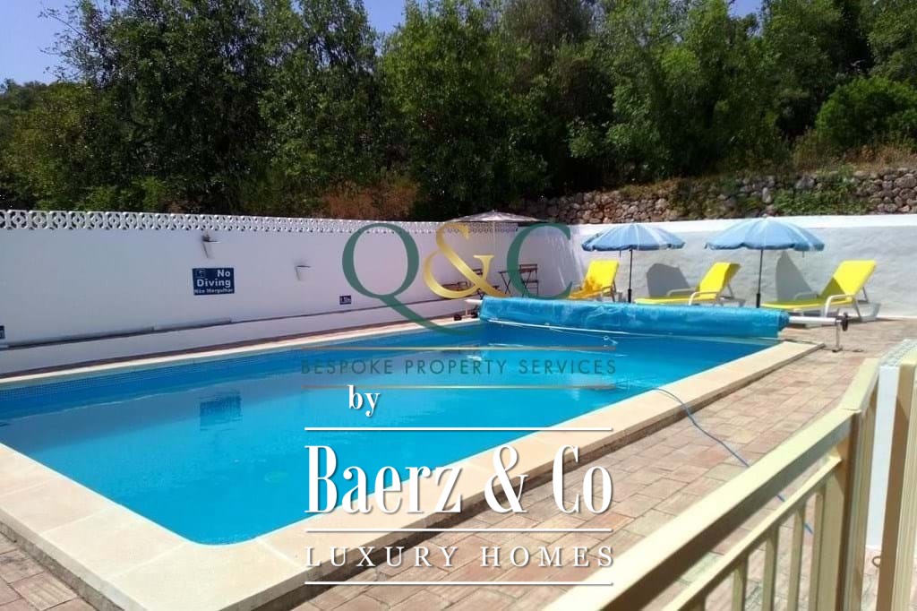Outdoors, mature Holm oak, olive, and carob trees frame landscaped stone terraces, complemented by bougainvillea, oleanders, lantanas, and lemon trees. The 8m x 5m swimming pool, recently refurbished, is enhanced with a thermal cover for efficiency. A private drive leads to a carport with ample parking, with further potential on a lower terrace. The property benefits from borehole water, countryside and mountain views, and proximity to the Viceroy Ombria Algarve golf course, the coast, and Faro Airport, offering a peaceful yet connected lifestyle.