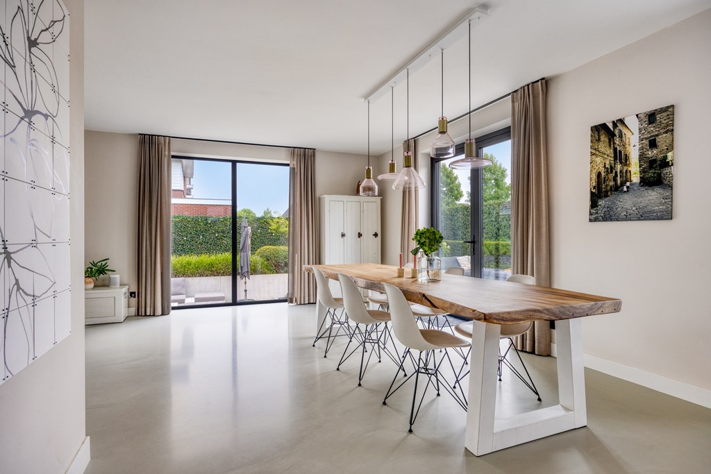 Deze moderne leefkeuken vormt het kloppend hart van de woning. Dankzij het lange aanrechtblad en het kookeiland is koken hier een waar genoegen. De keuken is volledig uitgerust met een inductiekookplaat inclusief geïntegreerde afzuiging, een oven, een vaatwasmachine, een ruime koelkast, een aparte vriezer en een spoelbak. De hoogwaardige afwerking, gecombineerd met praktische opbergruimte in lades en kastjes, geeft de keuken een luxe uitstraling.