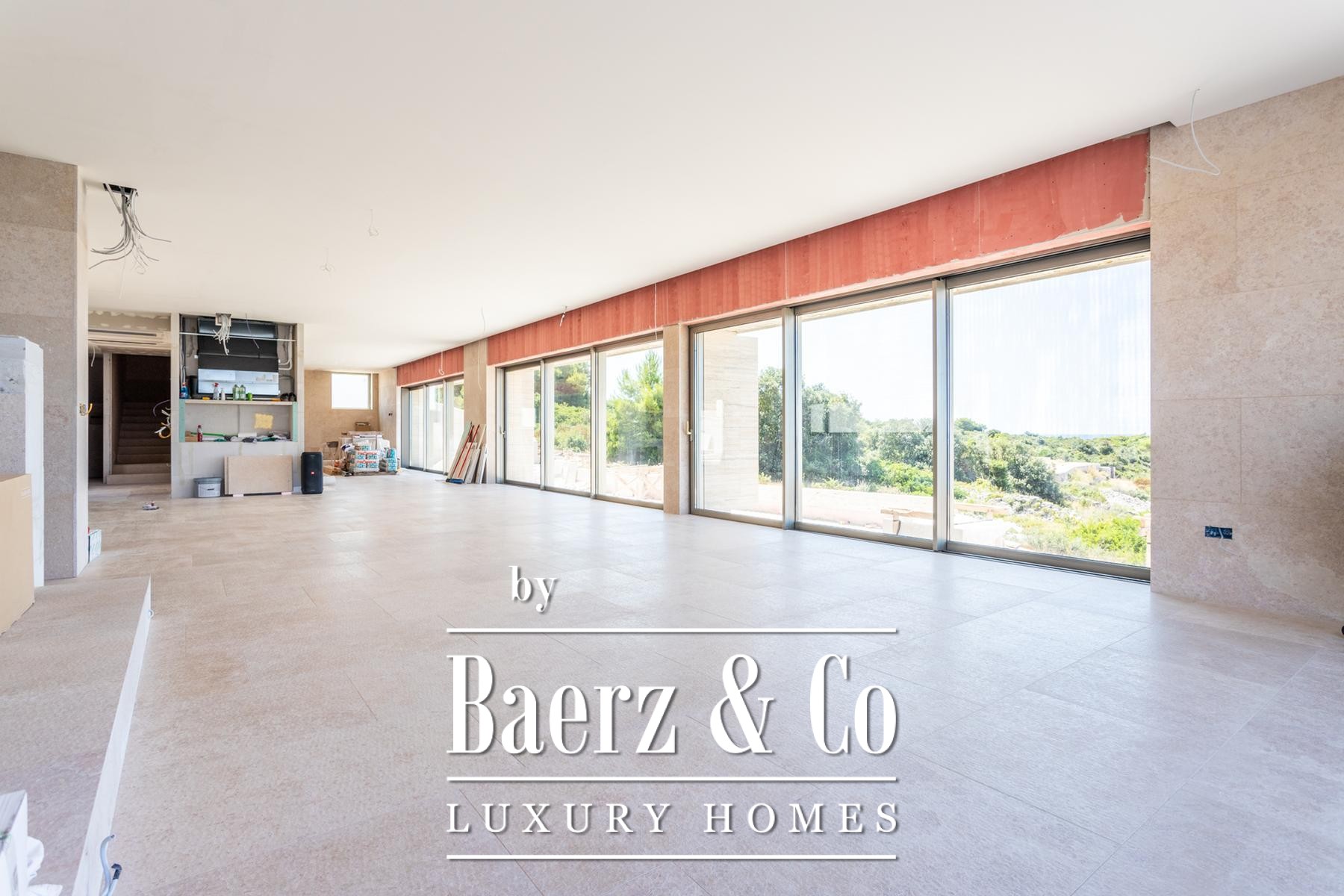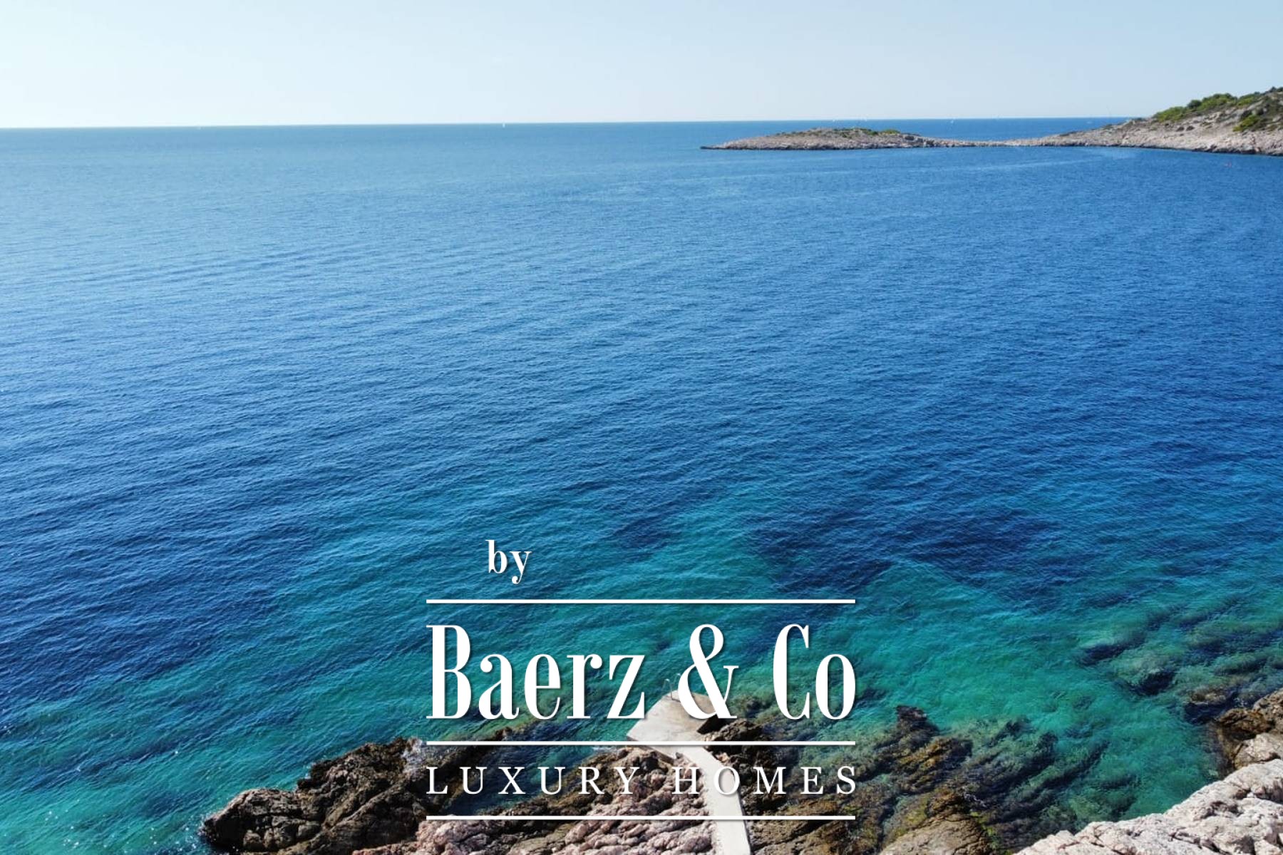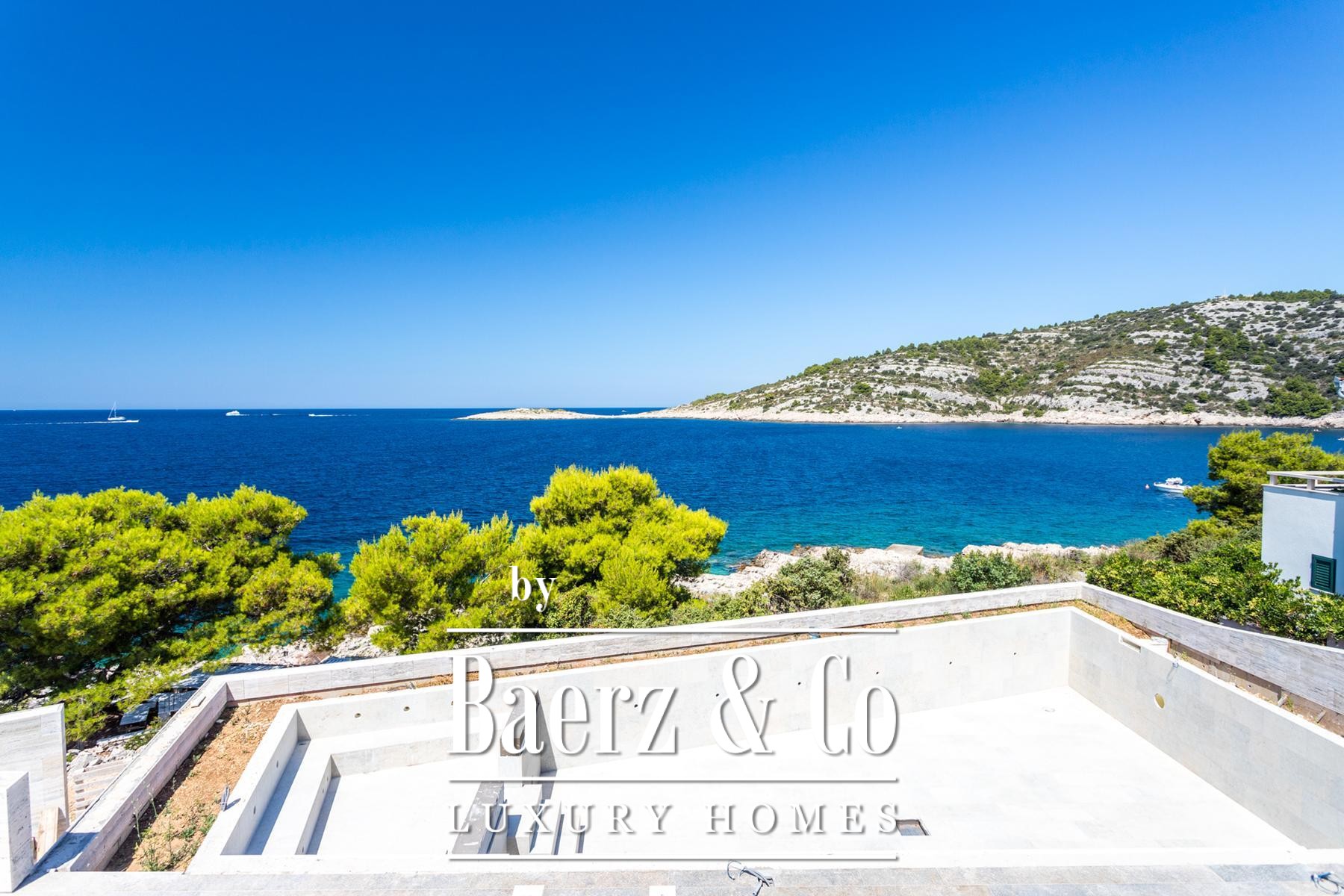 The ground floor welcomes with an expansive entrance, flowing through a bar, kitchen, dining and living spaces, with terraces opening directly to the sea. Upstairs, four bedrooms each feature a private bathroom and wardrobe, the principal suite extending to a terrace with open sea views. A walk-in wardrobe and laundry room add daily simplicity. The lower floor houses a tavern with kitchen, fitness and gym area with bathroom, and direct access to the outdoor domain—the 250 m² swimming pool with an integrated 75 m² pool forms a fluid horizon between residence and coastline.