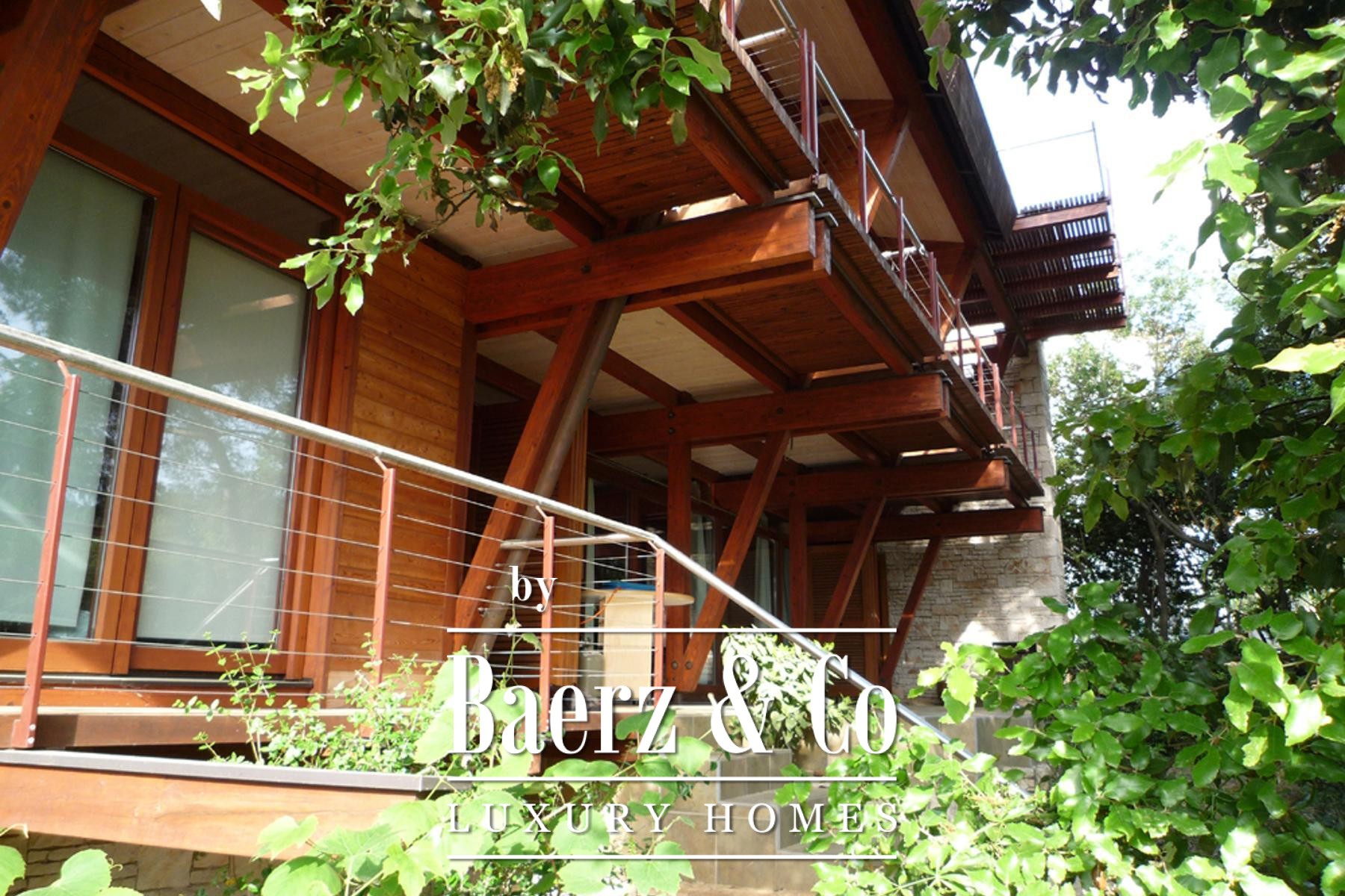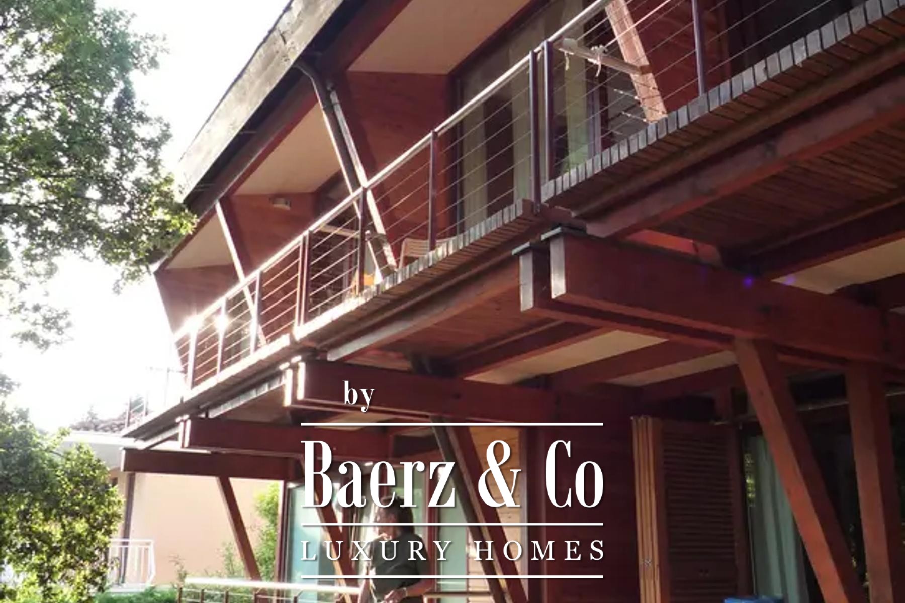 Upstairs, four tranquil bedrooms open onto balconies, with a gallery and shaded terrace connecting to a rooftop enclave for contemplative moments above the garden. The lower level hosts a summer kitchen framed in glass, and a wellness area with sauna, pools, and a landscaped terrace, while a cellar provides storage, central systems, and laundry.