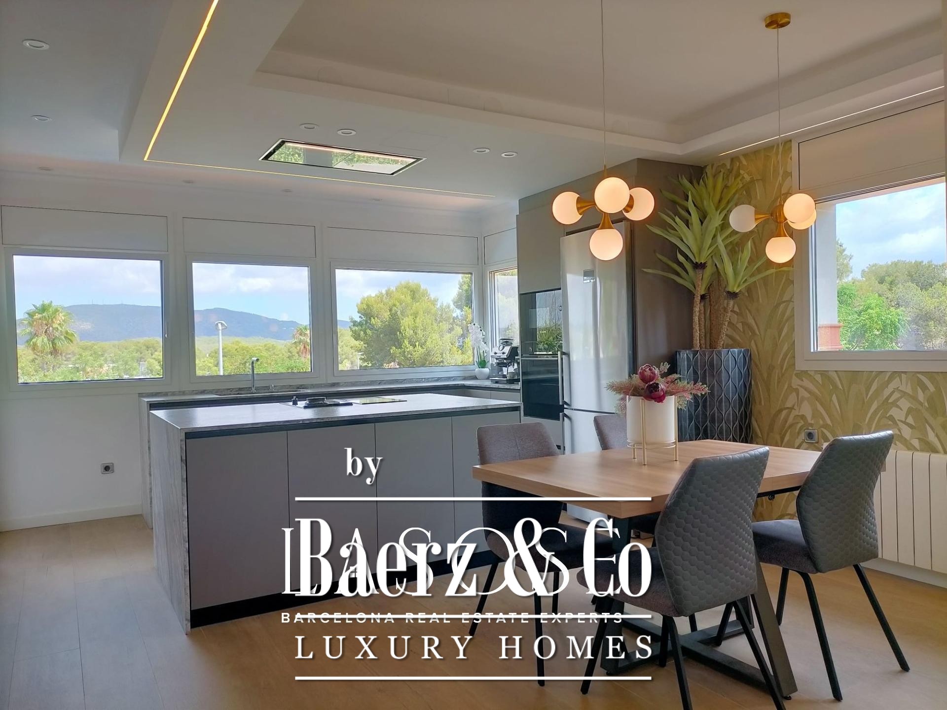Villa Sant Pere de Ribes is quietly positioned in the esteemed Els Cards residential area, set between Sitges and Sant Pere de Ribes, where privacy and panoramic views define every living moment. This five-bedroom, three-bathroom villa blends traditional Spanish architecture with contemporary refinement. Recently renovated interiors preserve authentic details such as arches and natural textures, while bringing in clean modern lines and warm tones. The open-plan main floor flows across kitchen, dining and living spaces, illuminated by abundant sunlight from windows on two sides. A statement fireplace centers the living area, offering an inviting gathering point year-round.